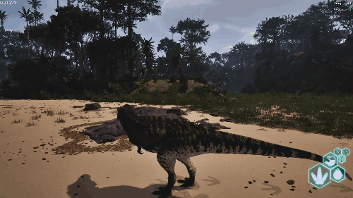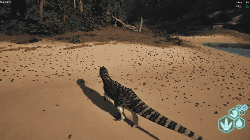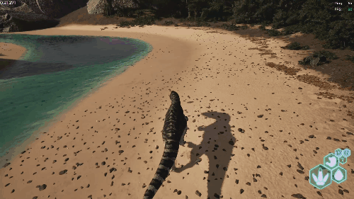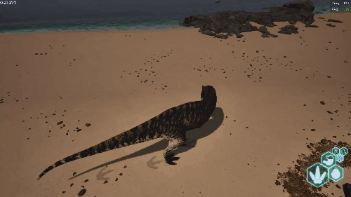 长按右键发动 长按可消耗耐力维持抓取状态。 可抓取自身体重一半以内的目标(若目标在水中,则可抓取体重四分之三以内的目标)。 效果倍率 CC上限(目标在陆地时):自身体重的50% CC上限(目标在水中时):自身体重的75% 伤害倍率:咬合力的0.7倍(70%) 【水中适应】 可在水中快速移动,氧气充足 可食用鱼类。生存提示 ・由于存在同类相食的情况,遭遇同类时相当危险 ・水分消耗非常快,离水边太远有脱水死亡的风险 ・幼体容易被大型鱼类捕食,需注意 ・小鱼腐烂后会变成营养品(约8~9分钟) 战斗提示 ・进入陆战状态时,利用Alt键咬击的判定范围优势进行战斗 ・抓住后立即松开并攻击,可造成近1000点伤害 赫雷拉龙/Herrerasaurus