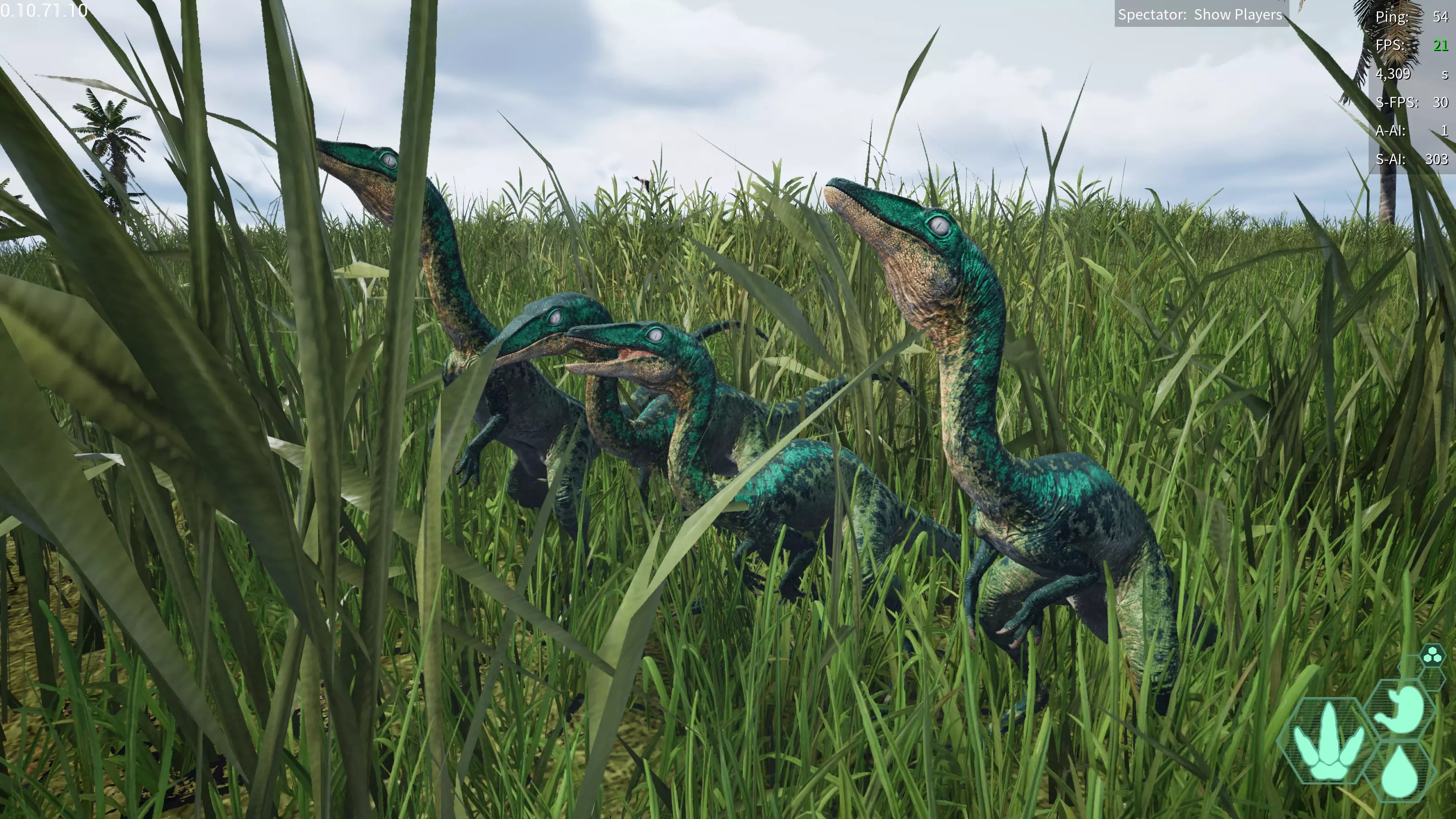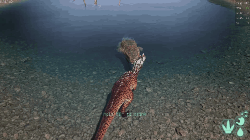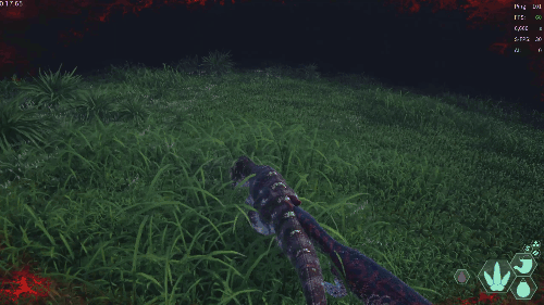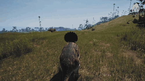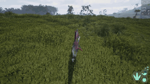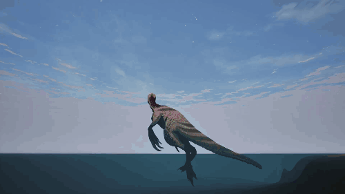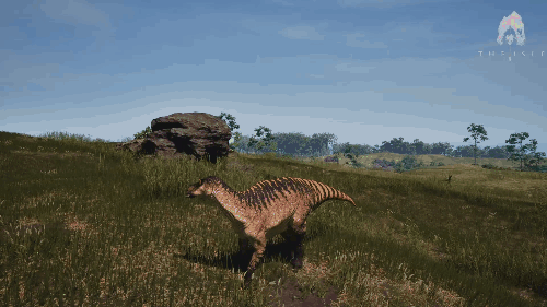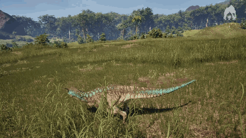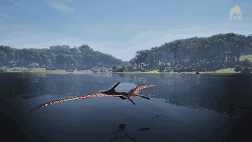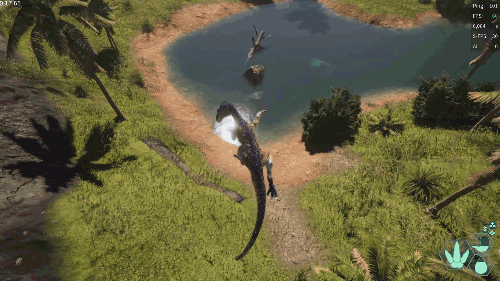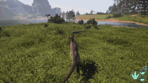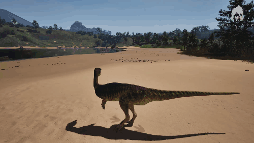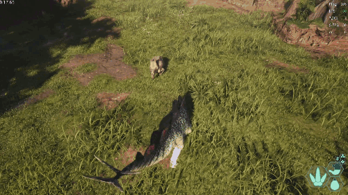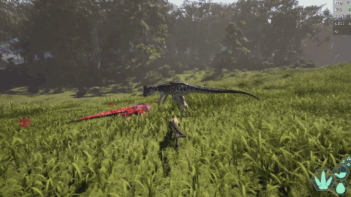 【发动方式】在游泳状态下朝着水面快速上浮即可发动 【效果】跃至水上并在4秒内提升移动速度 【生存提示】 - 氧气虽不算少,但无法长时间潜水,因此在水中久留存在危险 - 陆地上的移动速度并不快,所以离开水域存在危险 【战斗提示】 - 爪击造成的出血效果相当高 - 特殊攻击(Alt攻击)伤害较高,全力战斗的话甚至可以击败霸王龙和迅猛龙 加里米穆斯/Gallimimus