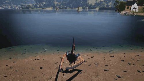 在水面临界高度时长按右键发动。 将嘴伸入水中飞行。 经过小鱼群附近时会出现提示,松开长按即可捕获鱼类。 生存提示 ・飞行速度较快且消耗大量耐力,因此耐力管理至关重要 ・飞行中撞上障碍物会坠落,请注意 ・长按Z键可切换至低速飞行(完全减速状态下松开长按Z键会坠落,请注意) 战斗提示 ・飞行时保持不会碰撞的高度进行攻击为宜 ・若坠落到陆地,需立即起飞,否则会被击杀 迅猛龙/【Troodon】
