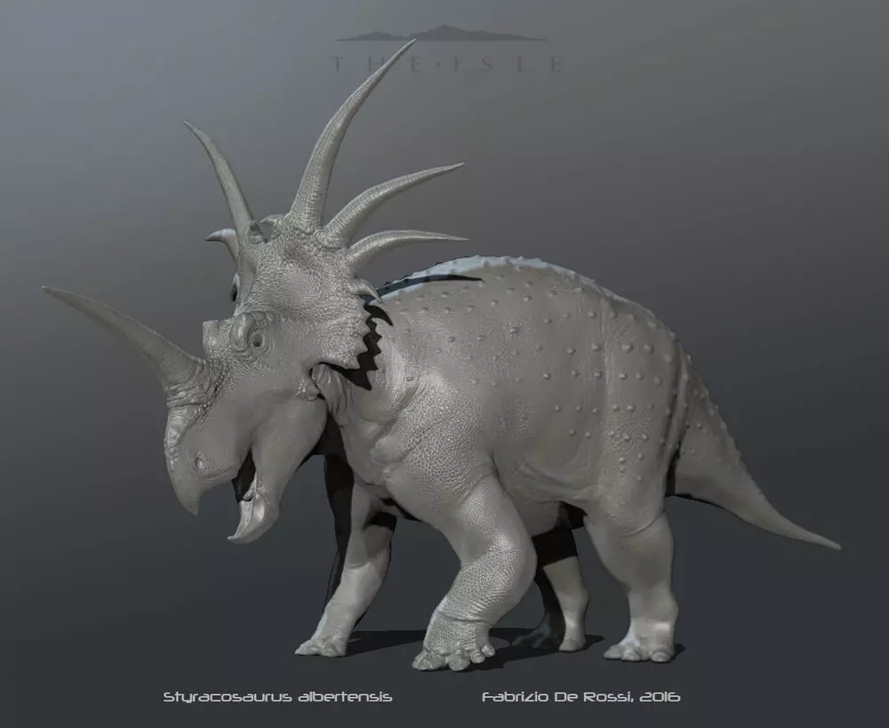 发布版本:更新10 分类:大型(可游玩) 养成难度:★★★★★ 战斗难度:★★★★★ 属性 体力:9400 普通攻击:700(骨折伤害:1500) Alt攻击:700(骨折伤害:1200) 冲撞:700(骨折伤害:3000) 压制:350/秒(骨折伤害:175) 头部挥击(短按):50 头部挥击(长按):400(骨折伤害:1200) Alt头部挥击:300(骨折伤害:650) 体重:9.4吨 步行速度:13.8千米/小时 疾跑速度:29千米/小时 伏击速度:34.8千米/小时 成长时间:10小时(成长为成体:营养素100%) 饥饿时间:2小时 脱水时间:2小时 转向性能:中等 游泳速度:15千米/小时5千米/小时 出血伤害:低 出血耐性:低 嗅觉范围:高 暗视范围:高 群体上限:2 营养素 α:野猪、剑龙、腱龙、帕克氏龙、螃蟹 β:鹿、鸡、恶魔角龙、三角龙、棱齿龙、兔子 γ:似鸡龙、鹦鹉嘴龙、慈母龙、橡树龙、山羊、双型齿翼龙、海龟 可从霸王龙处摄取的营养素→β 霸王龙的刷新地点↓