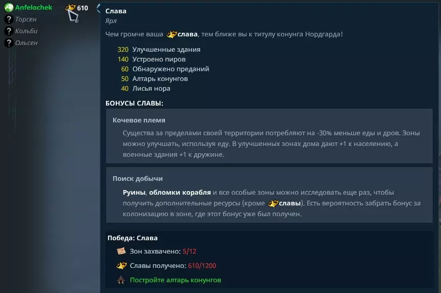 每个氏族都有胜利条件窗口和胜利进度条 在《北境之地》中存在5种(若有额外氏族则为7种)胜利方式: 【统治胜利】规则很简单,只需彻底摧毁敌方的市政厅。如果进行团队游戏,那么你们必须互相帮助、清理战场、举办盛宴并规划战斗行动,才能获得胜利。荣耀胜利条件:占领12个区域,获得1200点荣耀值,建造【国王祭坛】。在和平胜利条件中,荣耀胜利与军事胜利最为接近。战争和扩张能带来大量荣耀值。此外,还需要拥有12个区域,若有人试图阻碍,你将不得不为此开战。与其他和平胜利条件相比,拥有强大的经济后,可以发起决定性的最终冲刺。智慧胜利条件:获得神明的祝福,即先祖知识,建造【神明纪念碑】,积累足够的传说。建筑越靠近岛屿中心,对其他氏族的影响力提升越快,氏族的传说产出将用于纪念碑。若想通过智慧胜利,需依赖随机运气,因为需要大量传说。这类游戏中最危险的是极具攻击性的敌人,某个攻击者可能会占领你的关键地点,从而导致你失败。 贸易胜利条件:与米克拉加德达到50%声望,建造灯塔。与智慧胜利不同,它不太依赖地图生成。是最容易达成的胜利方式。在游戏中,为了达成这一胜利条件,你需要时刻拥有活跃的商队或船员。而在其他时间,则要合理调整经济,确保居民们能够吃饱,并且储备足够的木材以度过寒冬。 地图特色: 1. 通常需要占领中心区域并进行长时间防御。 2. 希尔海姆:需要占领传送门并坚守一整年。每月会有两次从传送门中出现一对女武神。圣剑奥丁:占领岩浆格子并建造铁匠铺。圣剑由三部分组成,每部分需要15单位铁。整个过程大约需要一年。 征服胜利:消耗2000食物占领区域,等待一年即可获胜。 维维恩娜:占领此格子并不能保证胜利。击杀维维恩娜只会提供声望胜利加成(+250)。合理操作的情况下,你不会失去你的同伴。以下是我记得的一些特色玩法,大家可以在评论区补充其他内容,之后我会添加到列表中。 氏族特色玩法:这是特定氏族的胜利途径,例如: 【乌鸦氏族 - 解放世界】:需要召唤“世界守护者”,吞噬一定数量的敌方领土,同时在传说中解锁“世界树之心”。松鼠氏族 - 瓦尔哈拉盛宴:需要准备1000份食材,安排8名活跃厨师,并等待一年时间来完成盛宴。