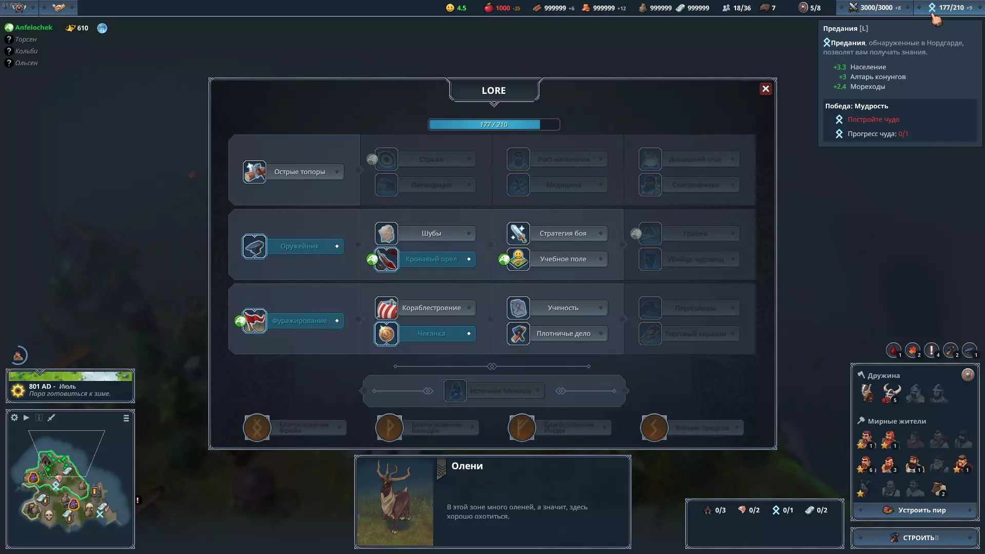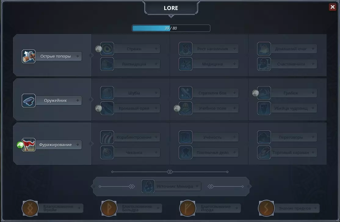 Технологическое древо Клана Орёл Технологическое древо у каждого клана на 85% состоит из общих технологий и лишь малая часть является уникальными. В игре названий у веток преданий нет, поэтому, условно, называют верхнюю - гражданской, посередине - военной, а нижнюю - торговой. Повторение, какие технологии вам открывать в первом году и в дальнейшем - зависит от вашего клана, вашего развития и вашего расположения, выбирайте грамотно, что вам нужно именно сейчас, для быстрого старта. Как пережить зиму Первый год - самый тяжёлый, ведь вам нужно много внимания уделить своей экономике, зачистить локации вокруг себя, чтобы зимой нейтралы не душили, в общем, дел куча. Поэтому, фокусируйтесь первый год на добыче еды и дерева и в конце ноября, где-то в середине, отправляйте своих жителей на добычу железа и камня, которое вам в дальнейшем понадобится. Простые жители и так производят зимой мало пиши, пусть хоть чем-то полезным займутся. Не бойтесь, если еда и дерево пойдёт в минус, без лишних жертв и риска - увы никак. На втором году вам уже будет намного легче и проще и возможно, вы сможете добывать камень и железо зимой, не уходя в минус при этом. Общие советы по развитию любого Клана в ранней игре В Northgard используется генератор карт, поэтому при развитии поселения придется подстраиваться под условия местности. Поэтому в первую очередь стоит разведать прилегающую к базе территорию. Сразу после старта строим лагерь разведчиков и дом, чтобы избежать ситуации, когда есть ресурсы, а людей нет. Как только построился лагерь направляем туда двух крестьян. Не бойтесь небольшого минуса по еде, как только достроится дом, все нормализуется. Сразу скажу, строить лесопилку на мейне(на зоне, где находится Ратуша) - ну это нубская тема. Вероятно, что на незанятой рядом клетке окажется лес, который дает +10% к производству древесины. Если такой радости его величество рандом вам не послал, тогда все равно лучше строить лесопилку не на Ратуше. В идеале, на мейне нужно поставить пивоварню и пристань драккаров. Если леса нет, тогда первым делом лучше занимать клетки без ресурсов с лимитом зданий 4 или с руинами, особенно привлекательны в начале места кораблекрушений. Торопиться захватывать и обрабатывать локации с ресурсами еды не стоит. Одного из разведчиков можно возвращать на поля сразу после того, как разведаны три-четыре незанятые клетки возле мейна. После того как второй разведчик исследует пару клеток от ваших границ и найдет железо, можно возвращать к тяжелой работе и его. После лесопилки лично я первых делом ставлю учебные лагеря. Обычно незанятые клетки малопривлекательные и руины или места с добычей еды приходиться отбивать. К концу лета придется ставить второй дом, ибо лимит жителей уже на подходе и в этот промежуток удастся поставить лишь одно задние. Ближе к зиме нужно построить пристань (или пойти в торговлю), так как прирост золота к этому времени уже начинает уходить в минус. Итоги к первой зиме Что-же нужно построить к первой зиме?Сразу лагерь разведчиков и дом Лесопилку (желательно на соседней ячейке) Учебные лагеря для отбивания зон с пищей Второй дом и какое-нибудь здание на еду (ферму, лагерь охотников, рыбацкую хижину и по возможности на эти места построить склад) Ближе к зиме пристань драккаров (решит проблему с золотом и даст прирост науки) и возможн