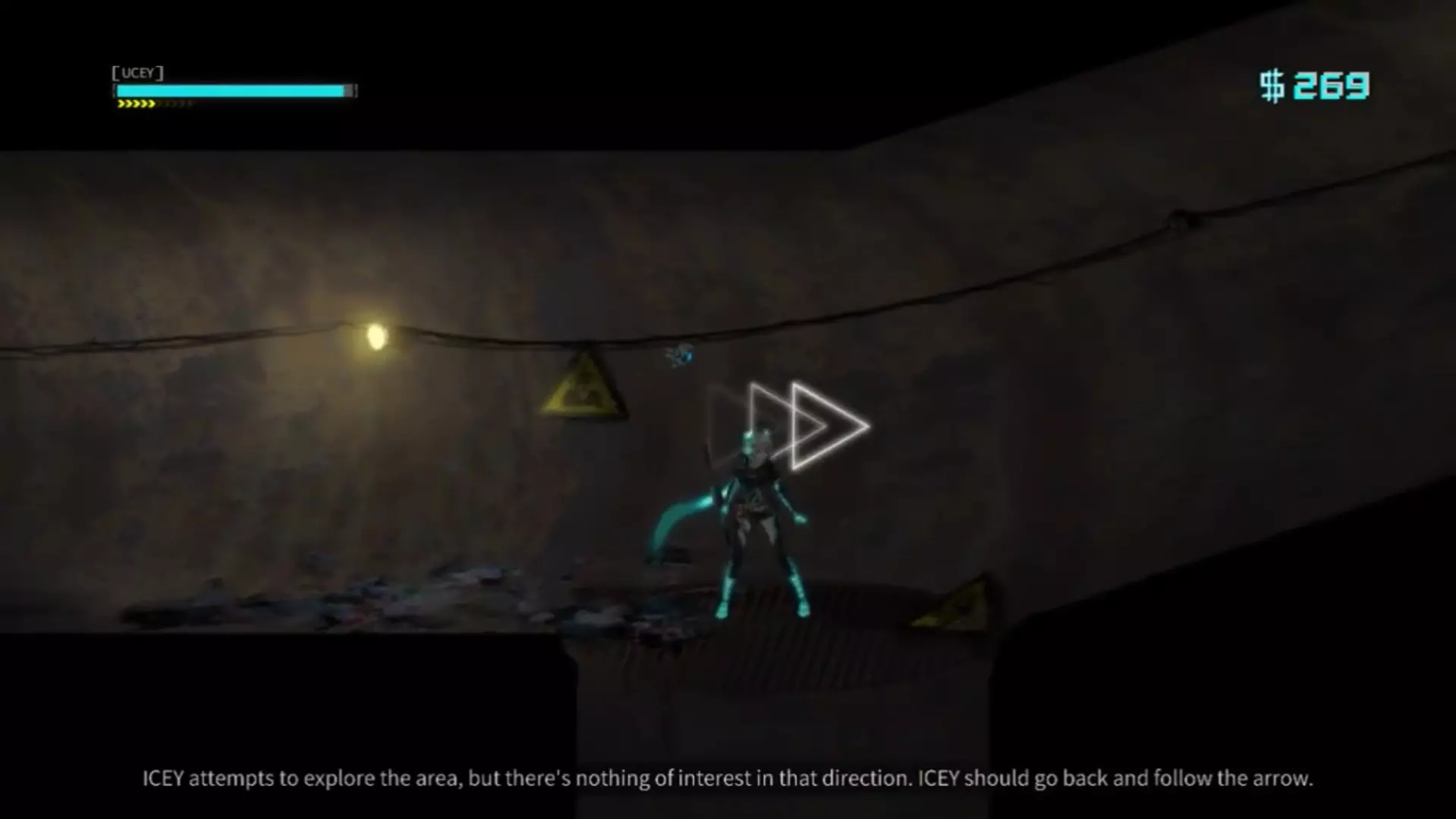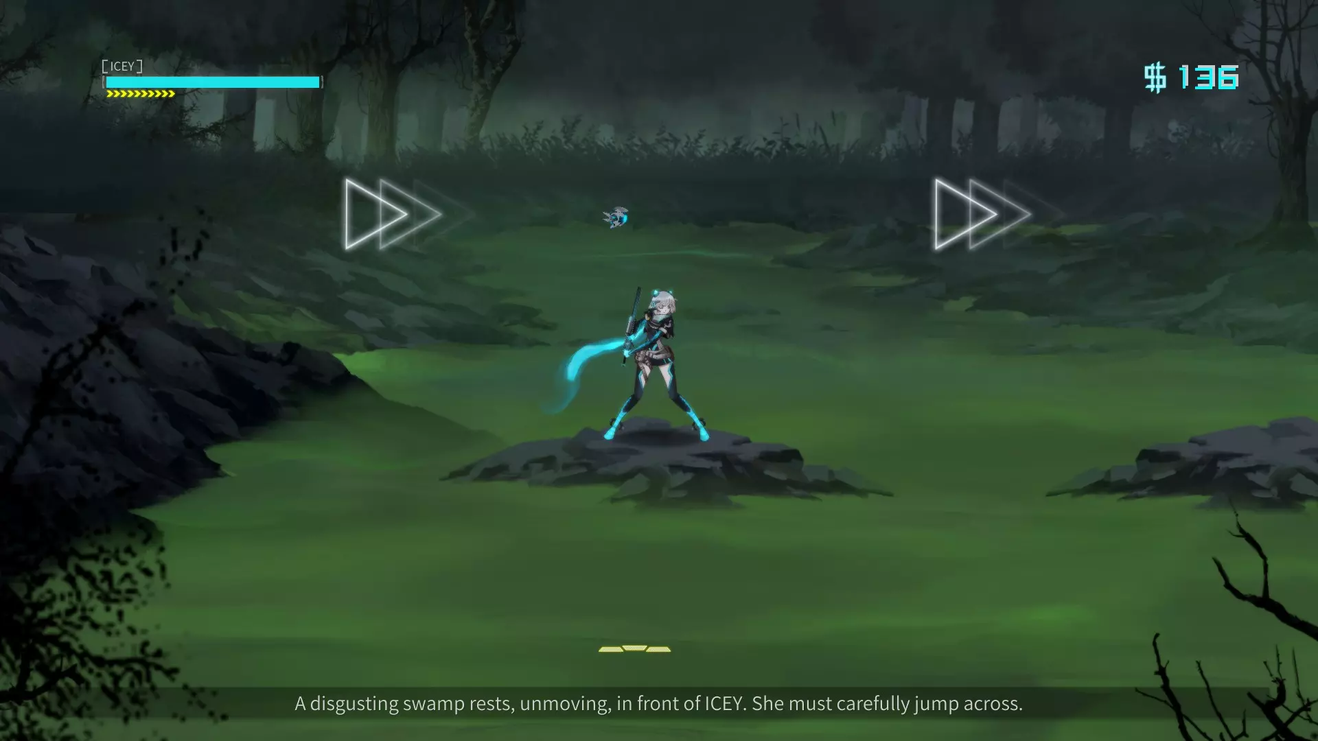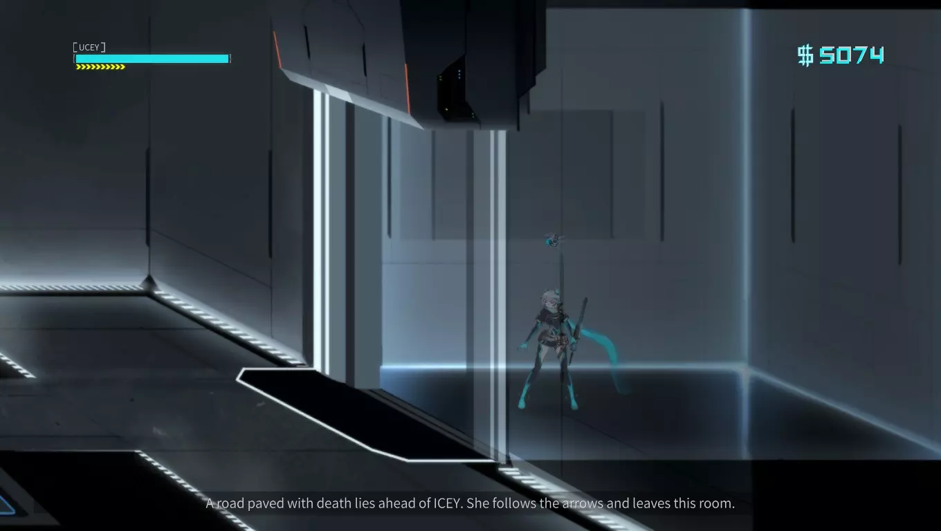 在“额外区域”中持续尝试向左走。当我们完成“Pitfalls”关卡的三次跳跃后,再向下跳一次,然后打开出现的箱子,接着一直向左走(不用理会旁白),直到到达房间。