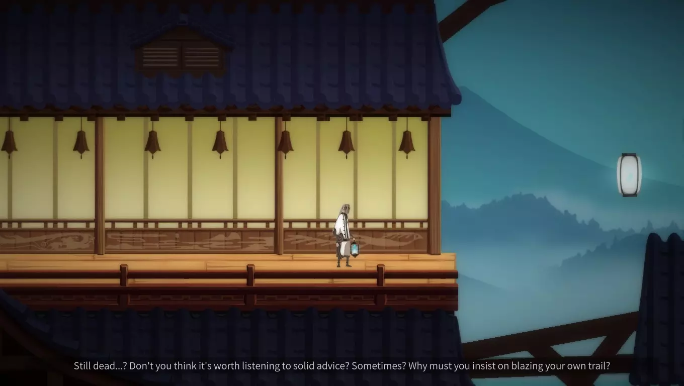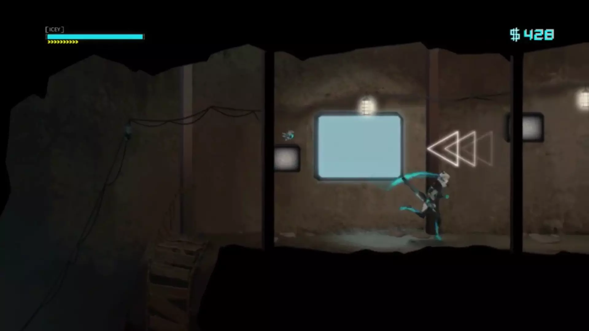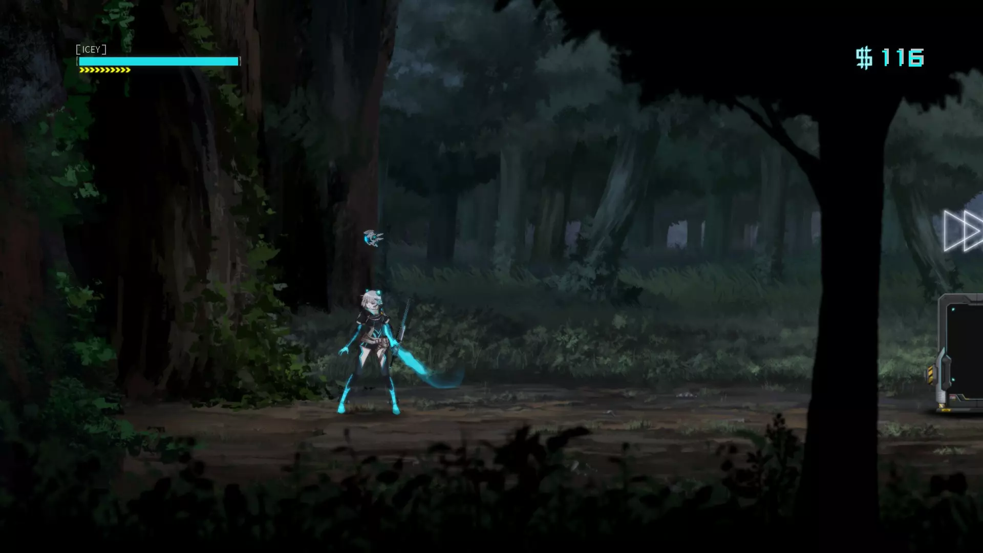 在“额外区域”中持续尝试向左走。当我们完成“Pitfalls”关卡的三次跳跃后,再向下跳一次,然后打开出现的箱子,接着一直向左走(不用理会旁白),直到到达房间。