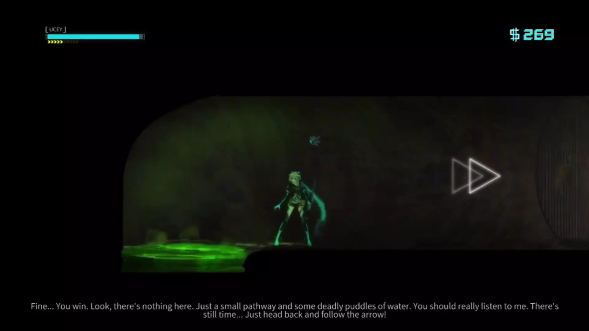 进入关卡【Shio】 当我们看到下图中的管道时,持续向下冲刺,直到旁白提示下方只有危险的绿色液体且禁止下去,但我们不要听从,直接跳下去。