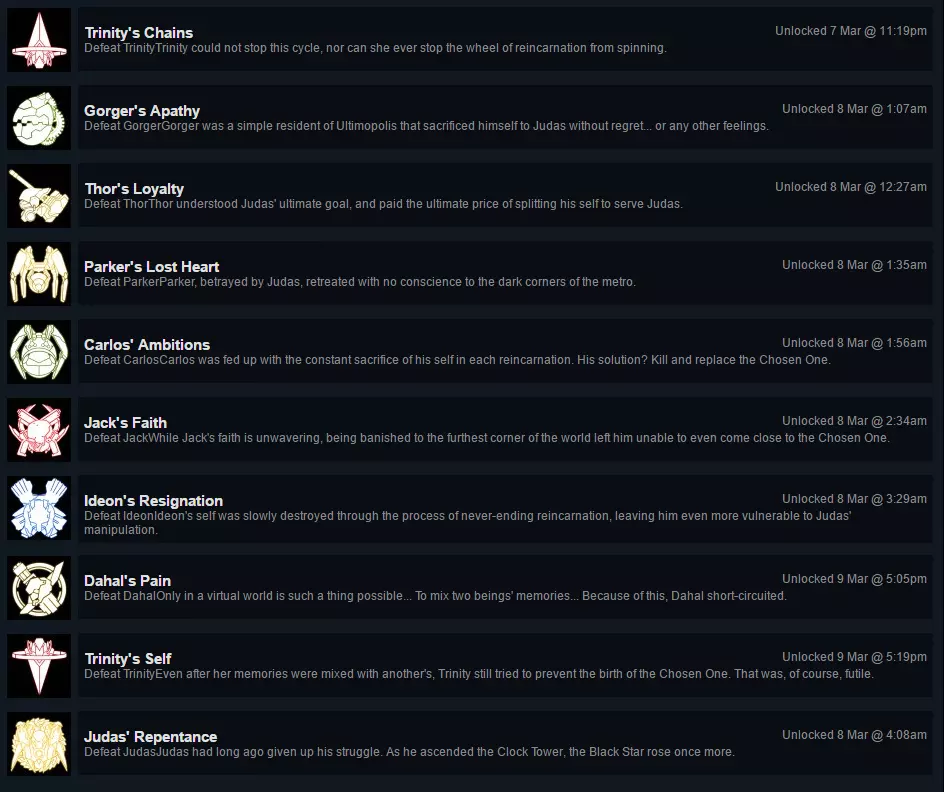 与旁白一同进入真正的“游戏” 这将在真正开始《艾希》游戏后(教程结束后)解锁 剩余的成就 剩余的成就就是击败各个 Boss 来获取