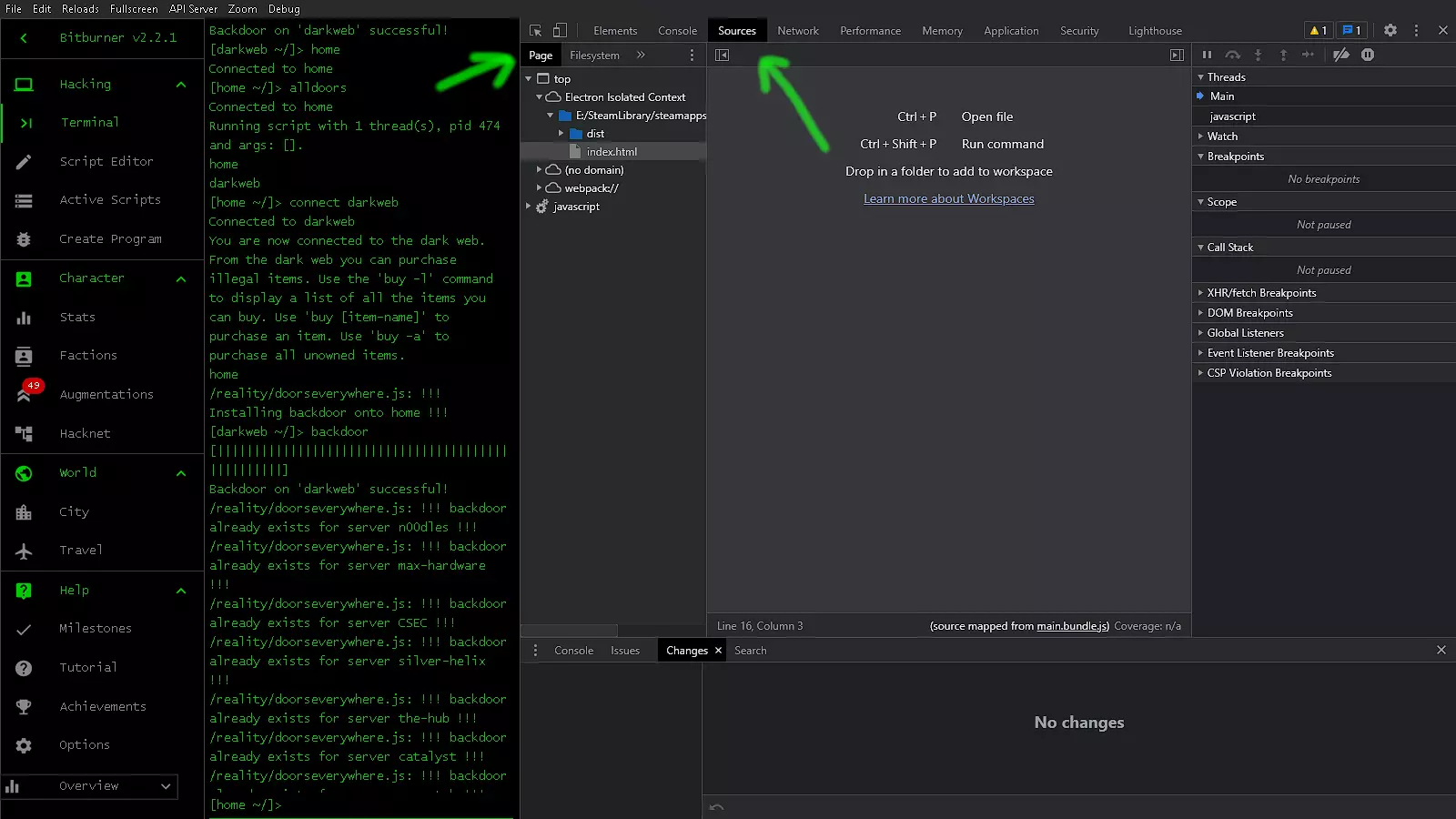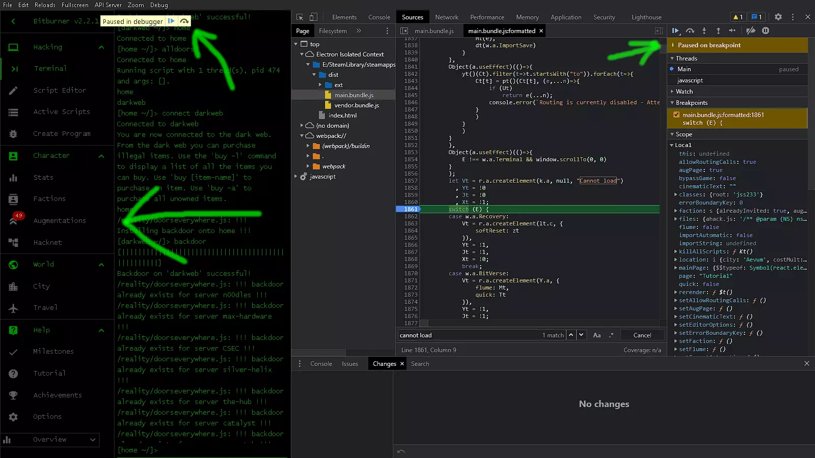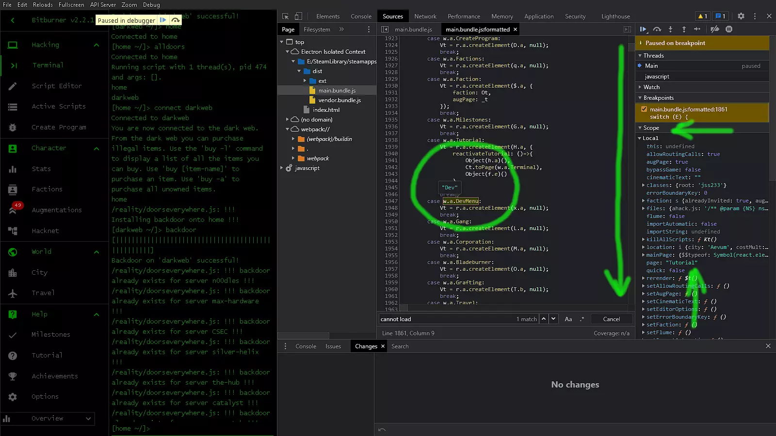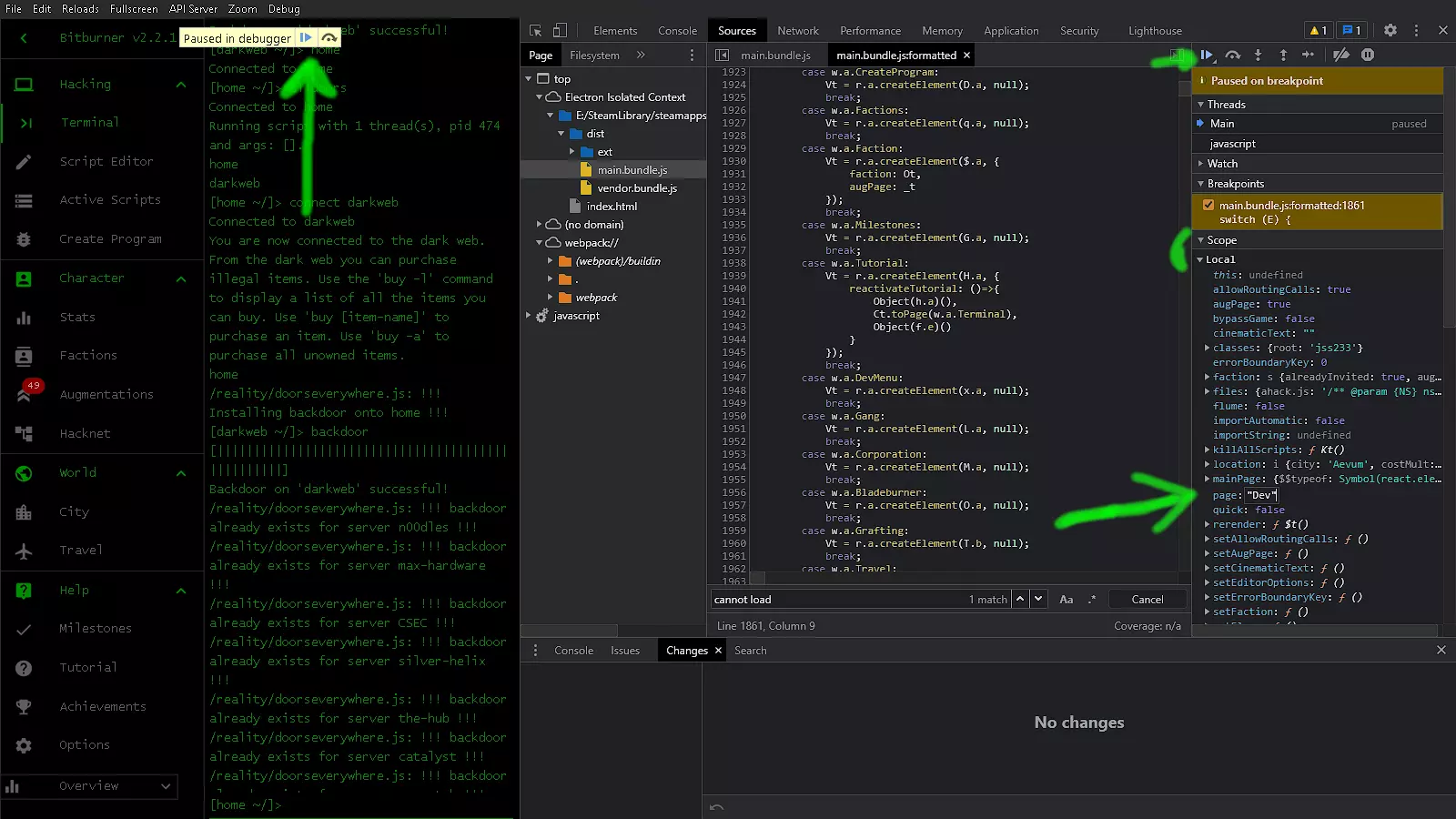 我们将把新获得的知识应用到【Scope】查看器中。在【Local】下应该有一个【page:】项,它显示了我们点击进入的菜单项。我们要将其更改为导航至【Dev】页面。 更改该值后,我们将通过点击播放按钮取消暂停游戏。现在我们也可以关闭调试器。我们的更改不会被保存,除非回到【Pretty-print】,否则游戏不应再次暂停。