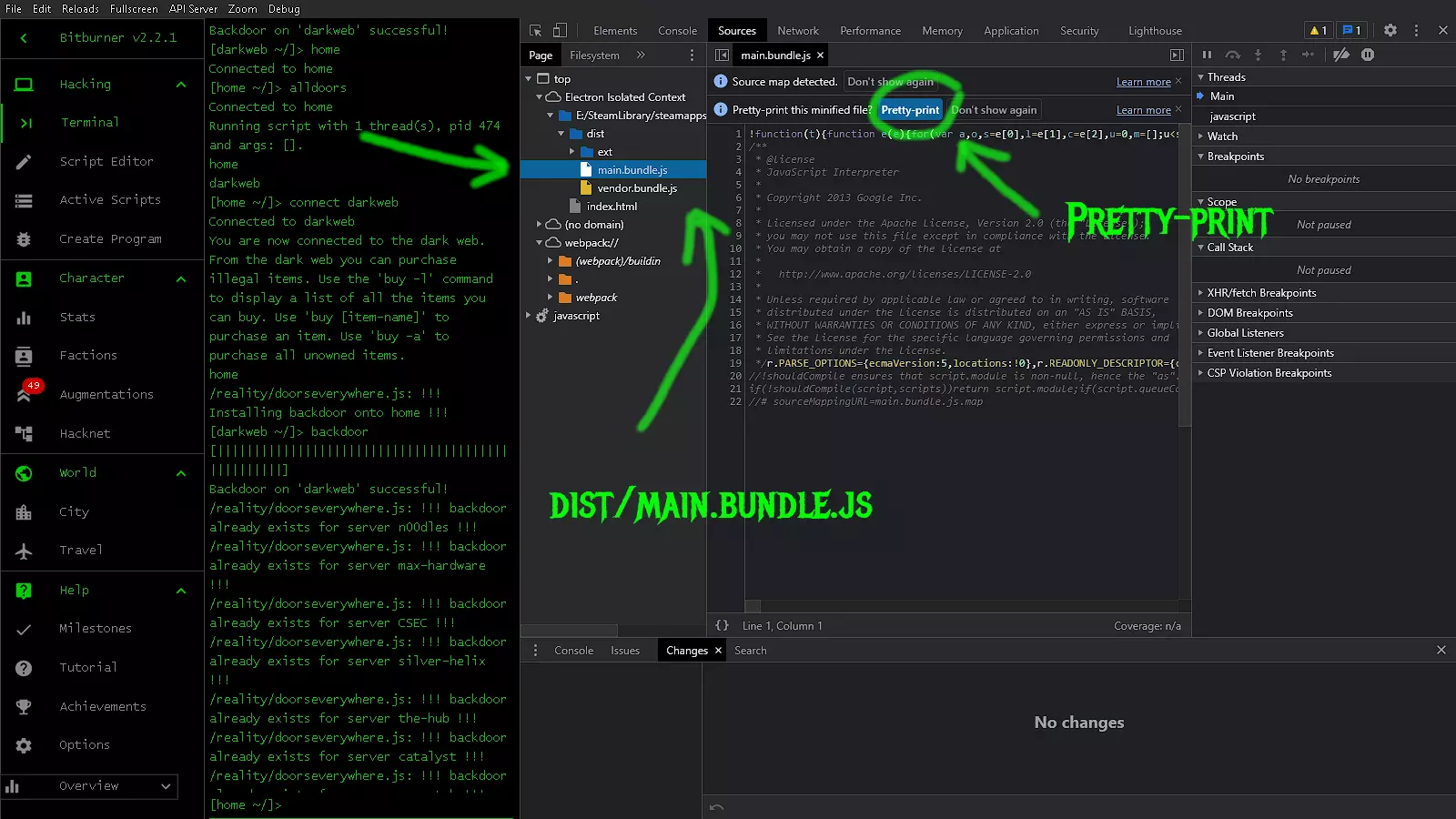现在,我们需要找到“dist”文件夹,里面应该有“main.bundle.js”文件。你需要点击它来打开。我们还要点击蓝色的“格式化”按钮,以便更容易搜索和查看我们需要的内容。 就像这样...