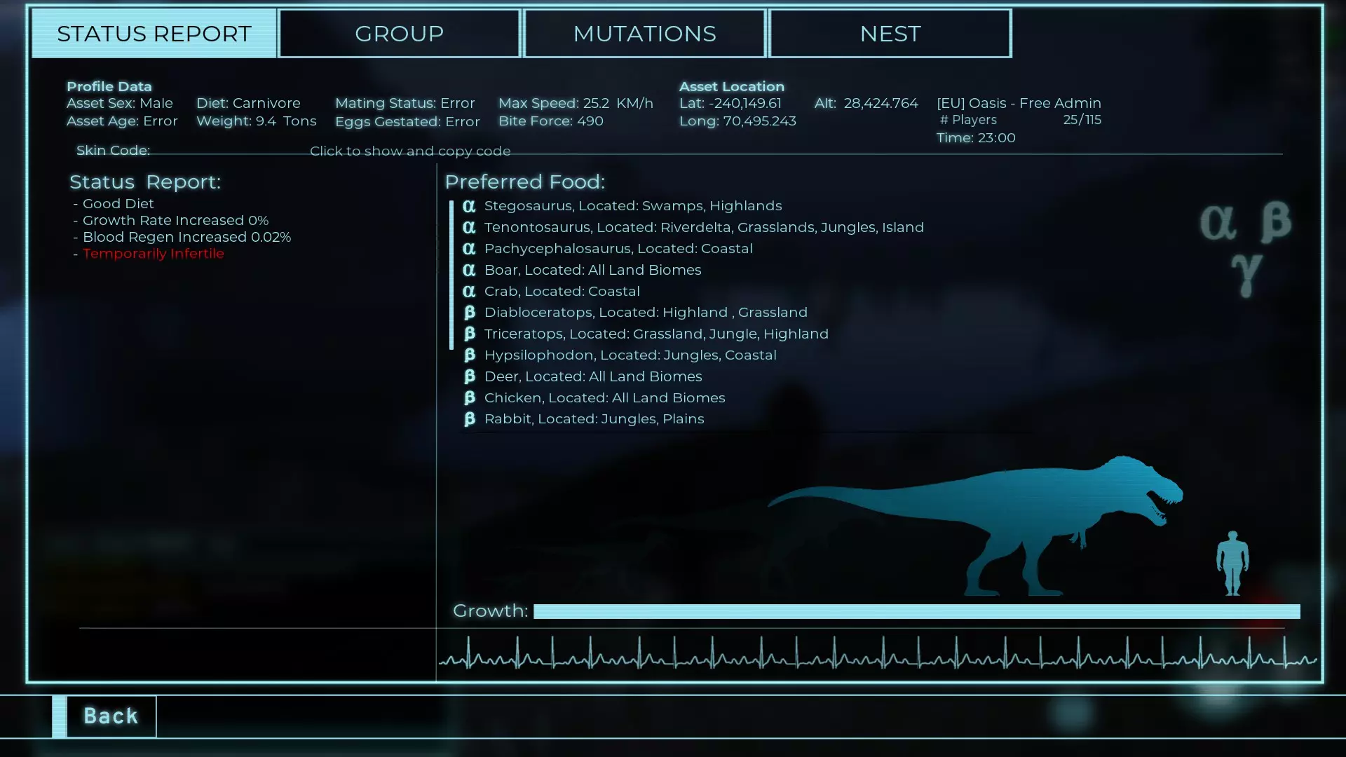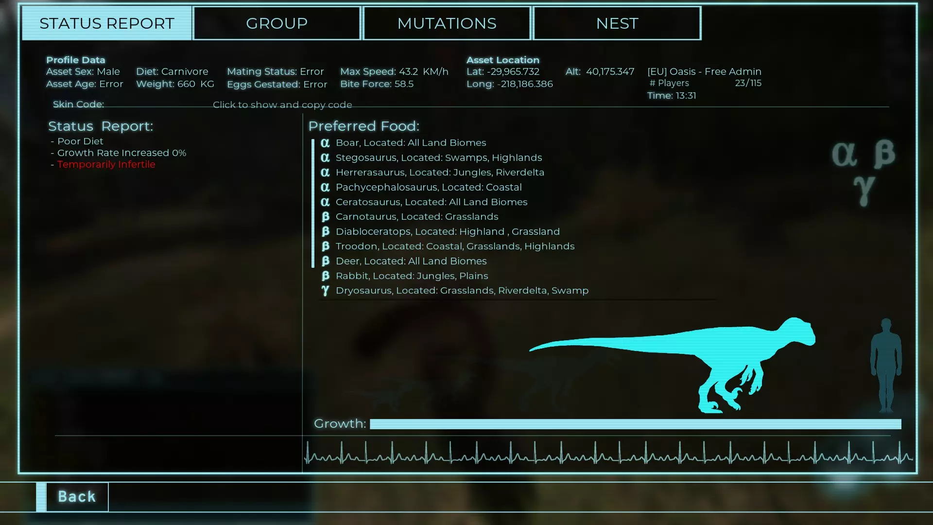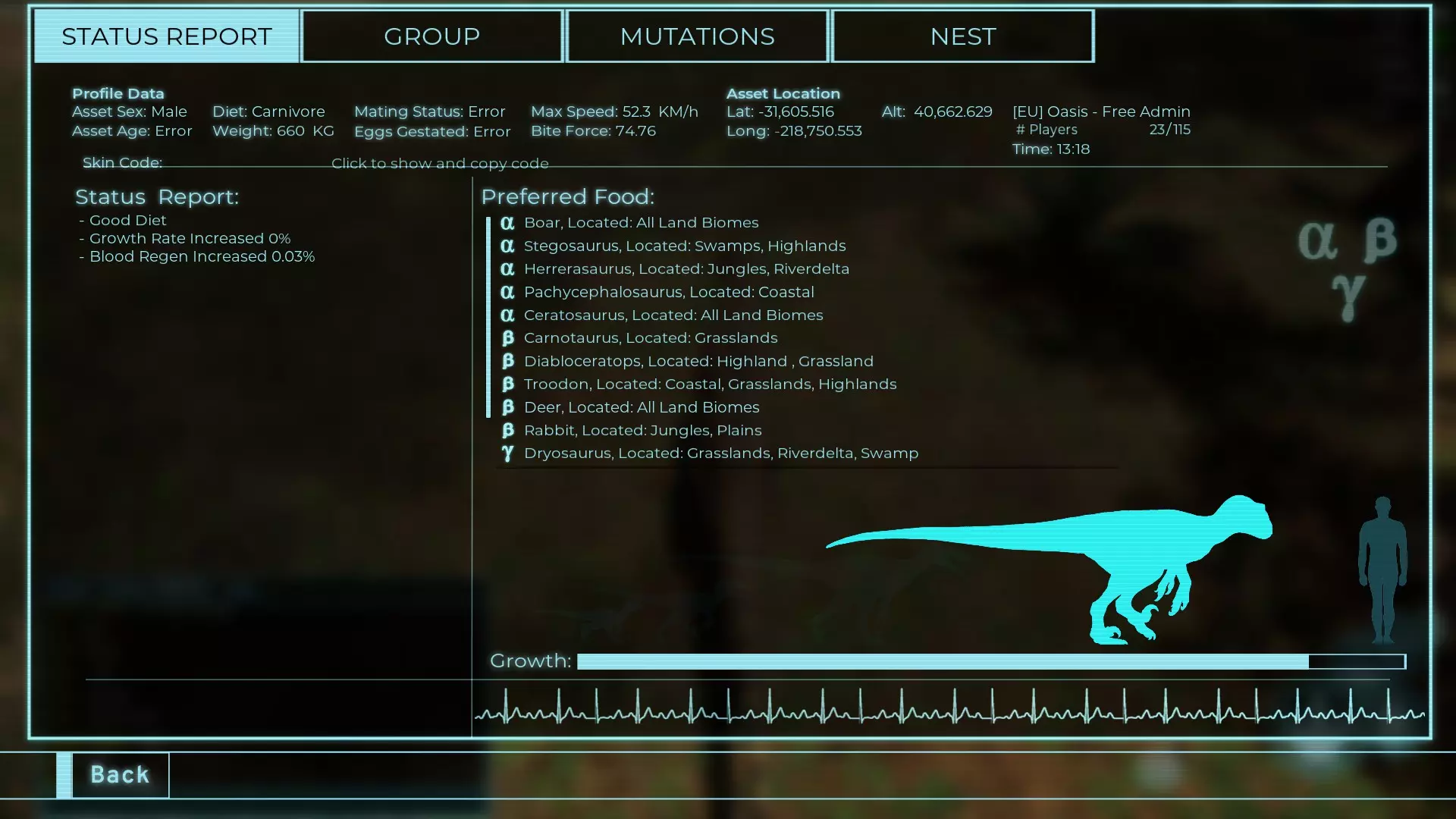 体力:23 攻击力:2.3 致盲:1.1 步行速度:12.6km/h 疾跑速度:39.2km/h 体重:23 【衰退期(100%)】