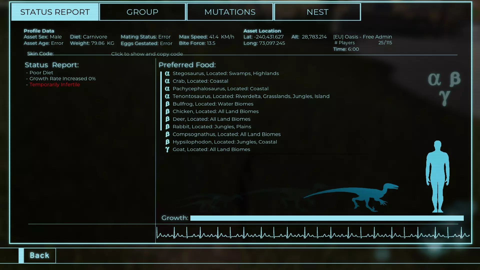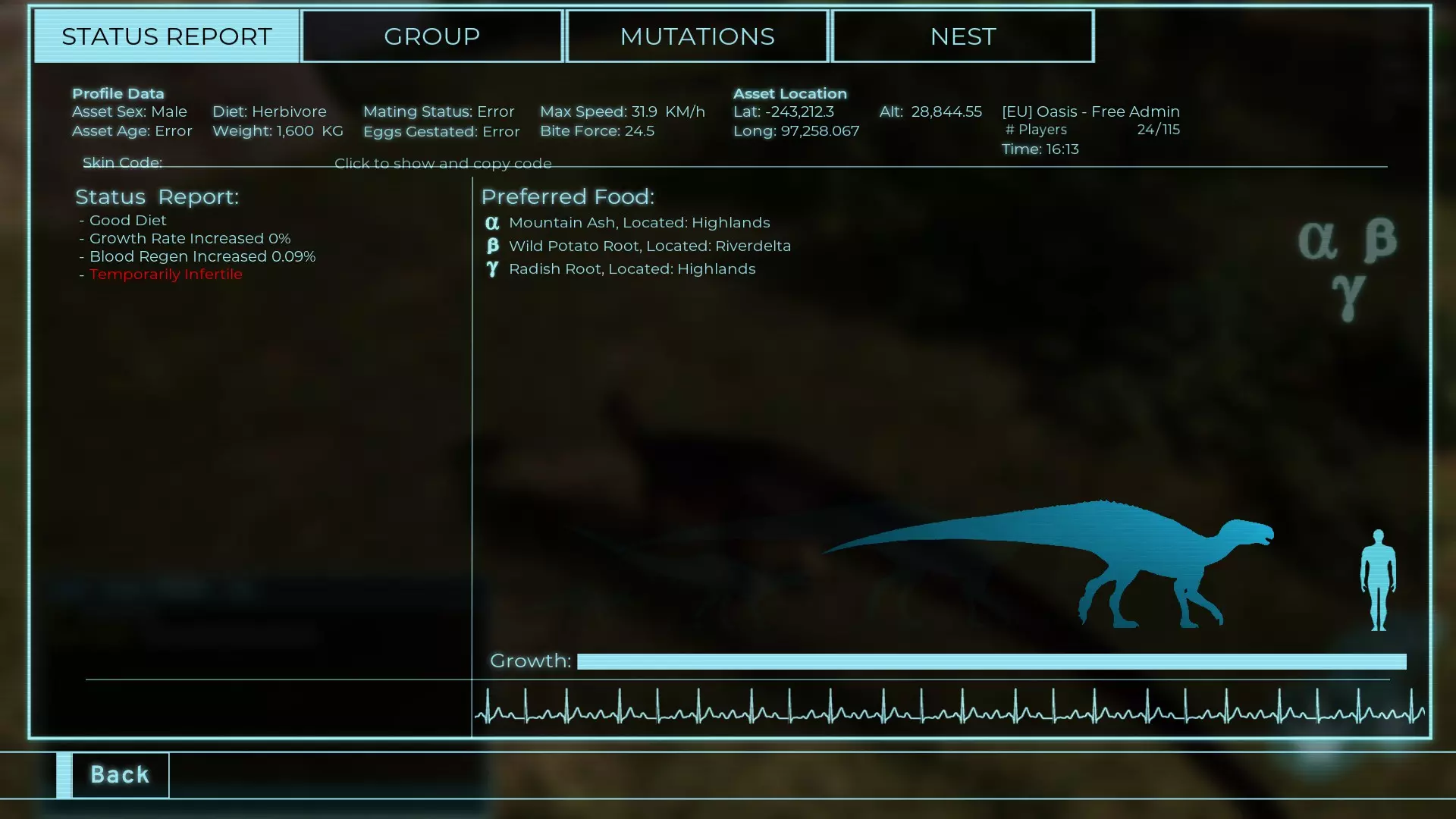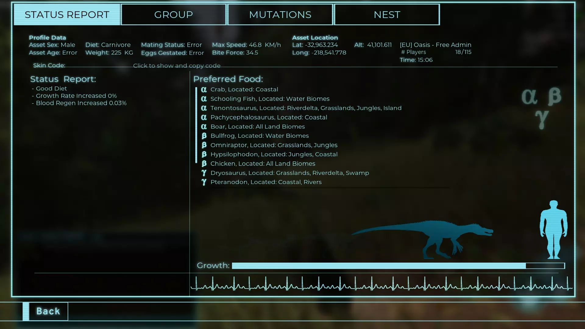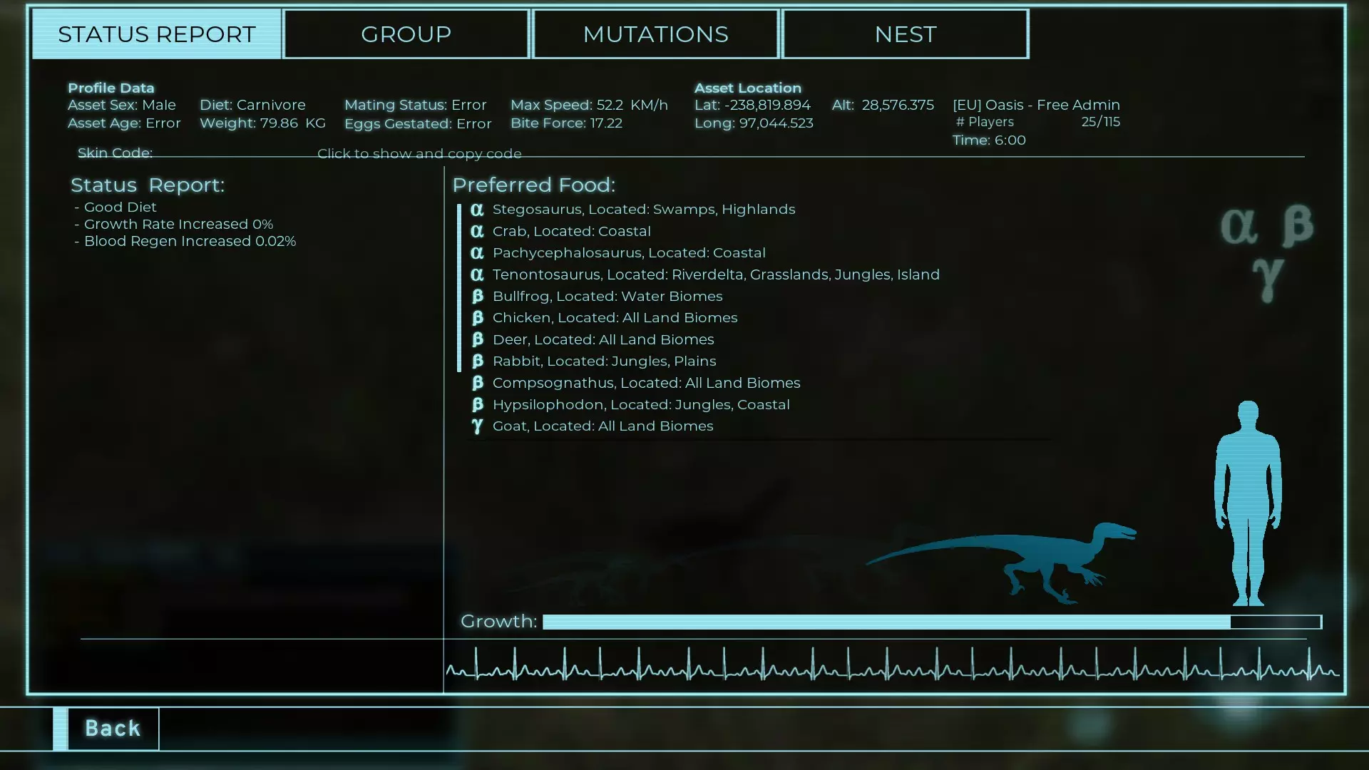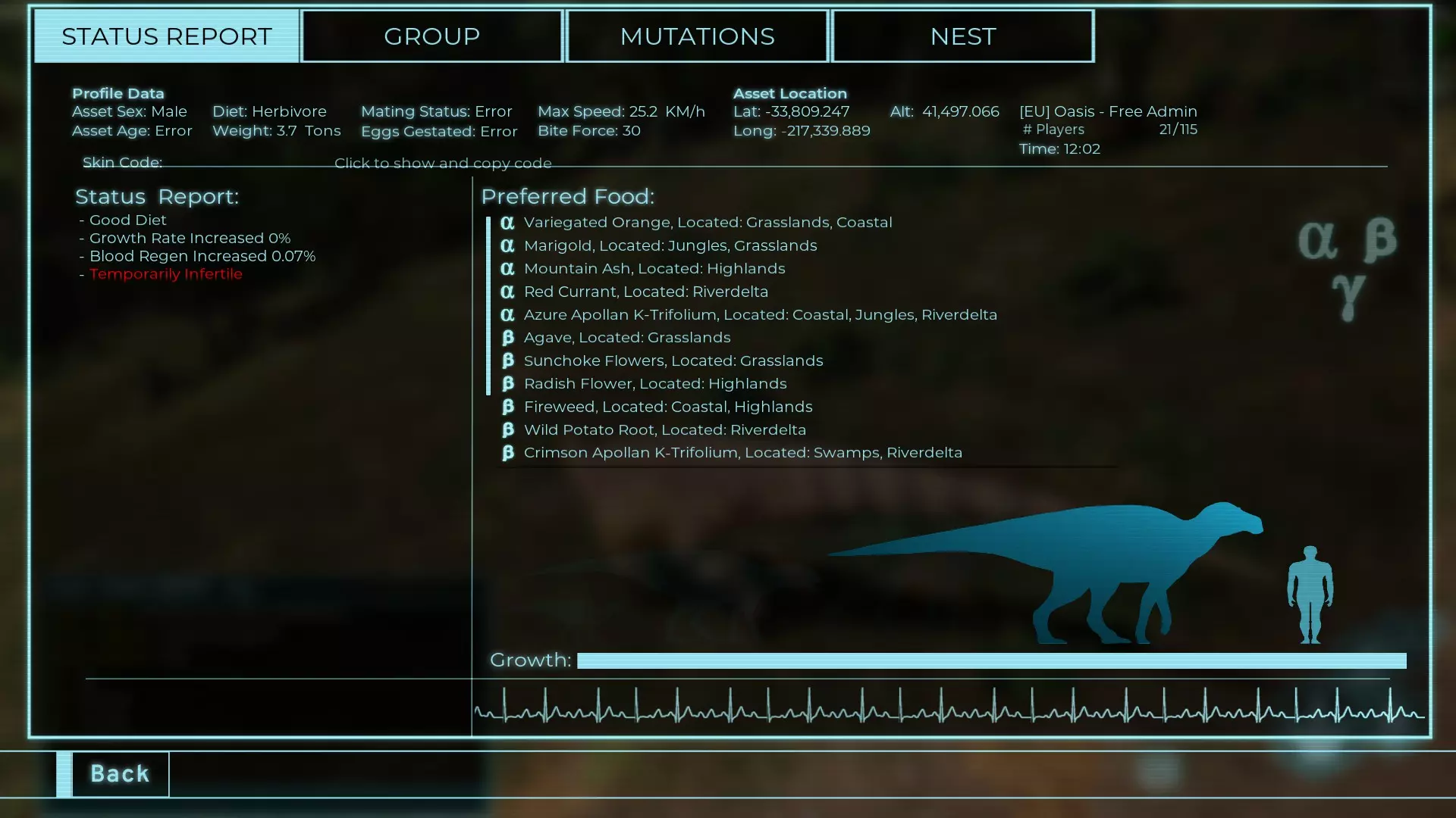 体力:60 攻击力:23 Alt攻击力:34.5 步行速度:7.2km/h 疾走速度:31.3km/h 体重:60kg 【衰退期(100%)】