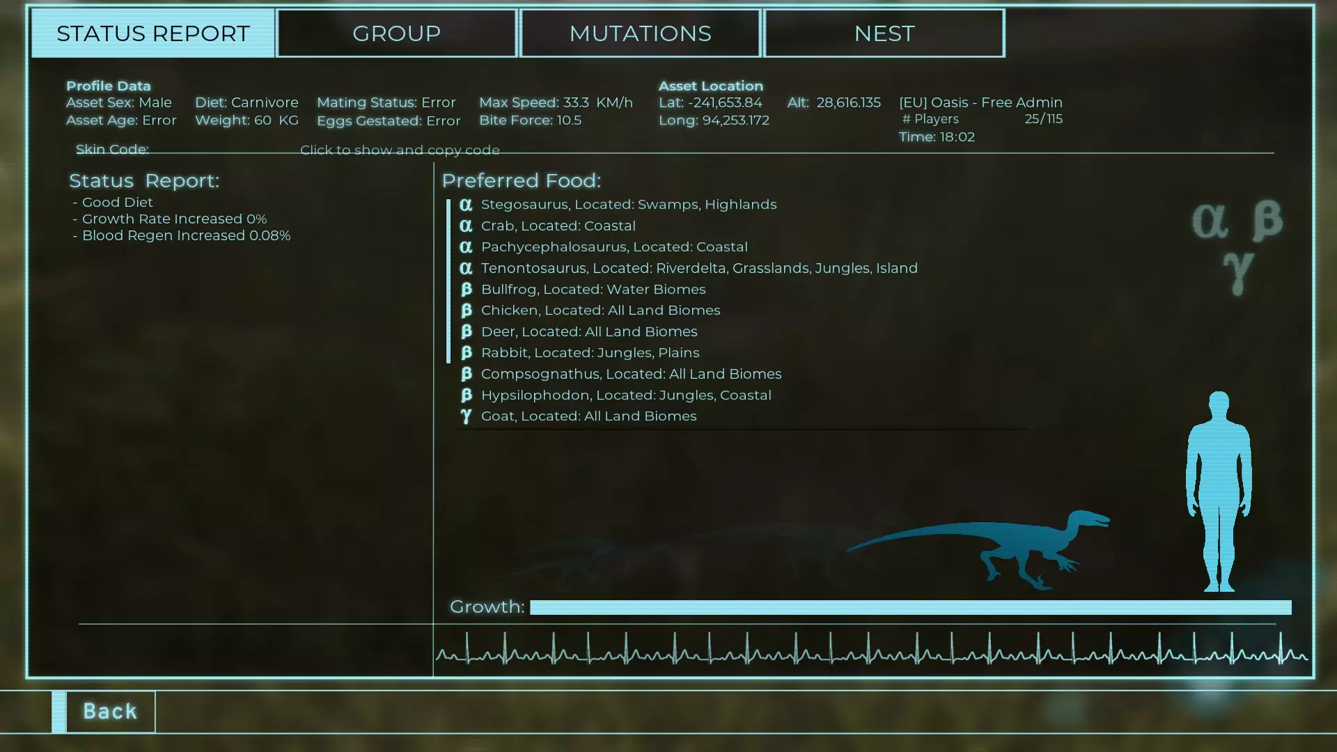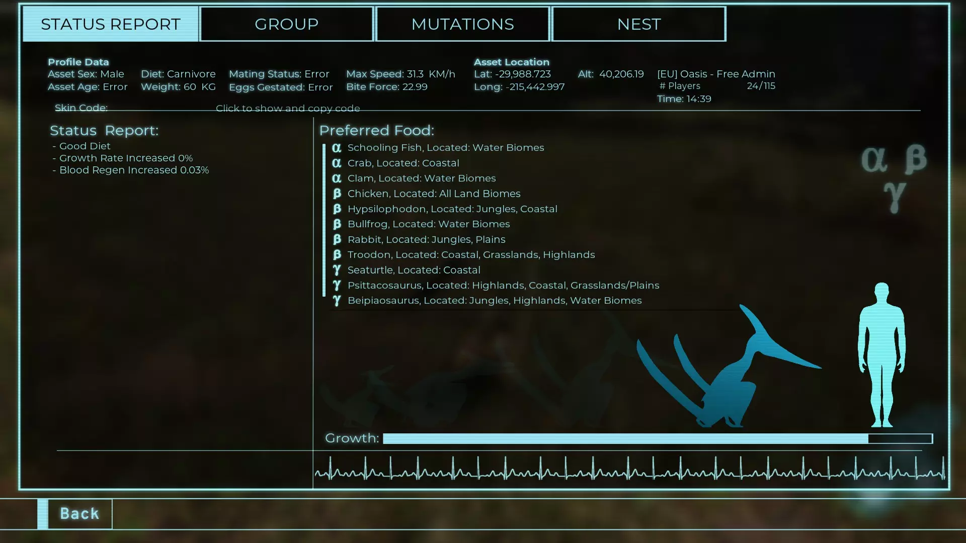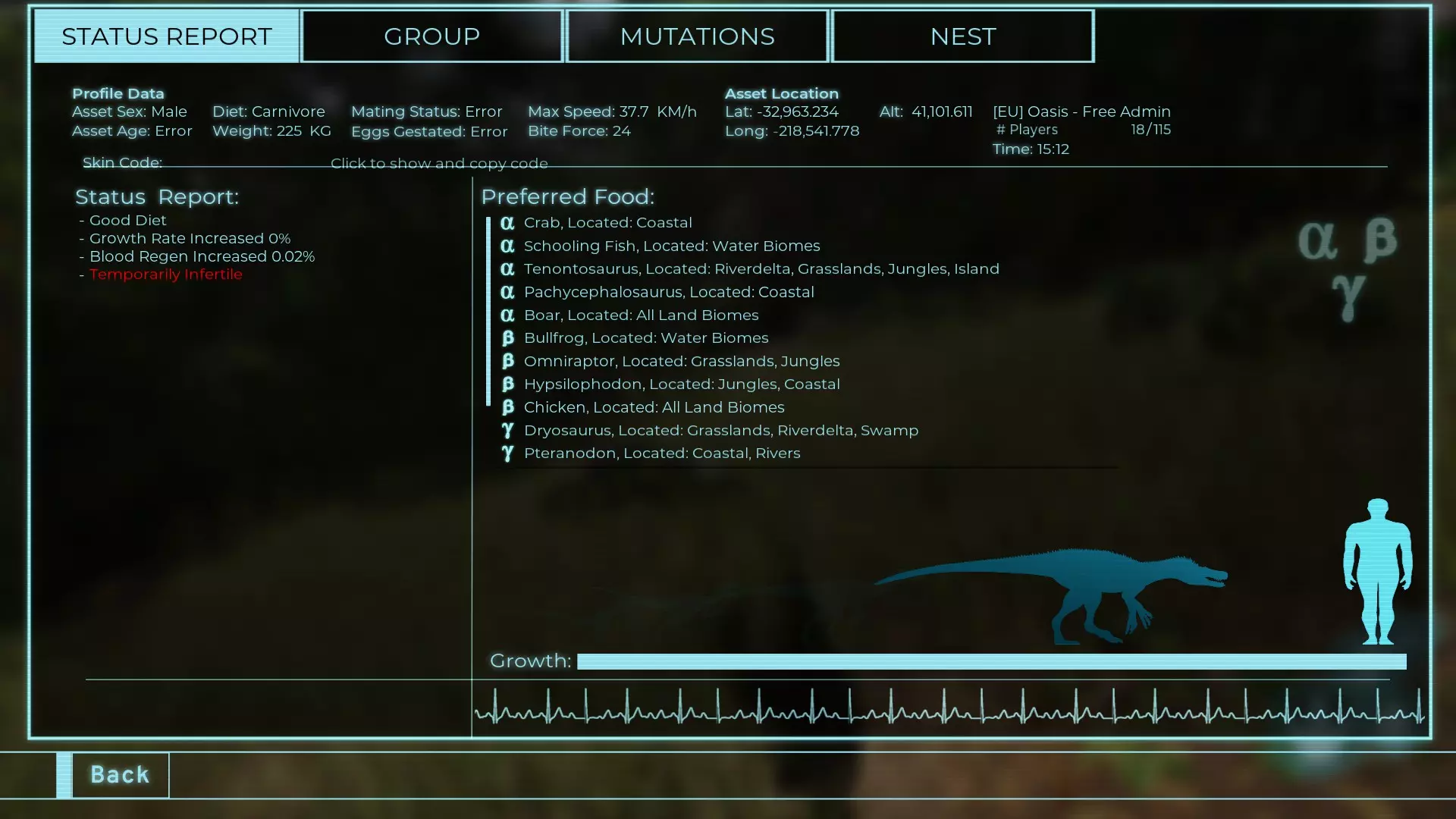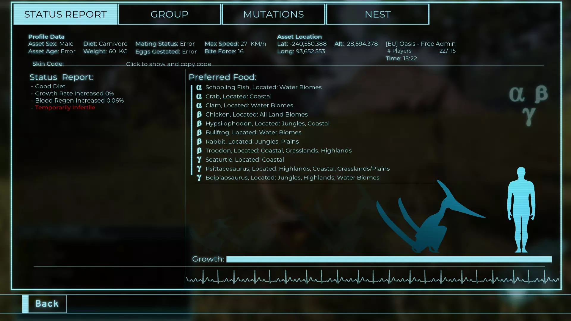 体力:60 攻击力:23 Alt攻击力:34.5 步行速度:7.2km/h 疾走速度:31.3km/h 体重:60kg 【衰退期(100%)】