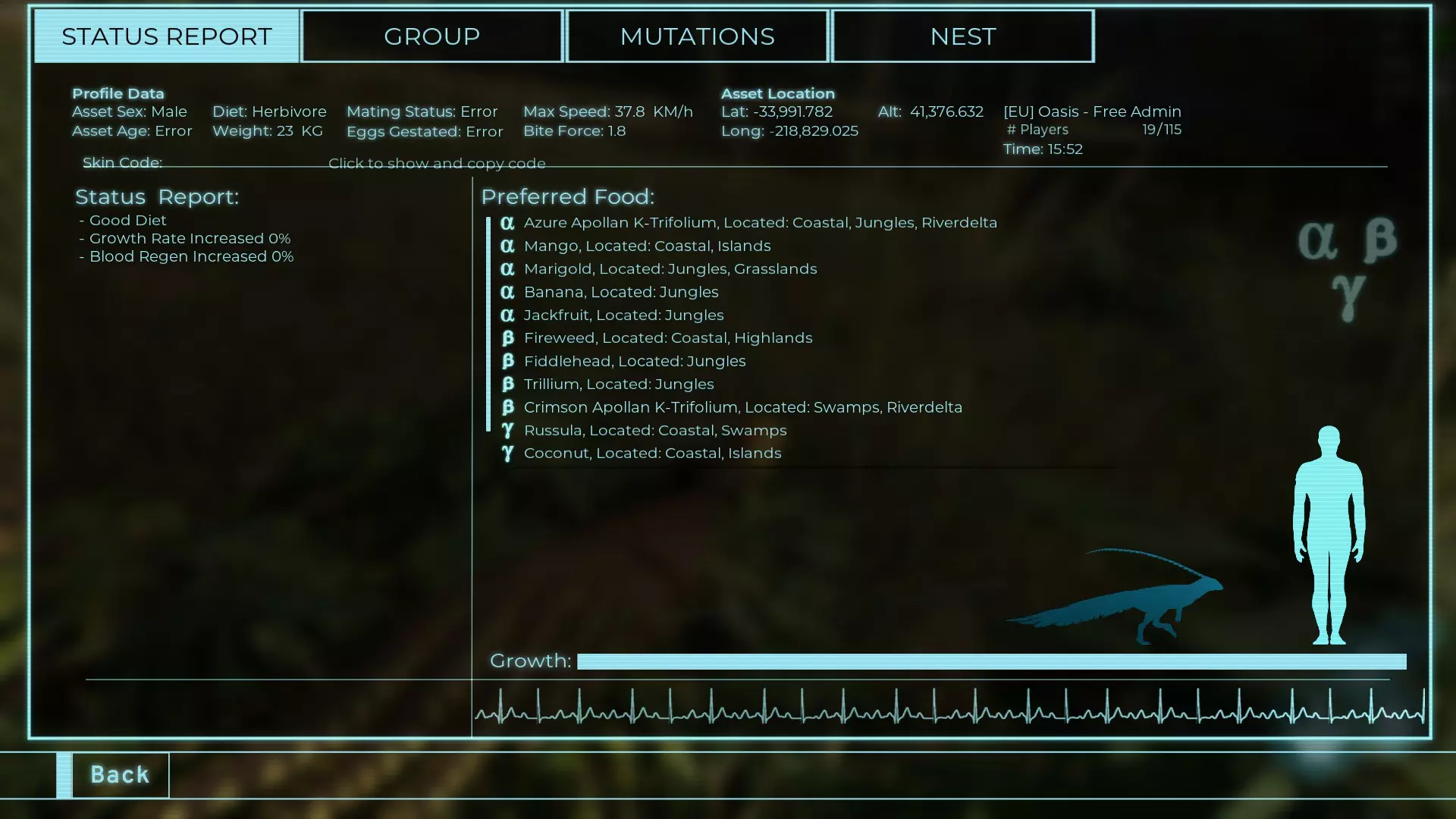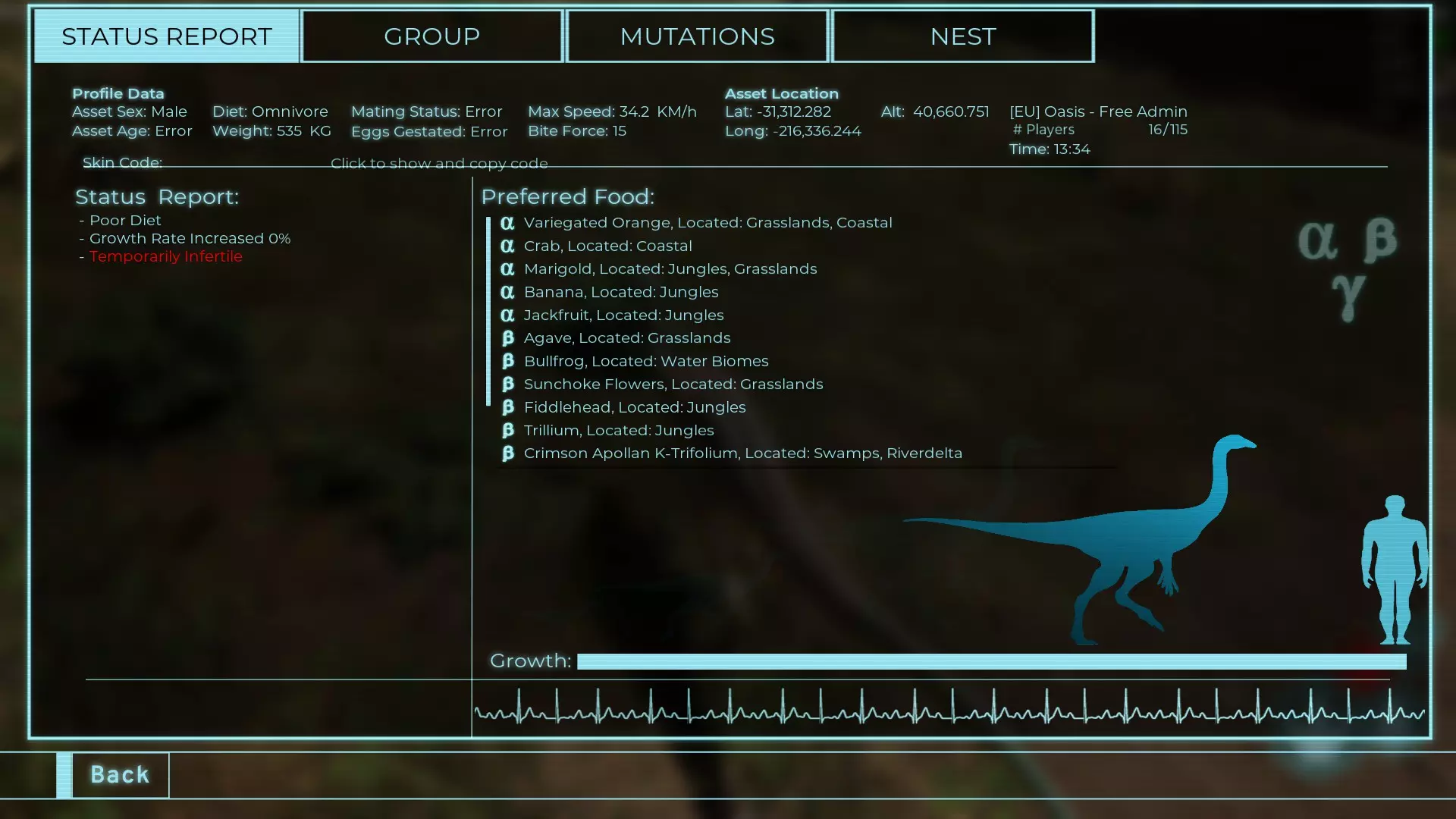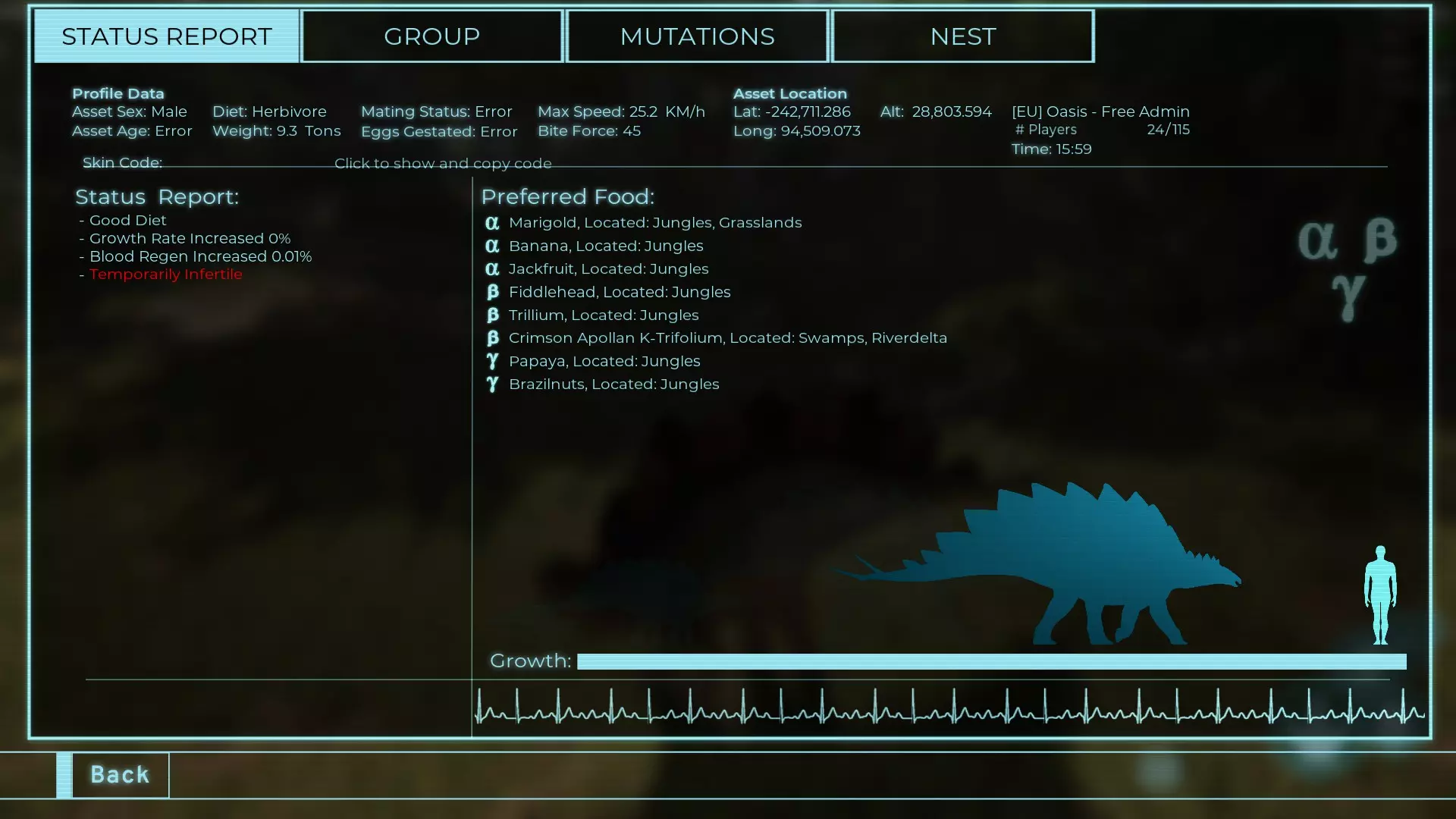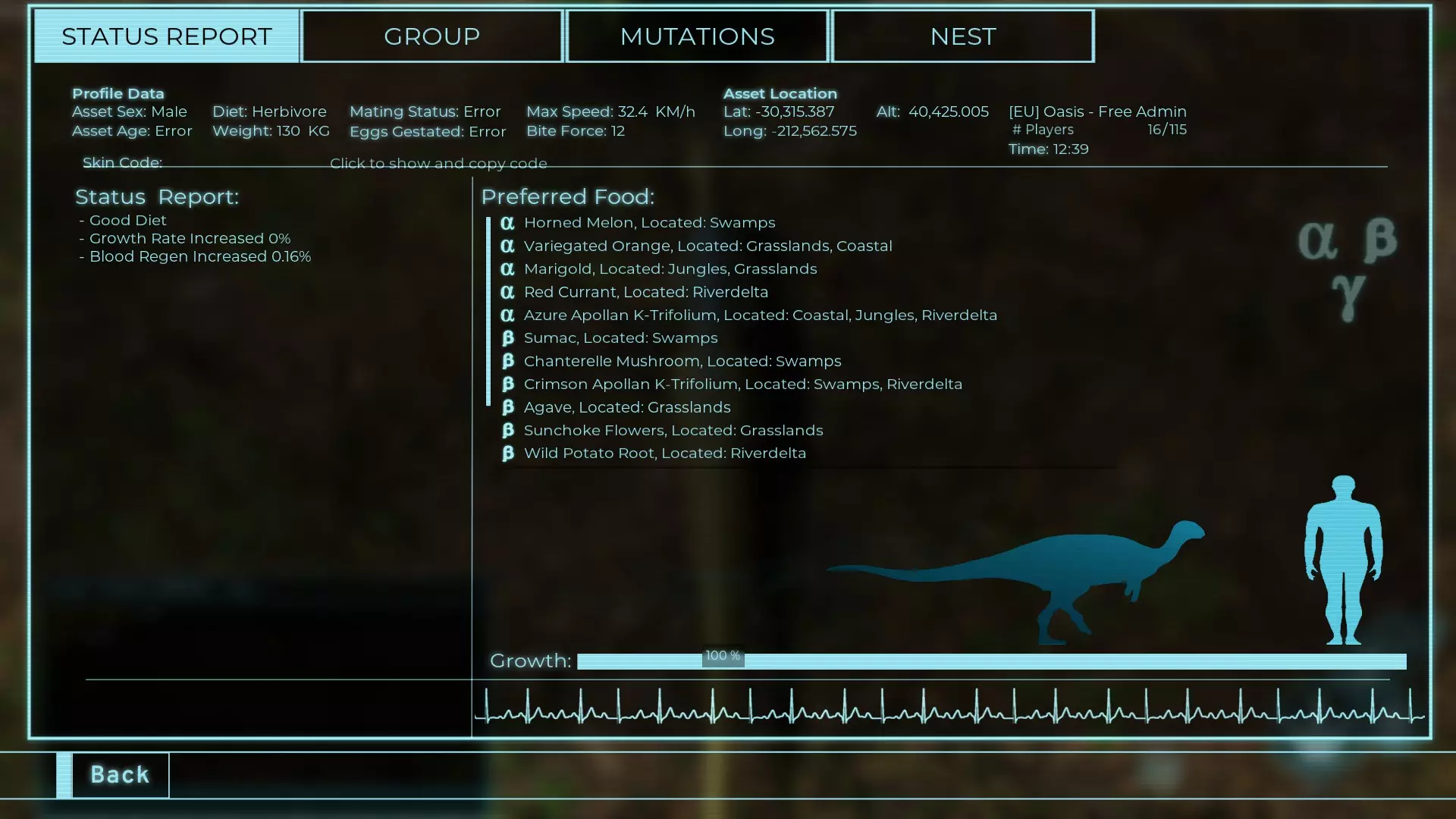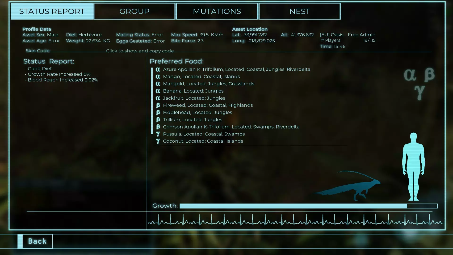 体力:60 攻击力:23 Alt攻击力:34.5 步行速度:7.2km/h 疾走速度:31.3km/h 体重:60kg 【衰退期(100%)】