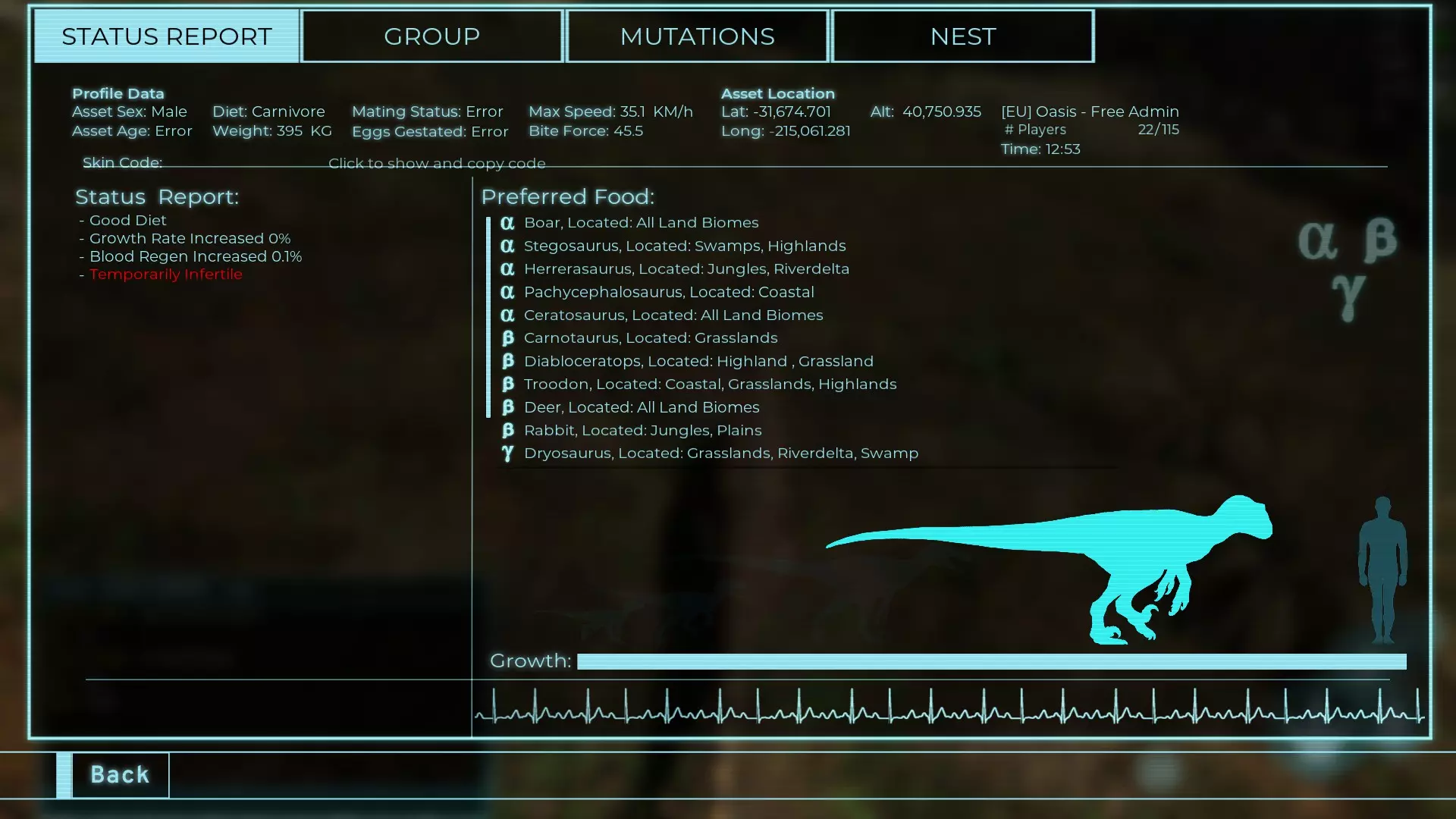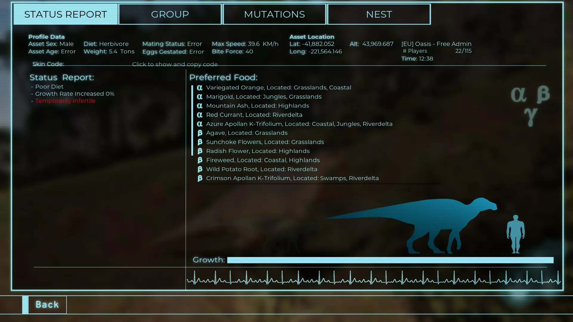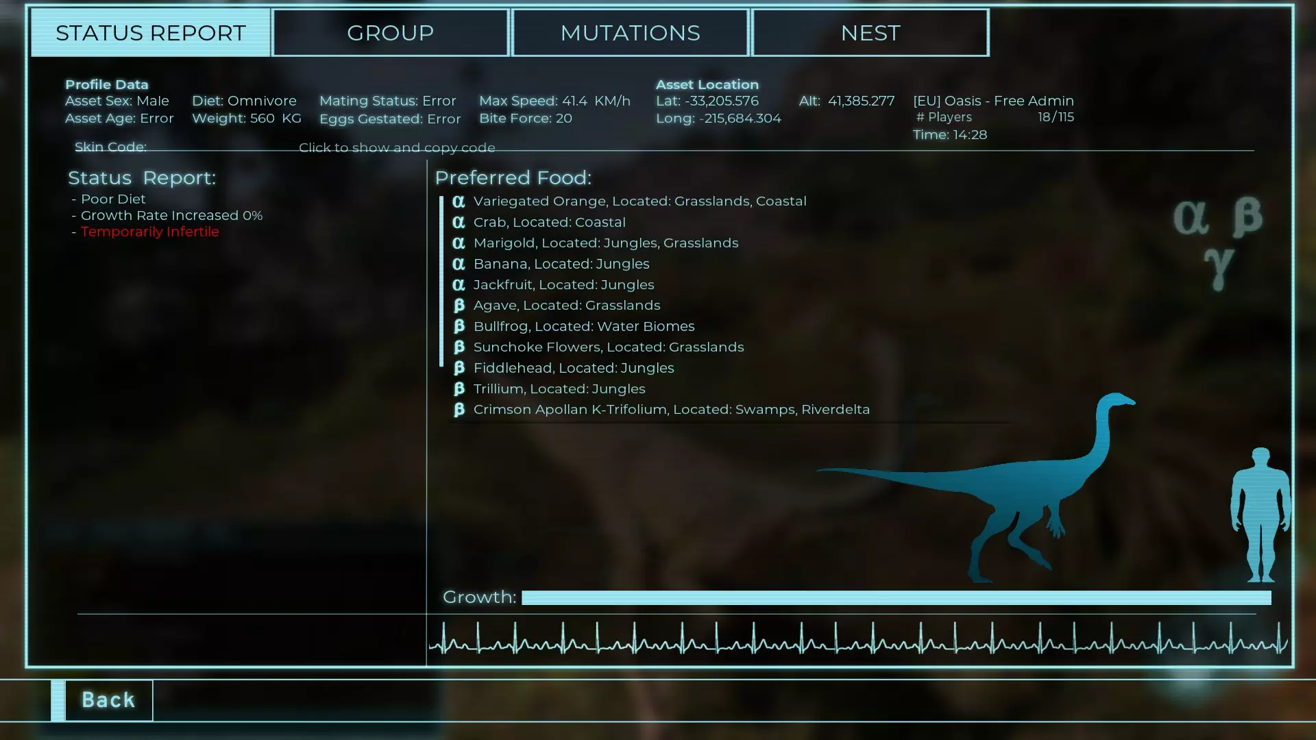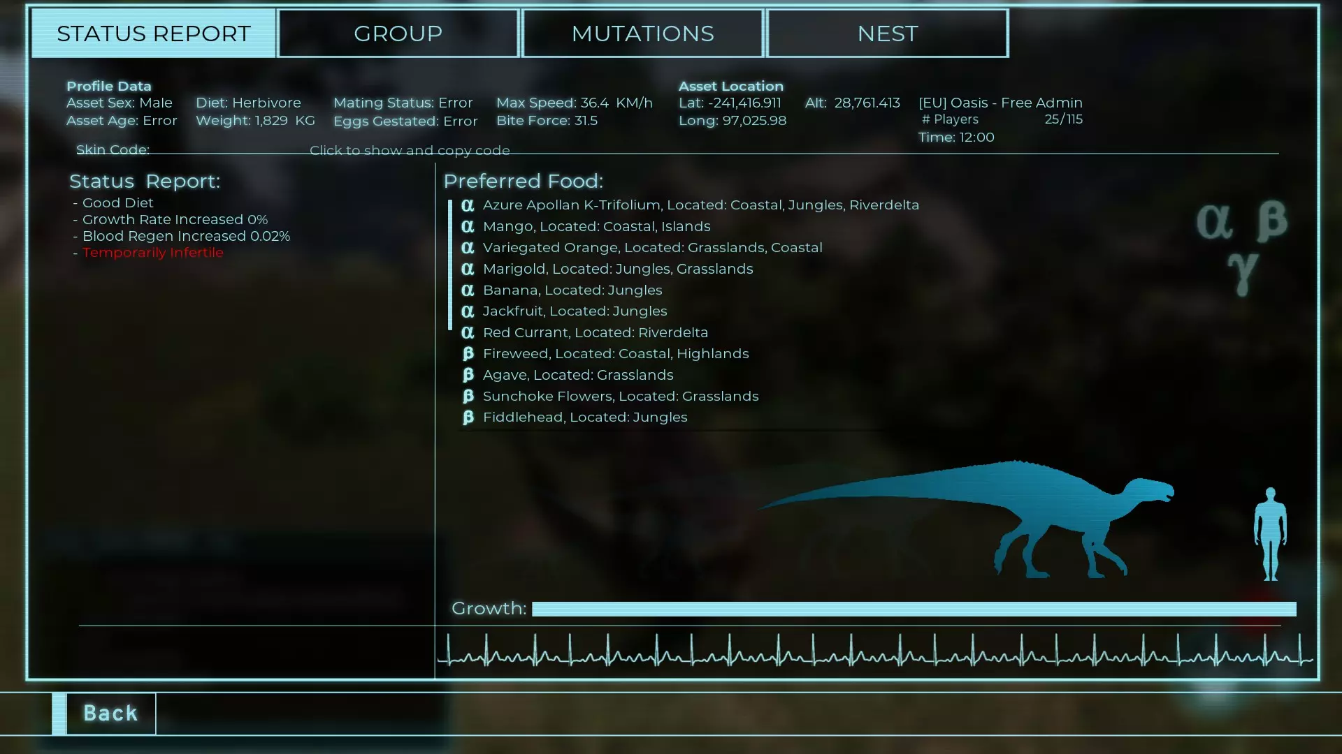 体力:60 攻击力:23 Alt攻击力:34.5 步行速度:7.2km/h 疾走速度:31.3km/h 体重:60kg 【衰退期(100%)】