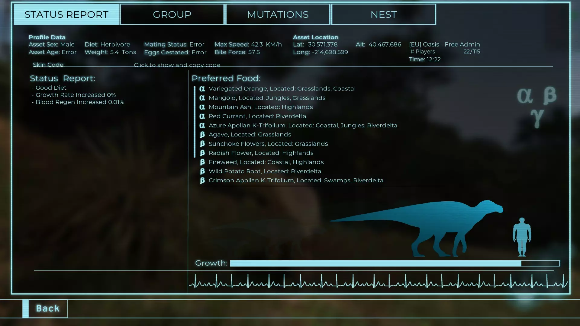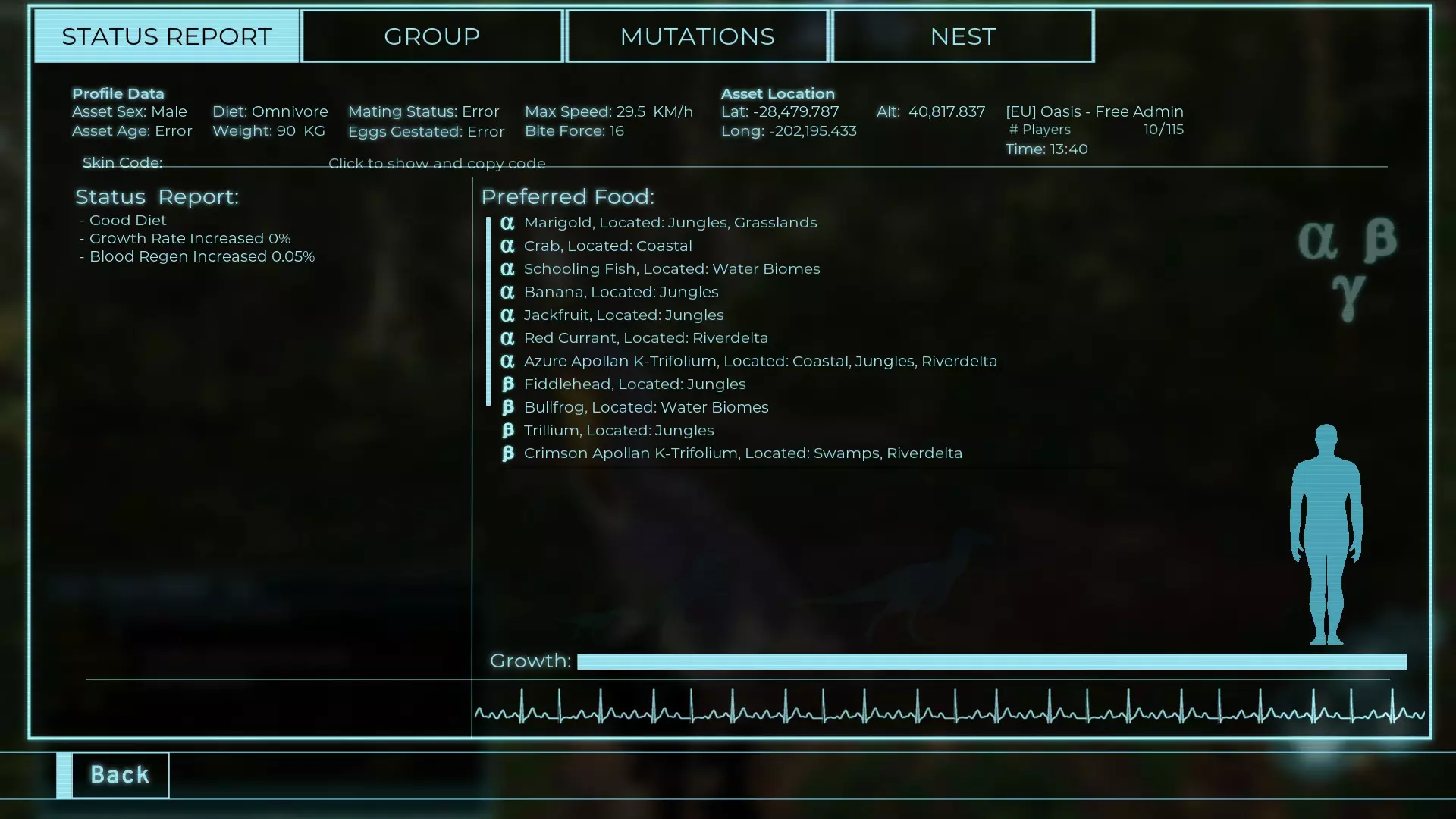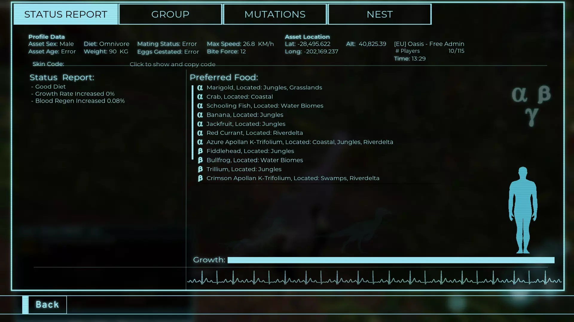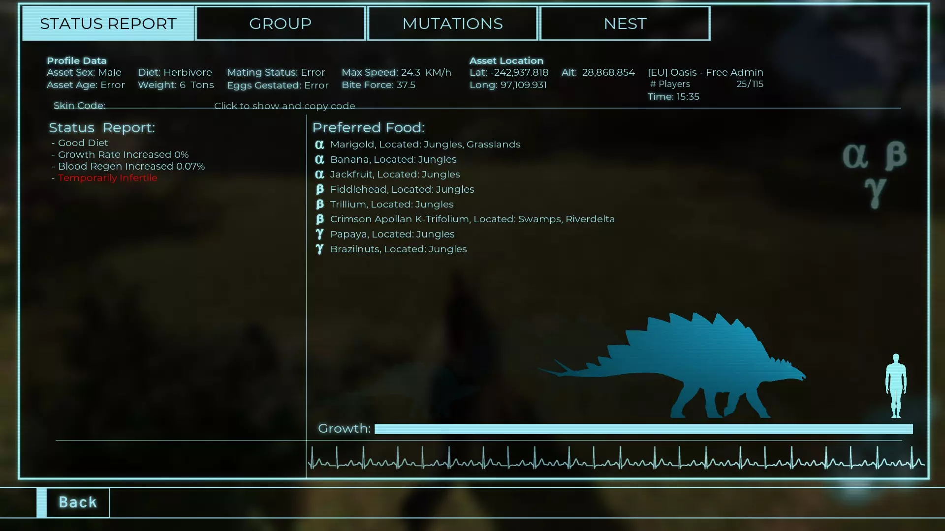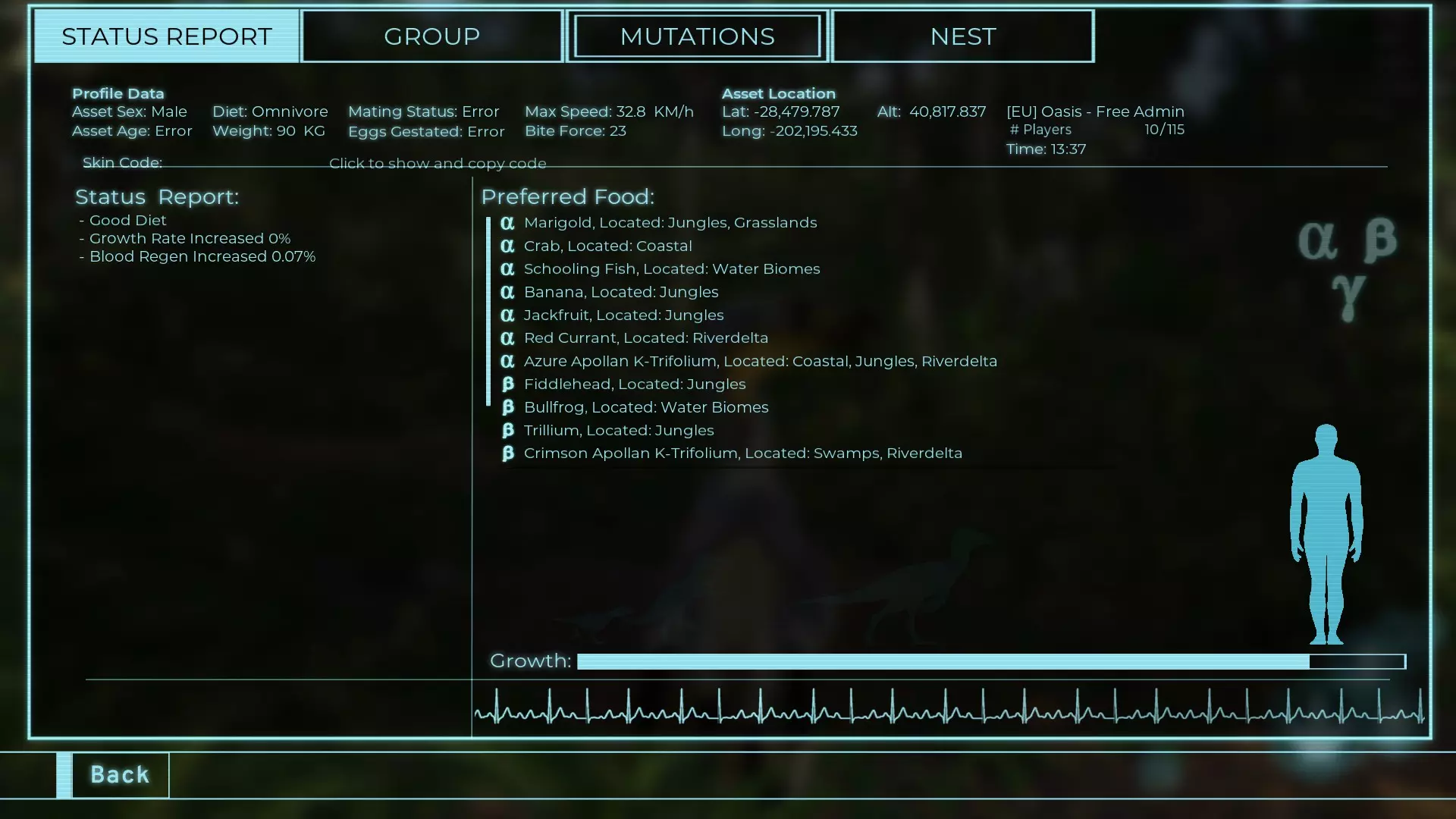 体力:60 攻击力:23 Alt攻击力:34.5 步行速度:7.2km/h 疾走速度:31.3km/h 体重:60kg 【衰退期(100%)】