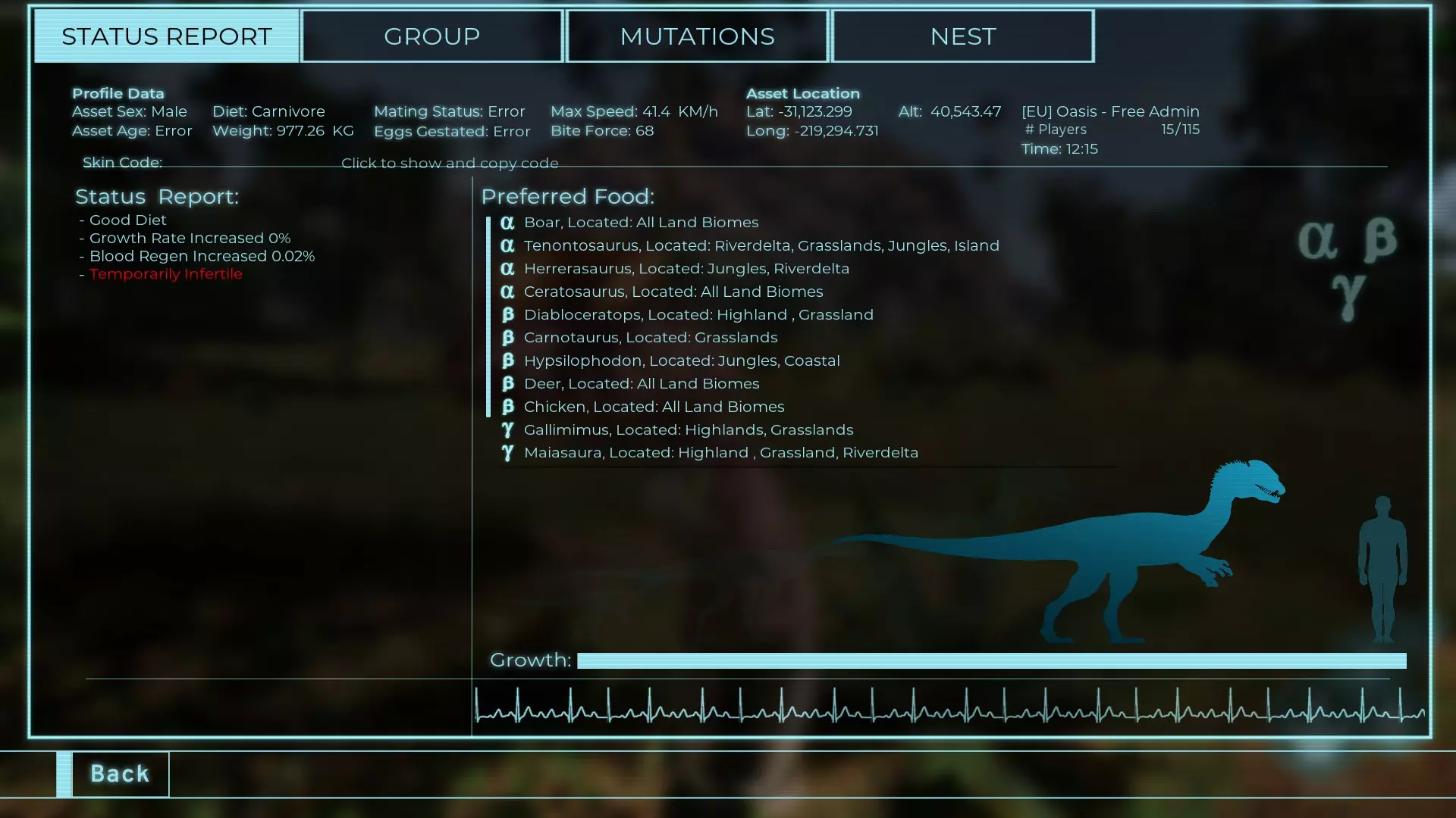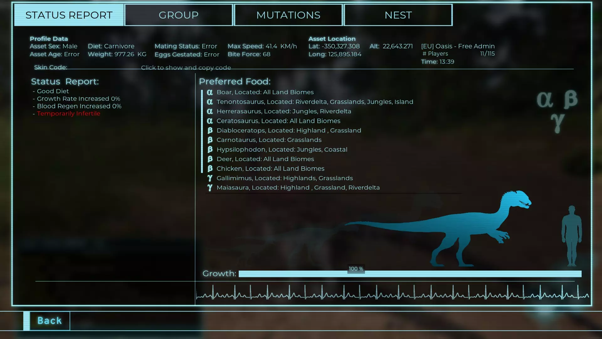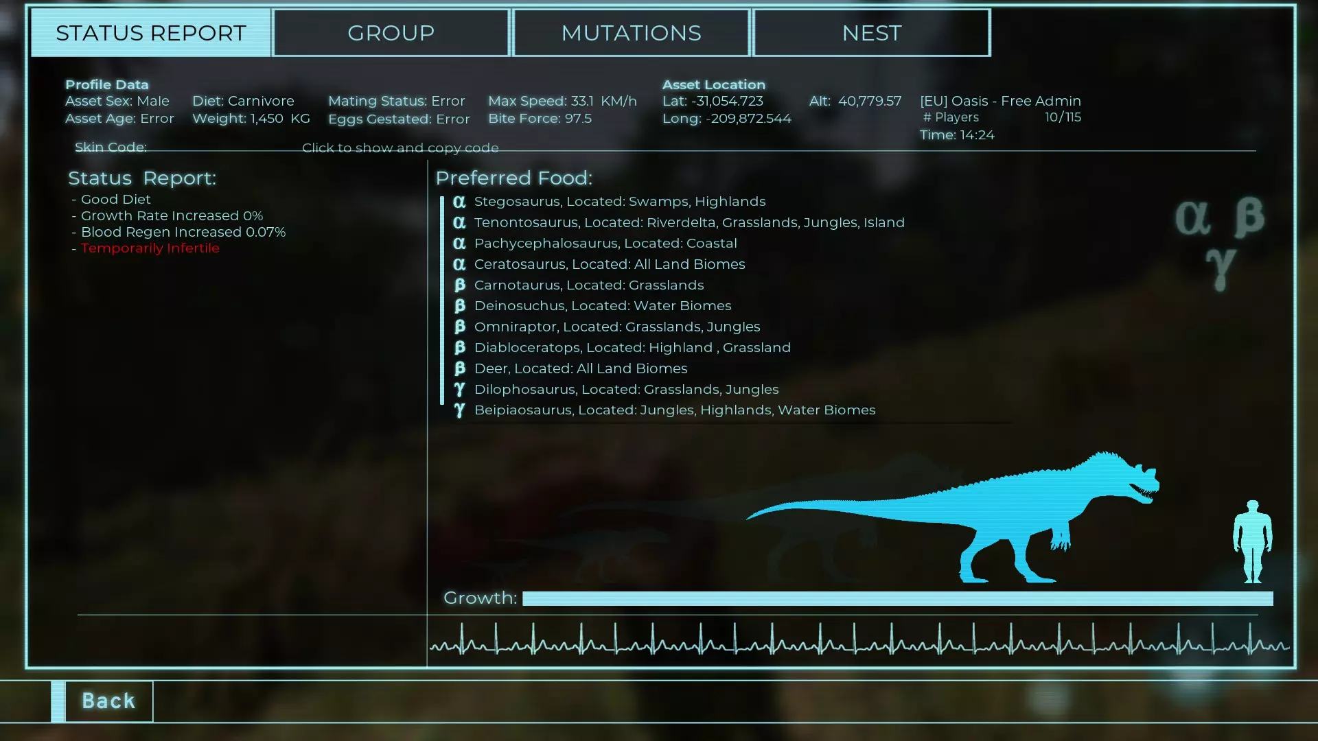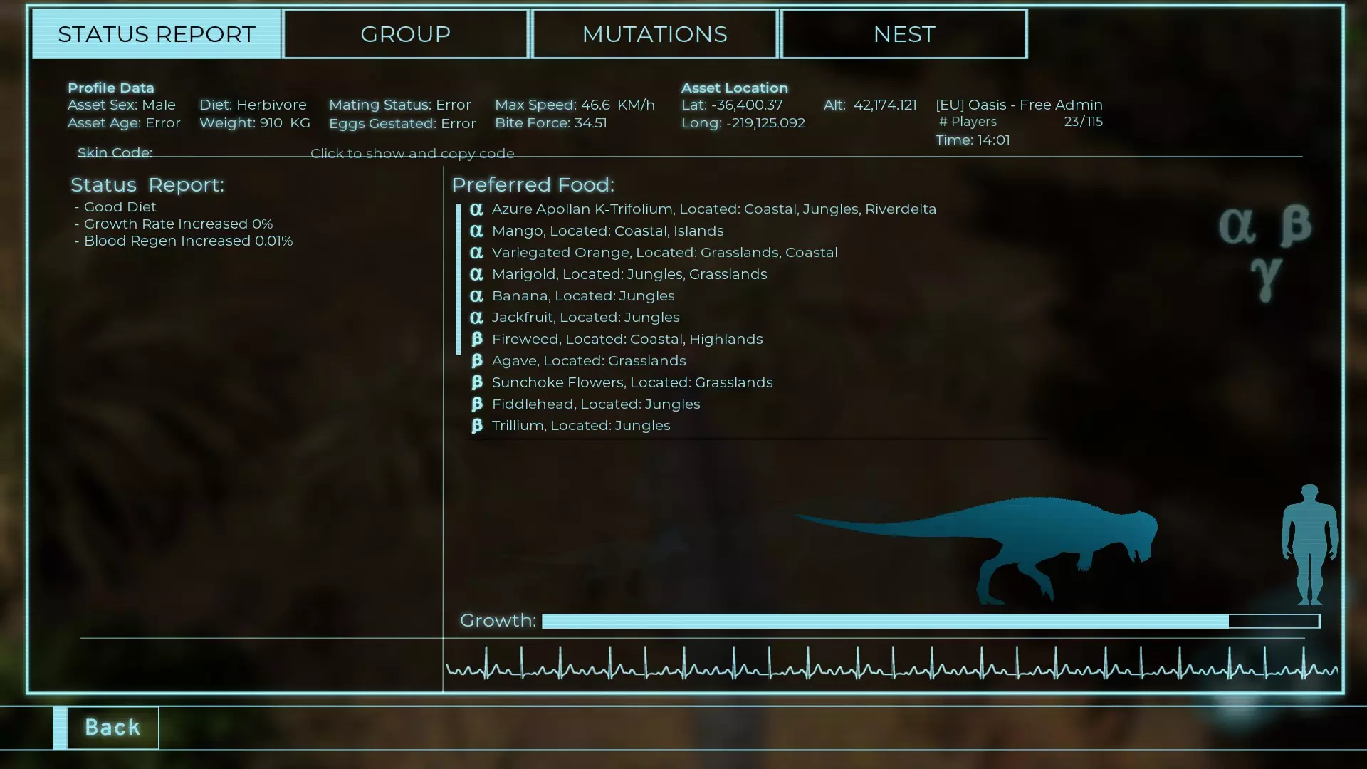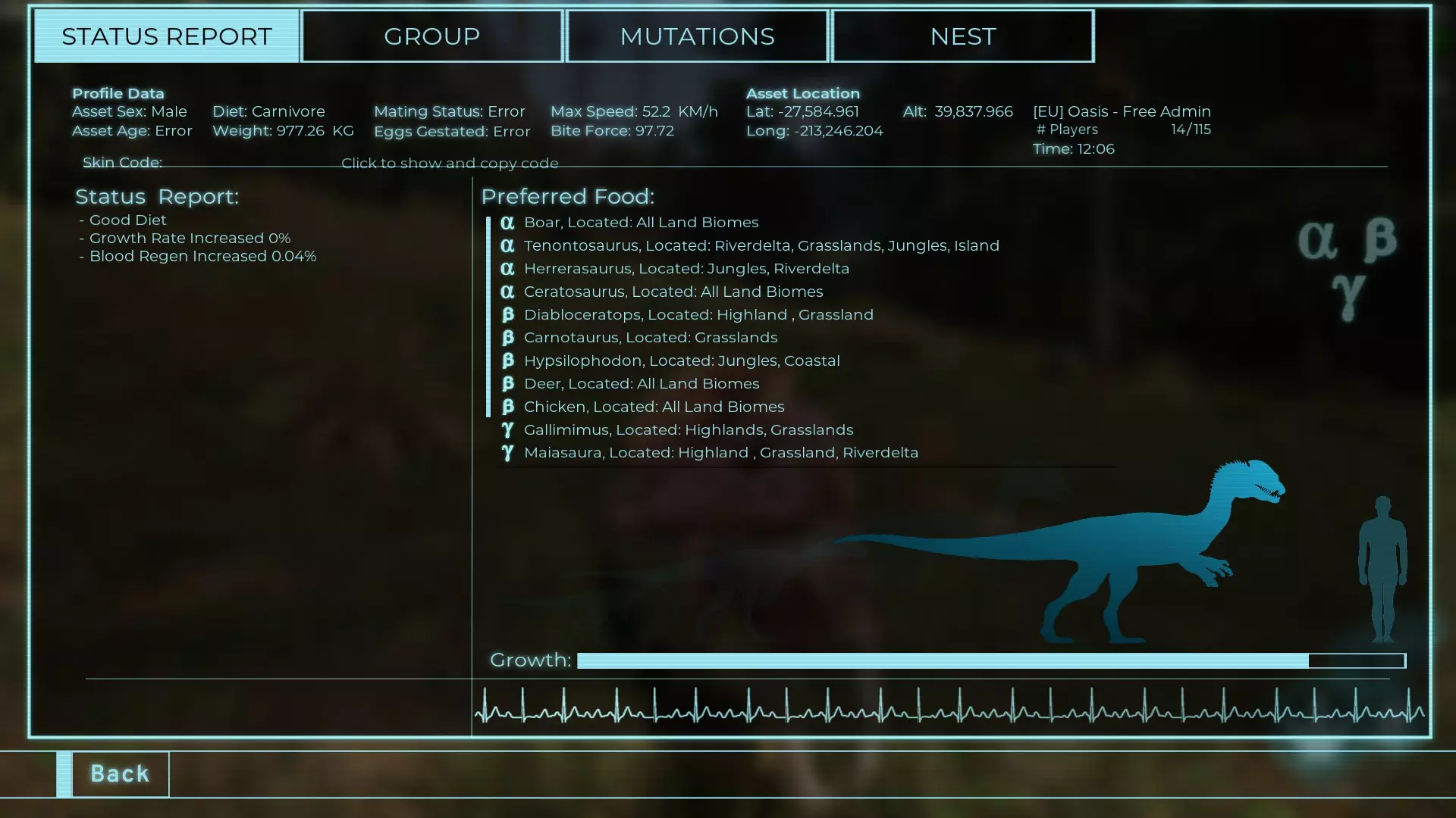 体力:977 攻击力:97 Alt攻击:143 幻觉攻击:97 步行速度:20.2 疾走速度:52.2km/h 体重:977kg 【衰退期】
