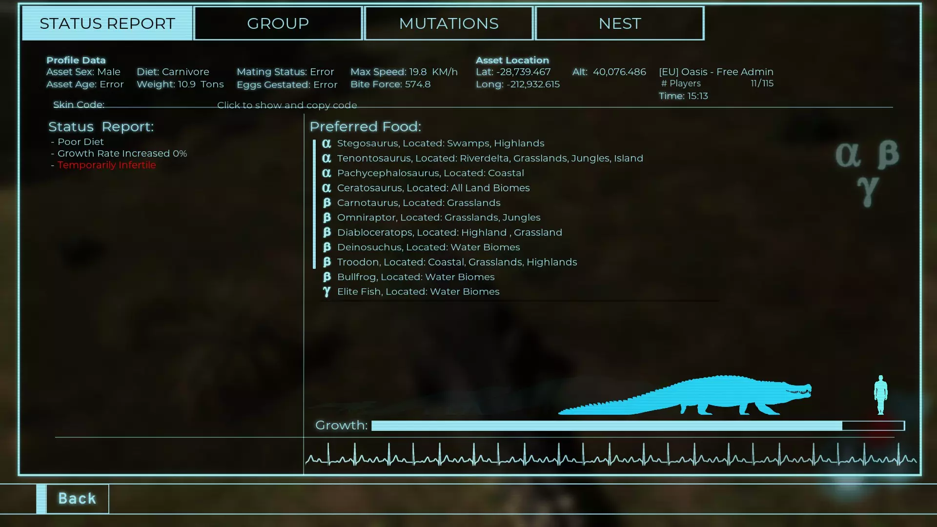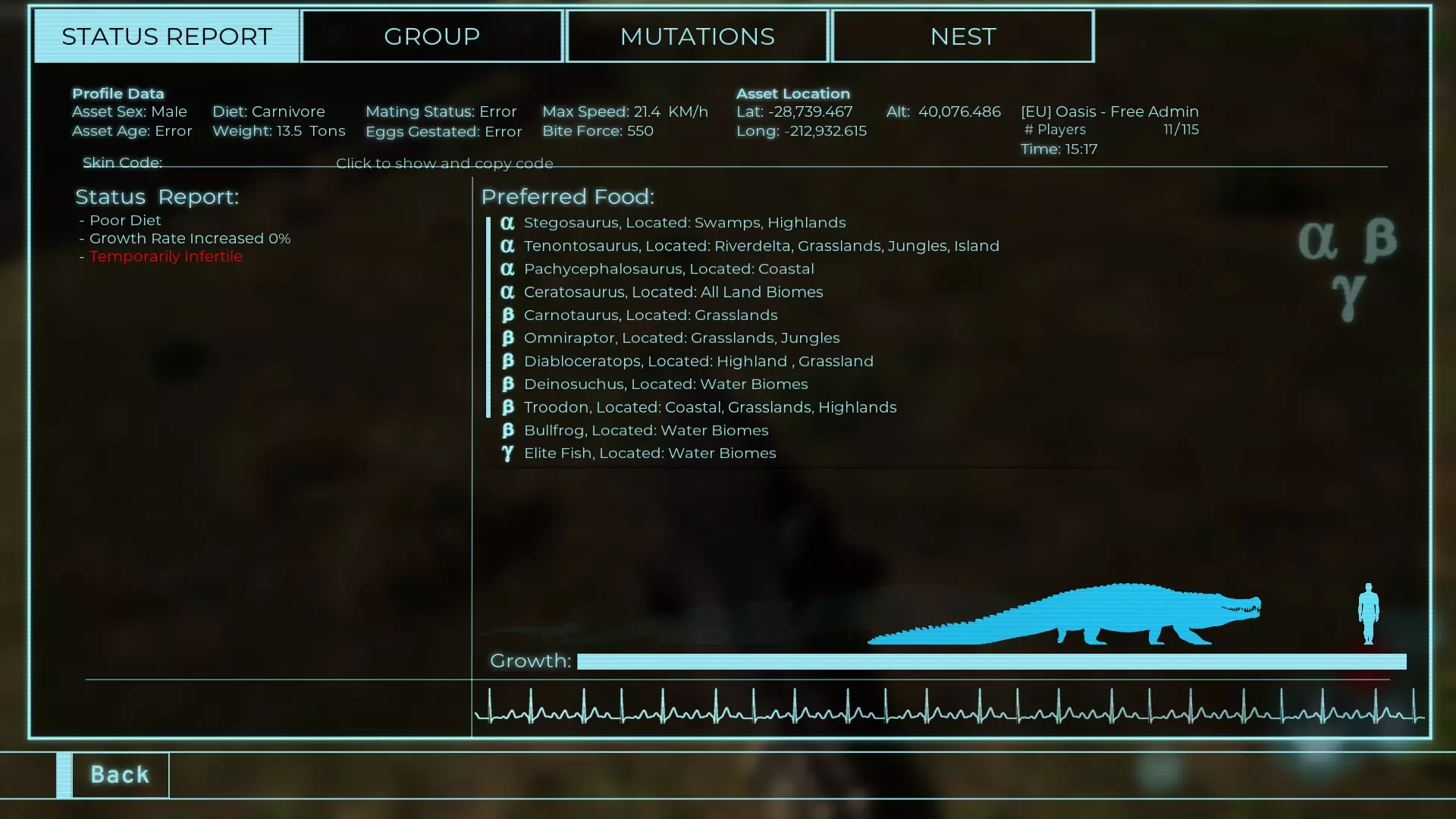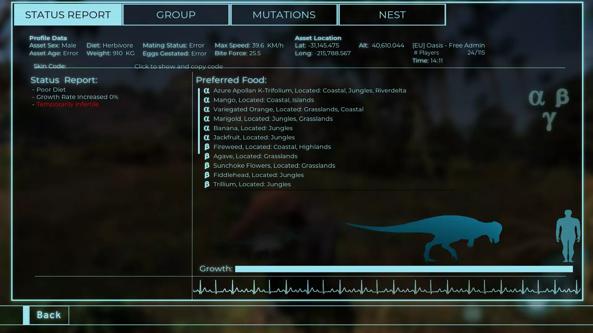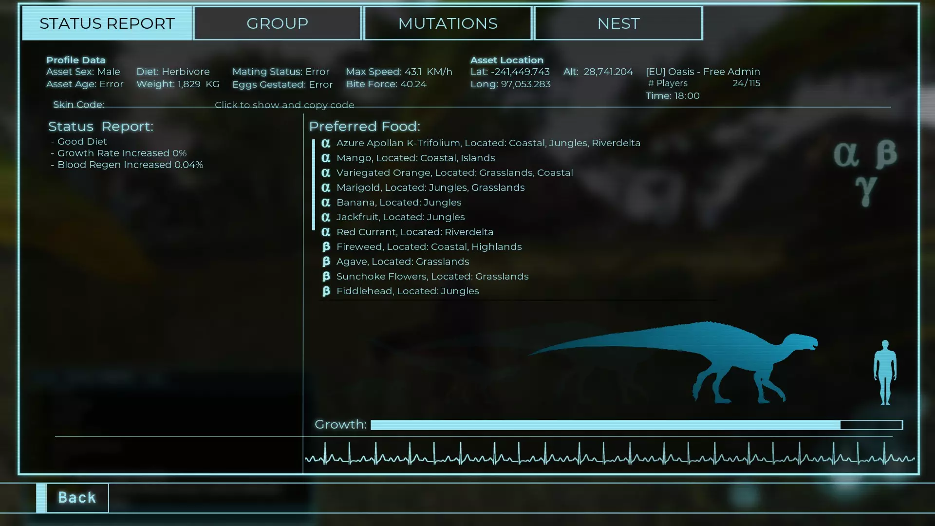 体力:977 攻击力:97 Alt攻击:143 幻觉攻击:97 步行速度:20.2 疾走速度:52.2km/h 体重:977kg 【衰退期】