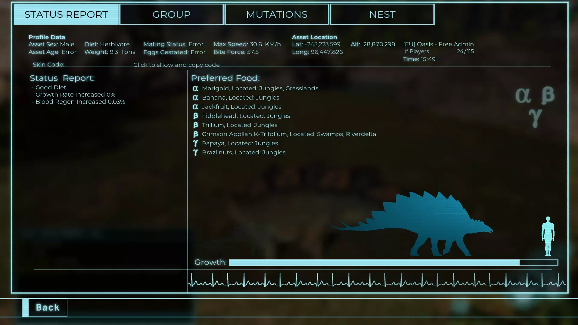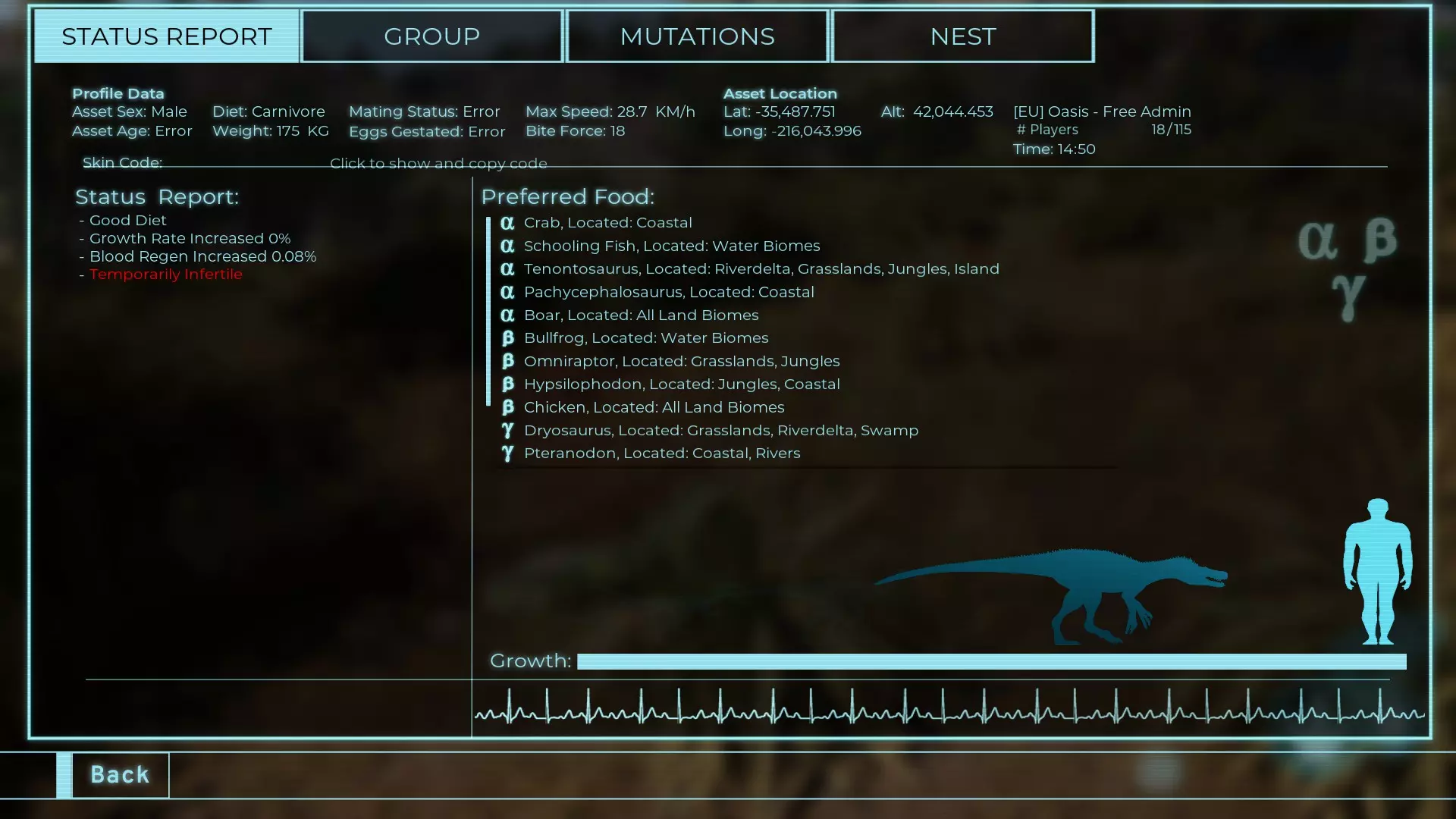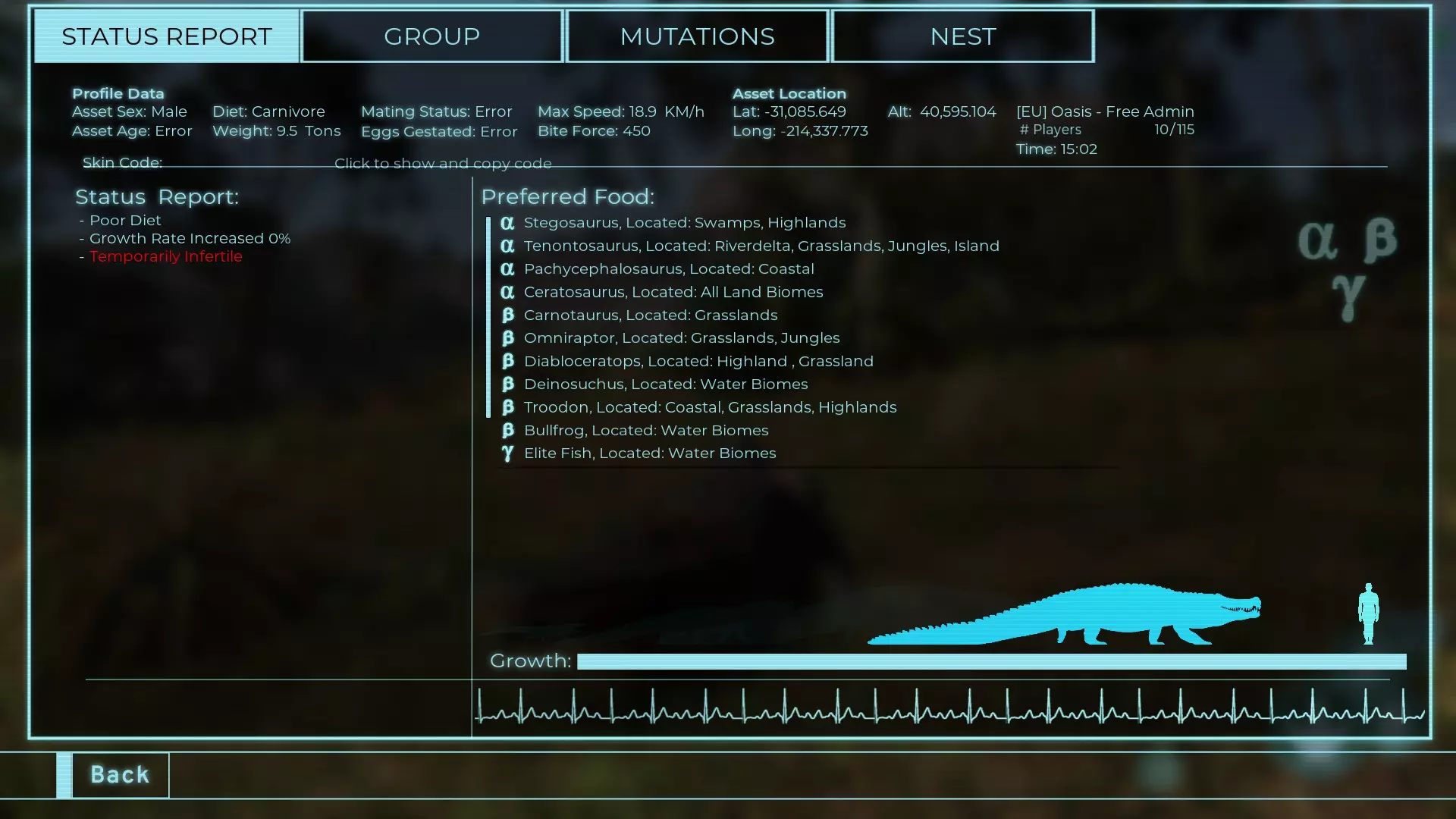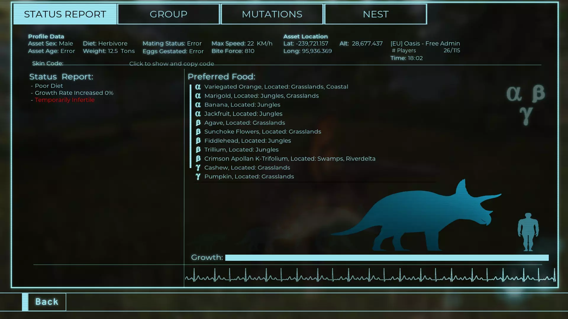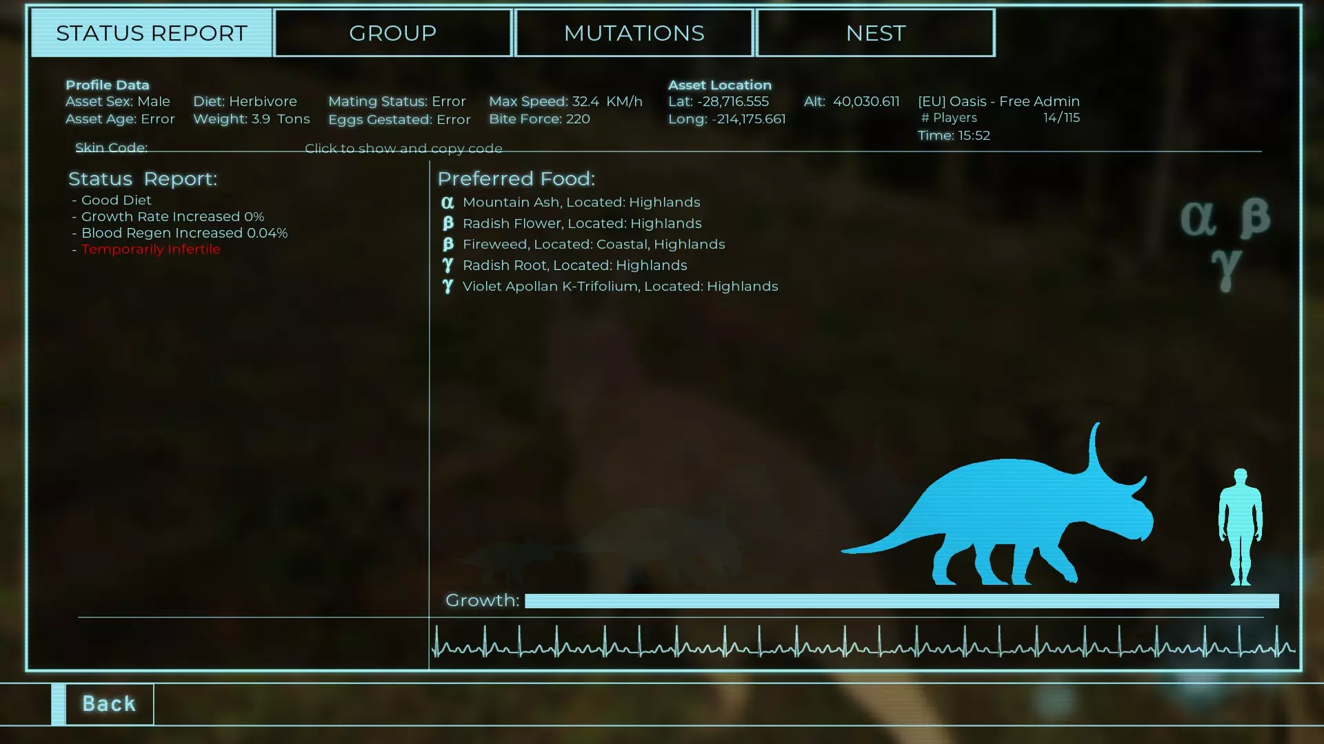 体力:977 攻击力:97 Alt攻击:143 幻觉攻击:97 步行速度:20.2 疾走速度:52.2km/h 体重:977kg 【衰退期】