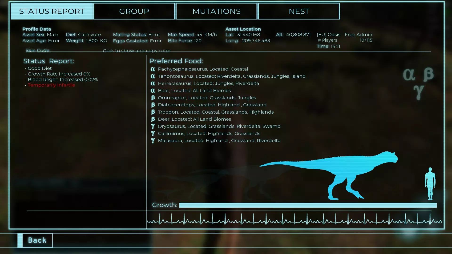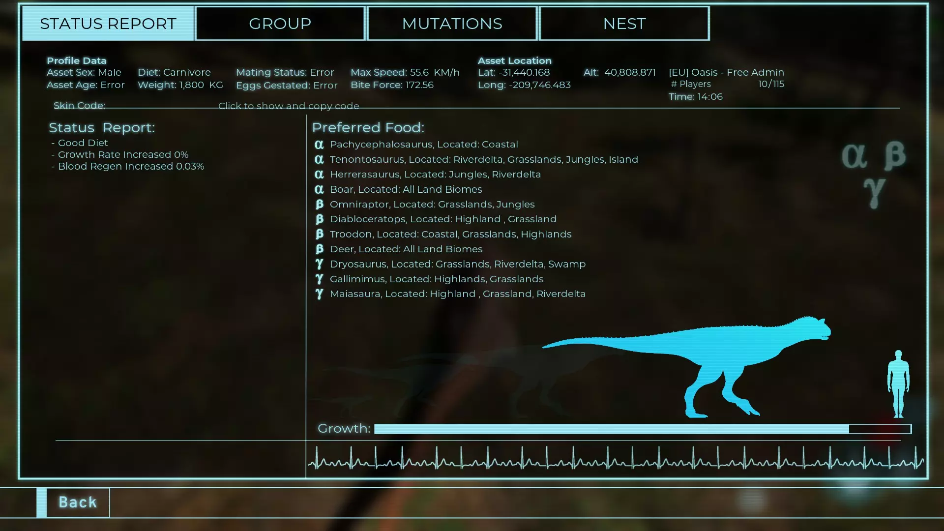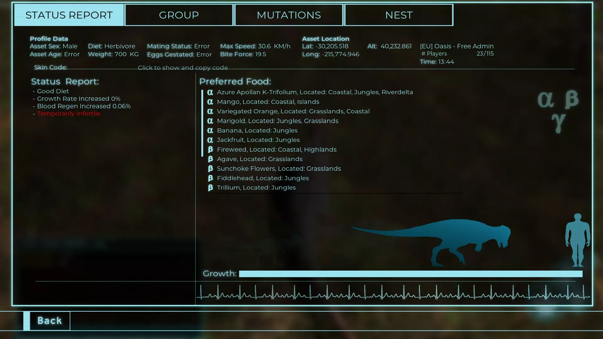体力:535 攻击力:15 踢击:42 Alt攻击力:54 步行速度:36km/h 疾跑速度:34.2km/h 疾跑速度(营养加成):40.3km/h 体重:535 Herrera 龙 【Prime Elder】 【全盛期(87.5%)】