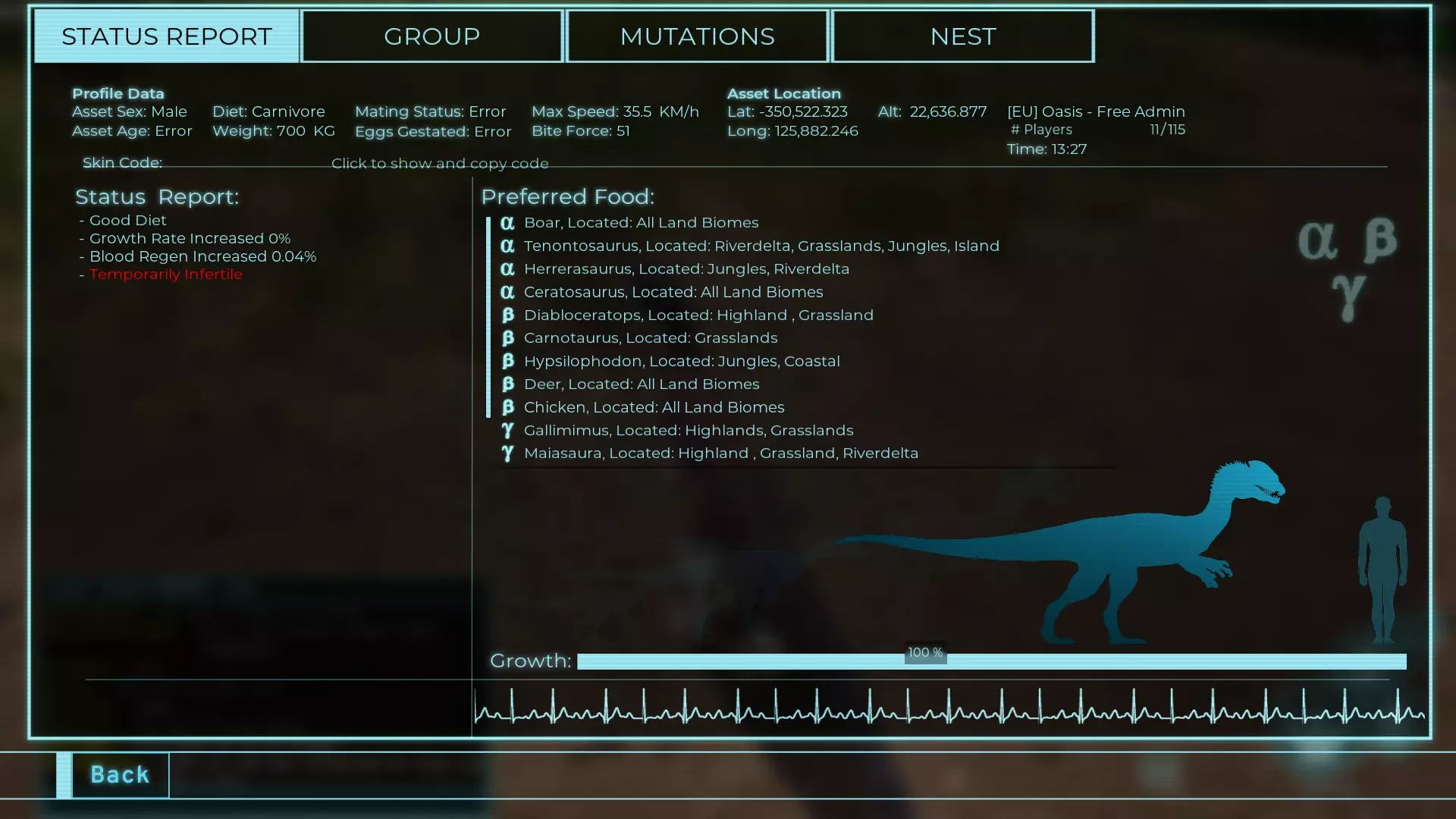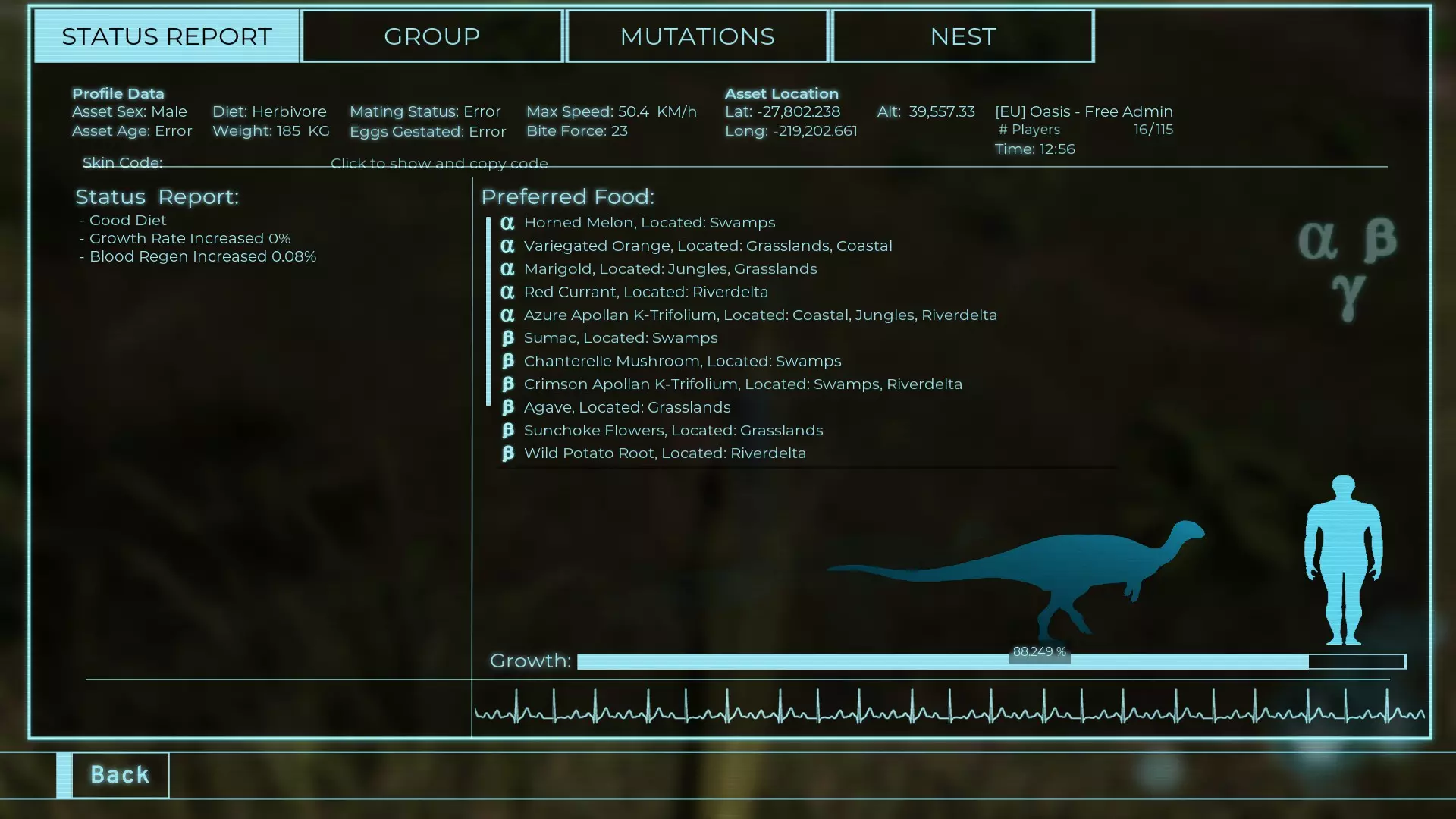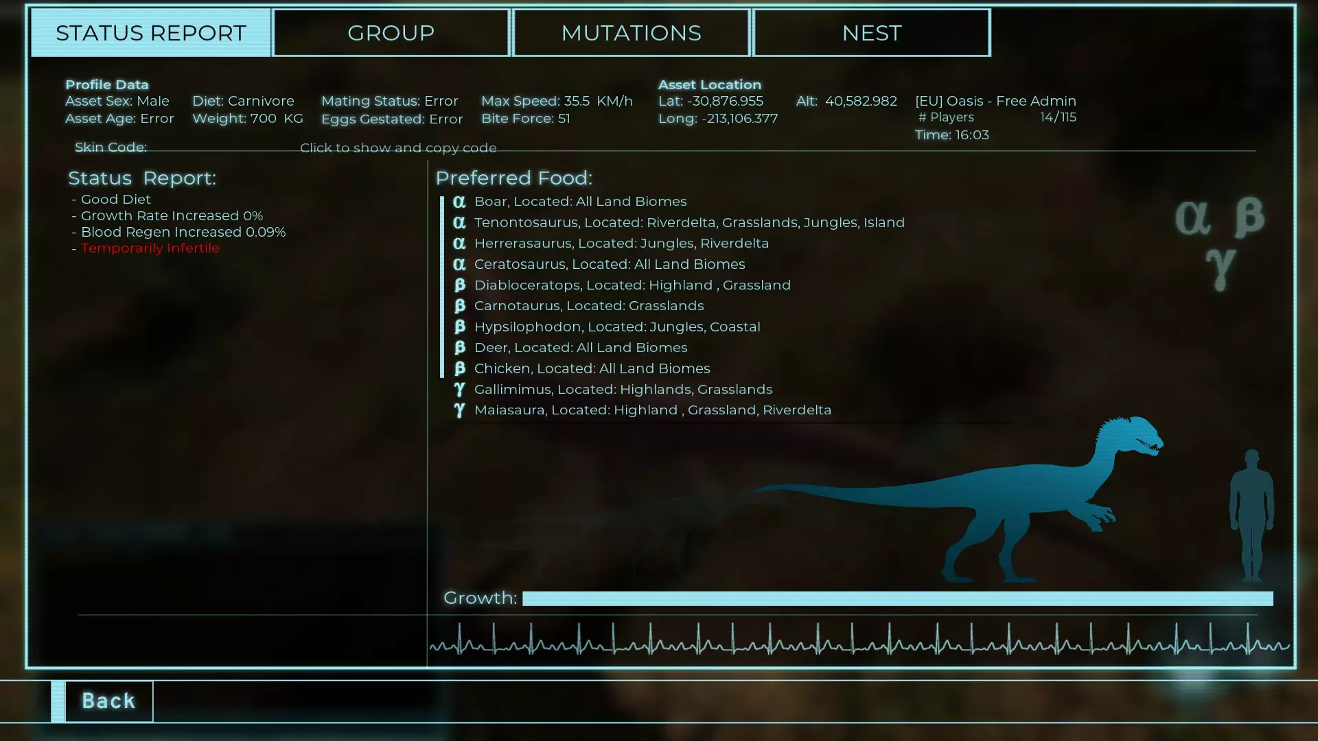体力:535 攻击力:15 踢击:42 Alt攻击力:54 步行速度:36km/h 疾跑速度:34.2km/h 疾跑速度(营养加成):40.3km/h 体重:535 Herrera 龙 【Prime Elder】 【全盛期(87.5%)】