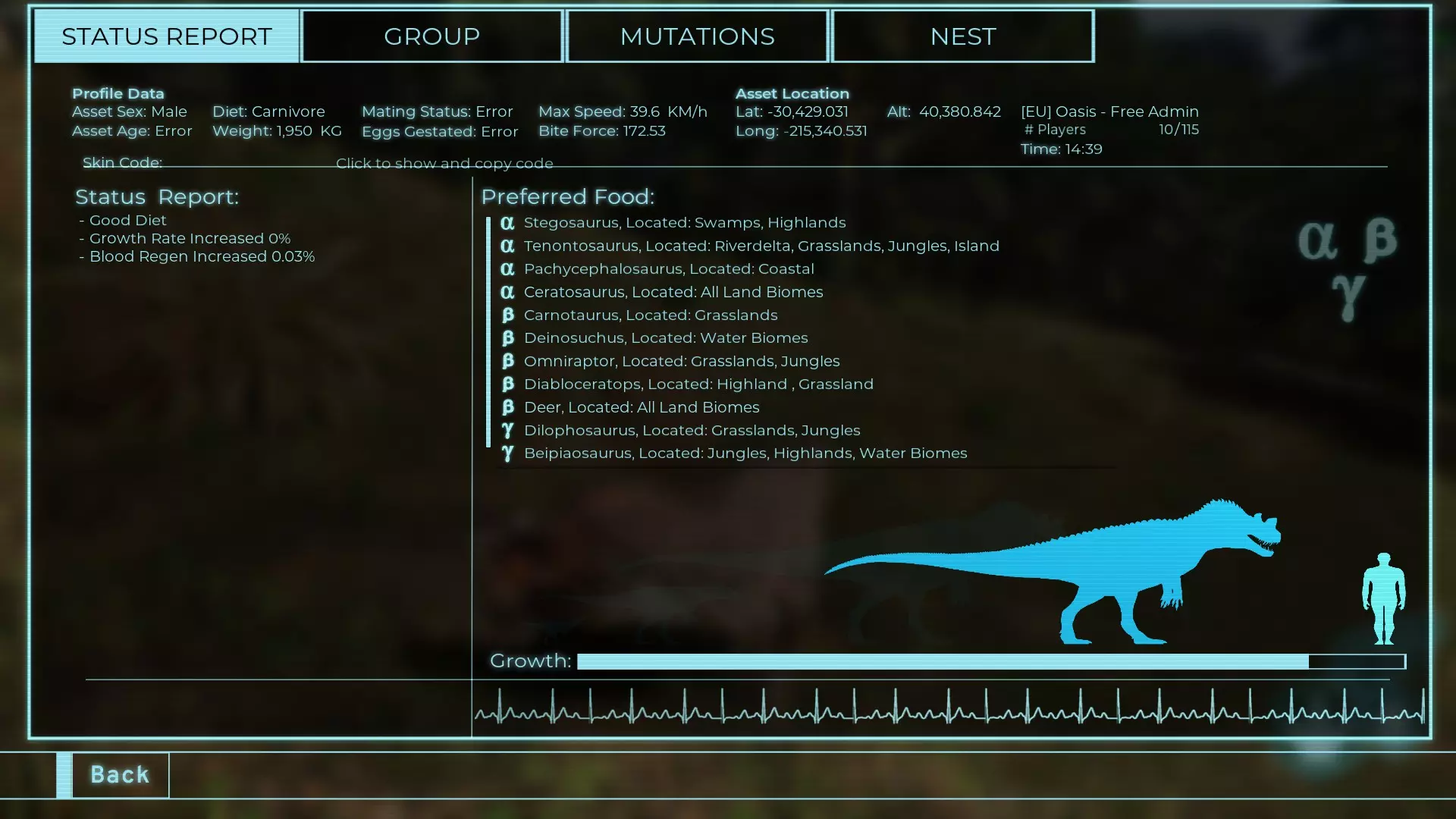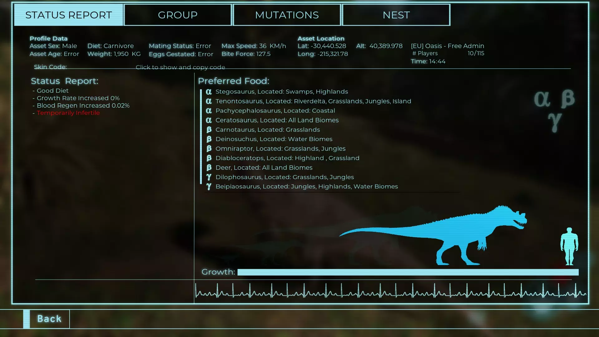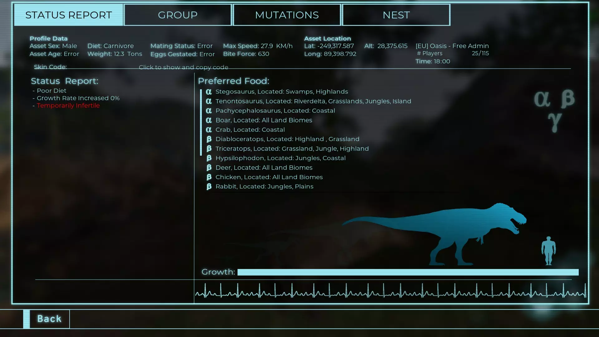 体力:1950 攻击力:172.5 Alt攻击:230 蓄力啃咬:180~396 步行速度:18.8 疾跑速度:39.6km/h 体重:1950kg 【衰退期】