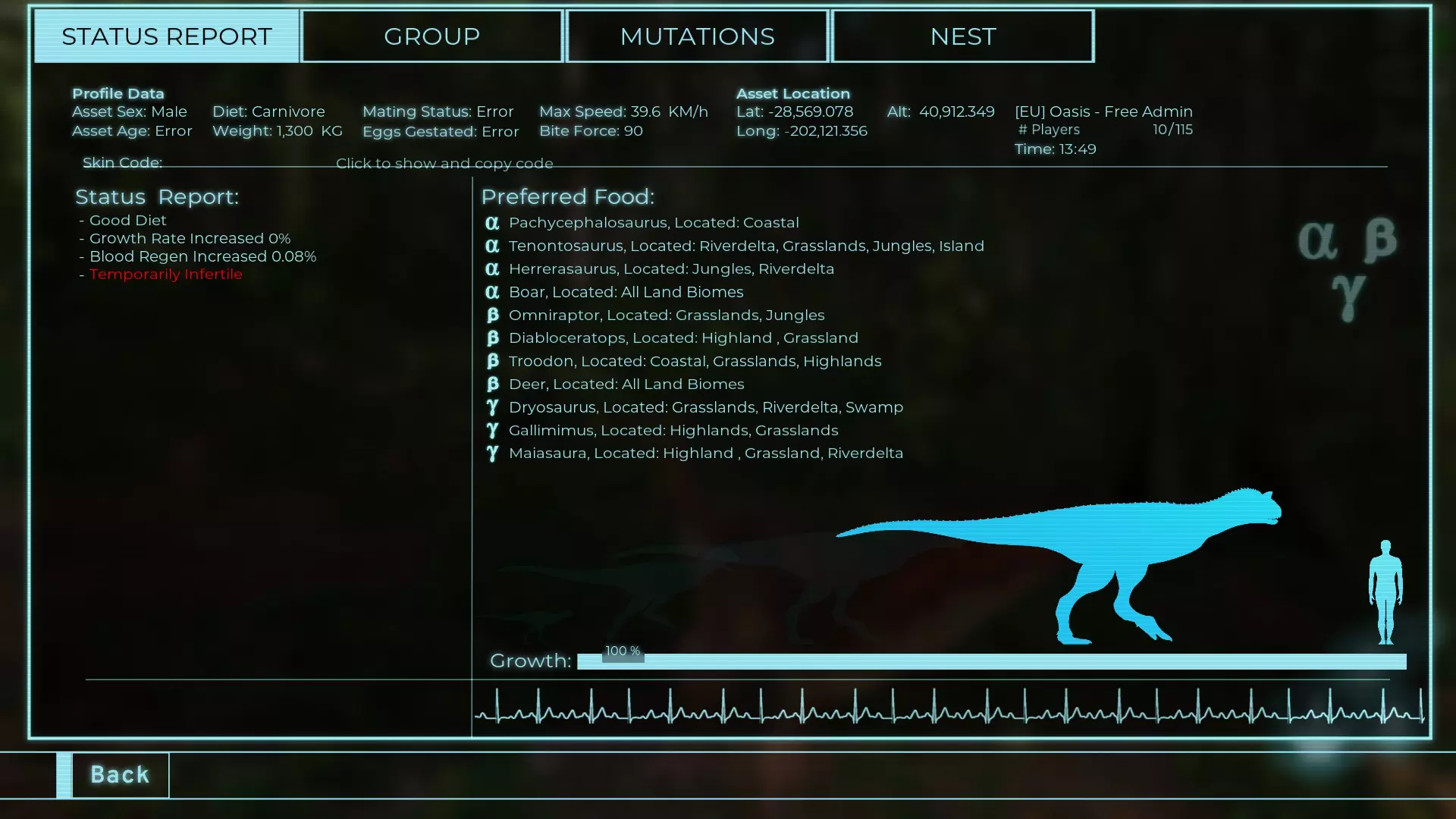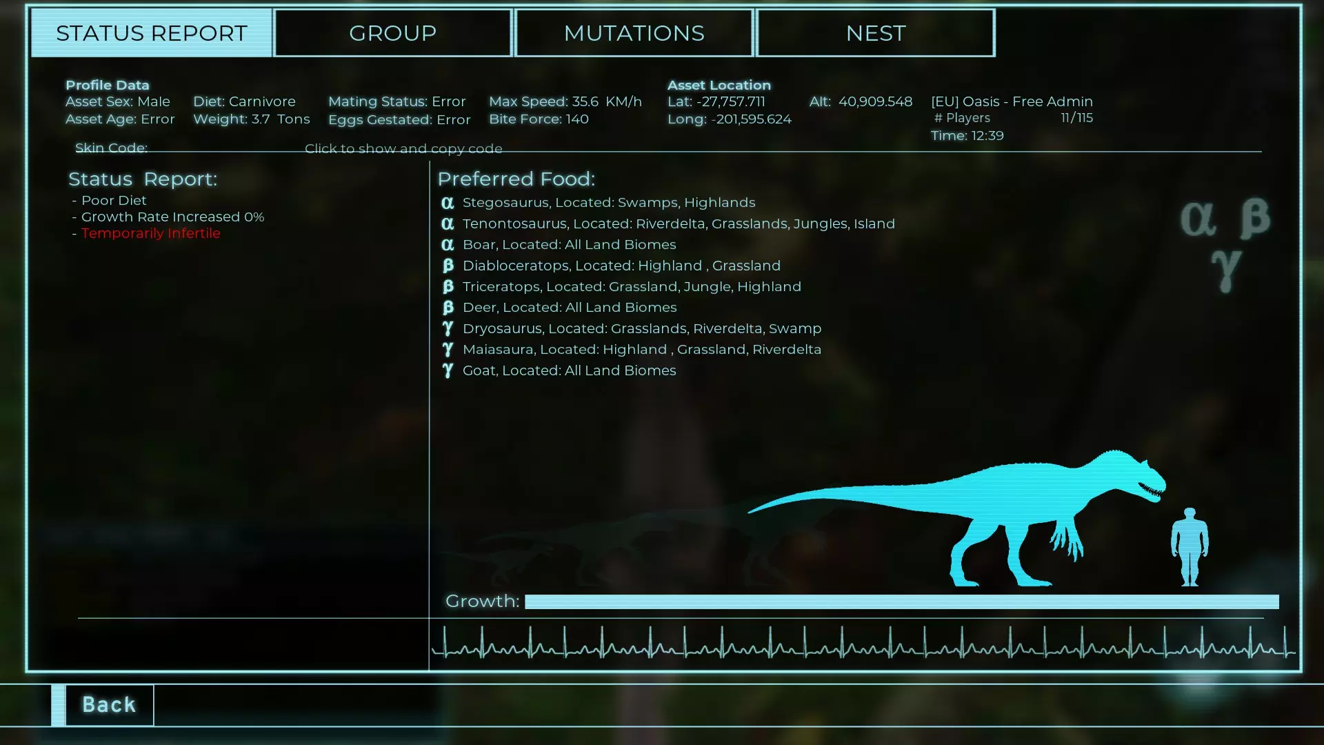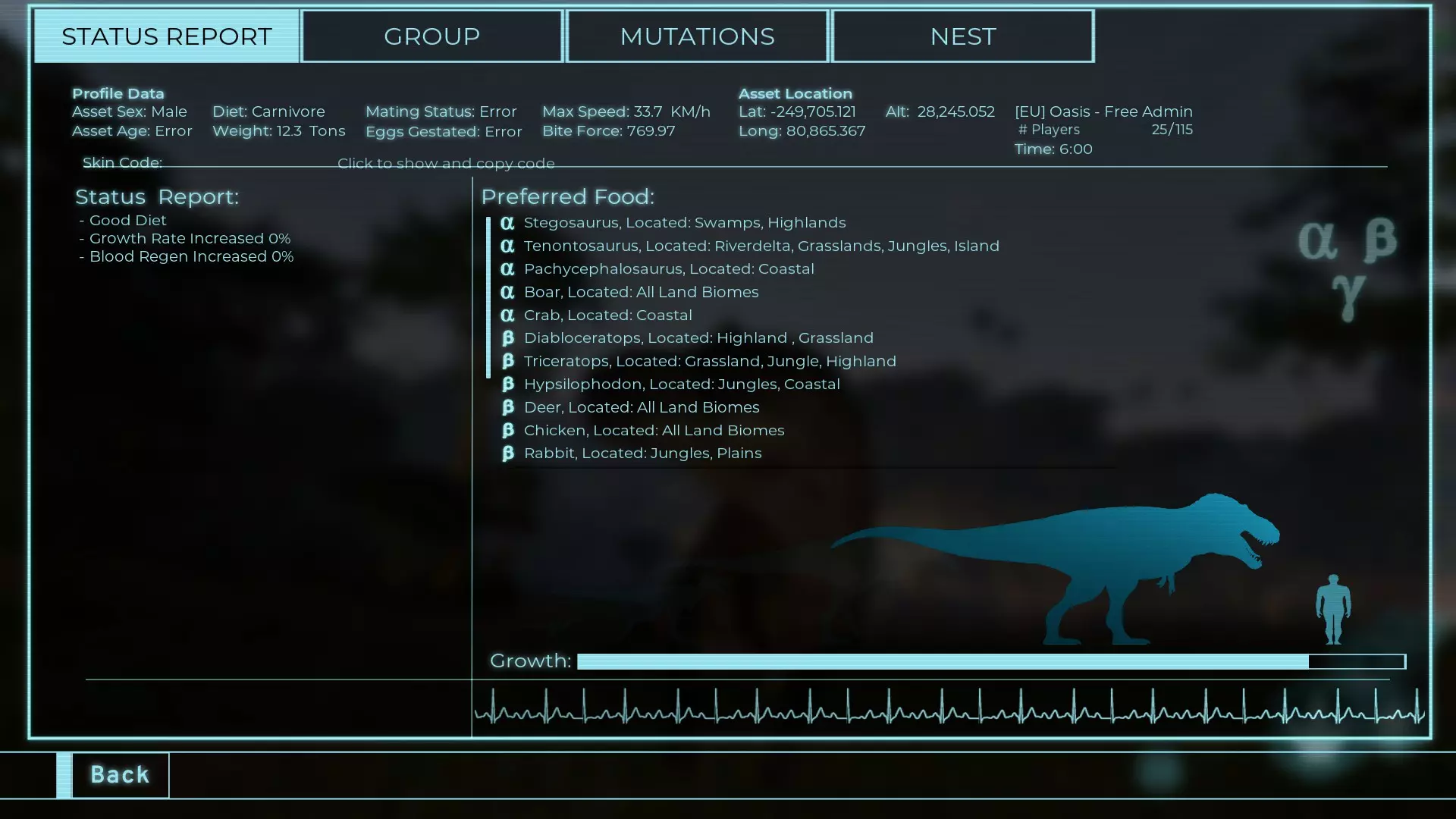 体力:1950 攻击力:172.5 Alt攻击:230 蓄力啃咬:180~396 步行速度:18.8 疾跑速度:39.6km/h 体重:1950kg 【衰退期】