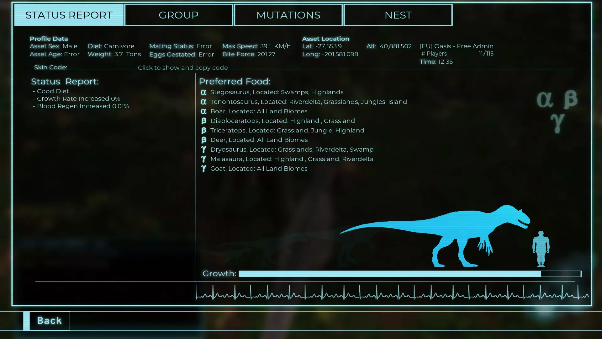 体力:10900 攻击力:574 Alt攻击:574 抓取:402 步行速度:7.7km/h 疾跑速度:19.8km/h 体重:10.9t 【衰退期】100%