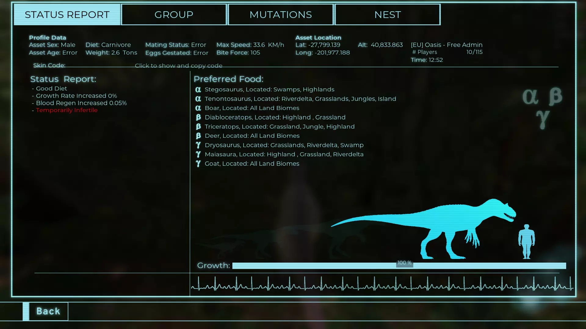 体力:560 攻击力:28.7 踢击:80 Alt攻击力:103 步行速度:36km/h 疾跑速度:54km/h 疾跑速度(营养加成):62.7km/h 体重:560kg 【衰退期】(100%)