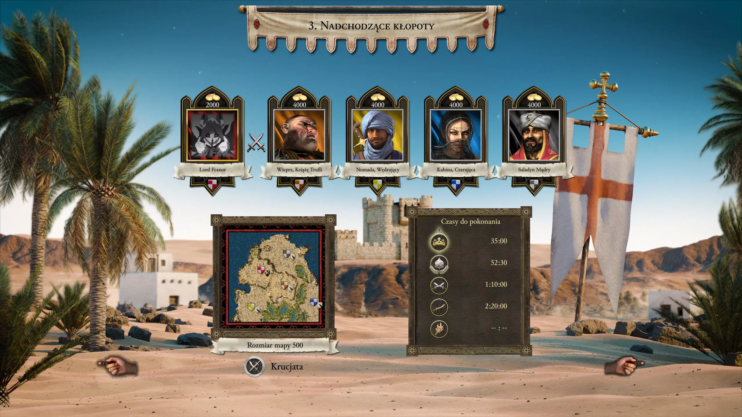 本次任务需要精心准备才能以最快速度完成。我们的对手是萨拉丁、皮格、卡希娜和游牧民族。 该怎么做,又该如何开始呢? 将你的储备库建在靠近铁矿的位置,这将显著提升我们的经济。你也可以训练一些猎人来获取早期的肉类资源。和第二个任务类似,要优先发展小麦生产,并购买啤酒以获得声望加成。大致思路就是这样。
