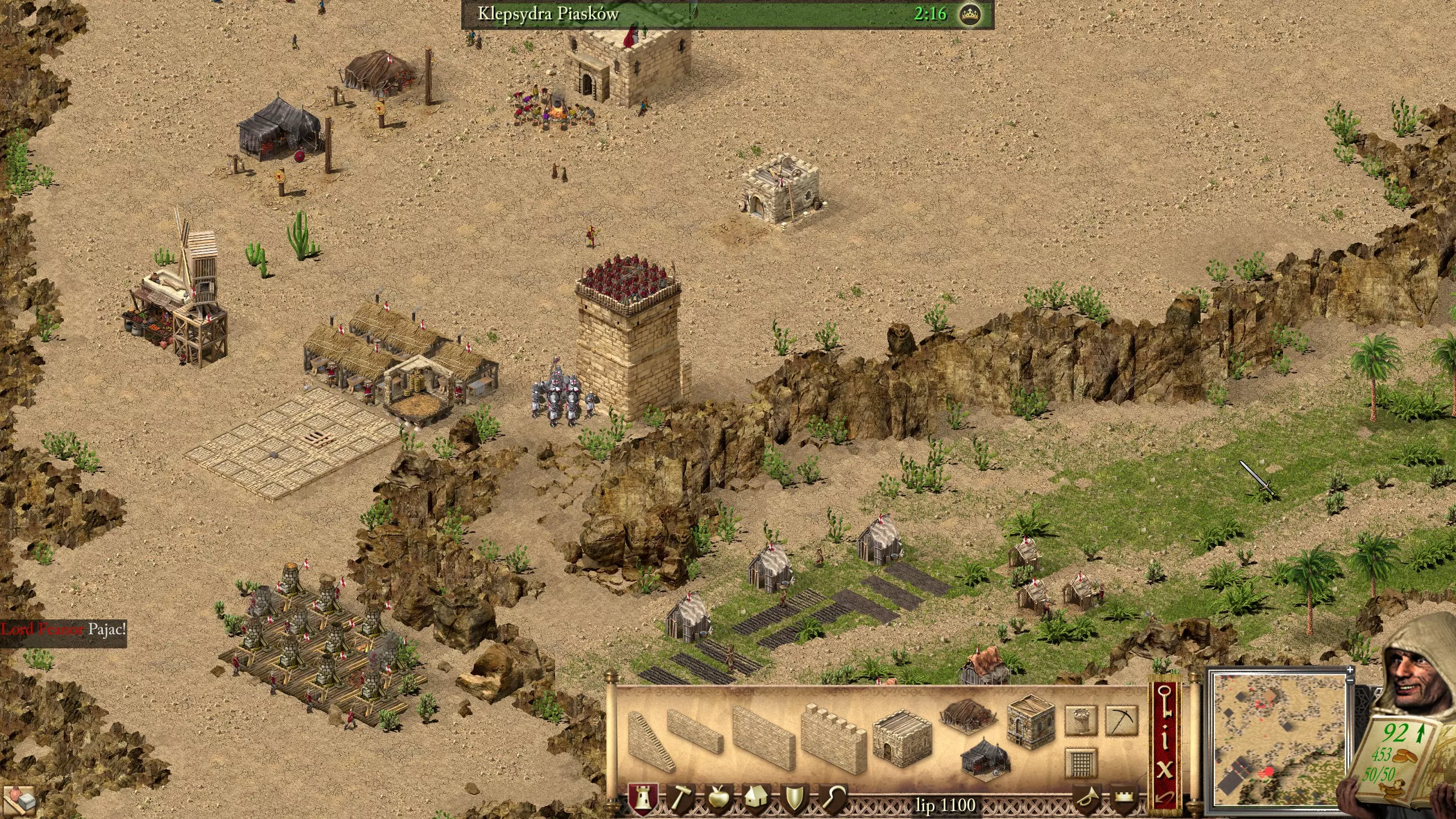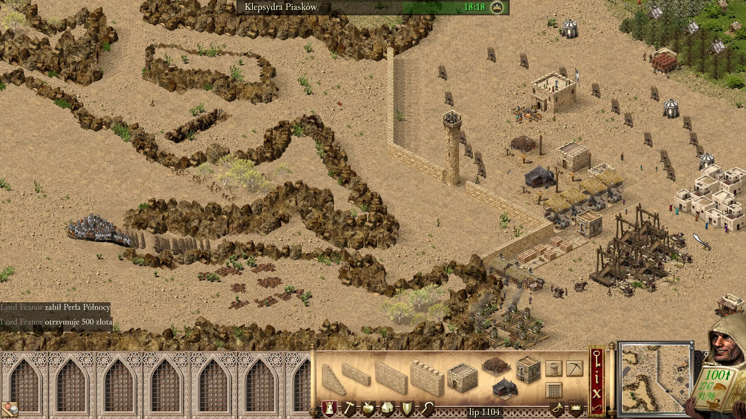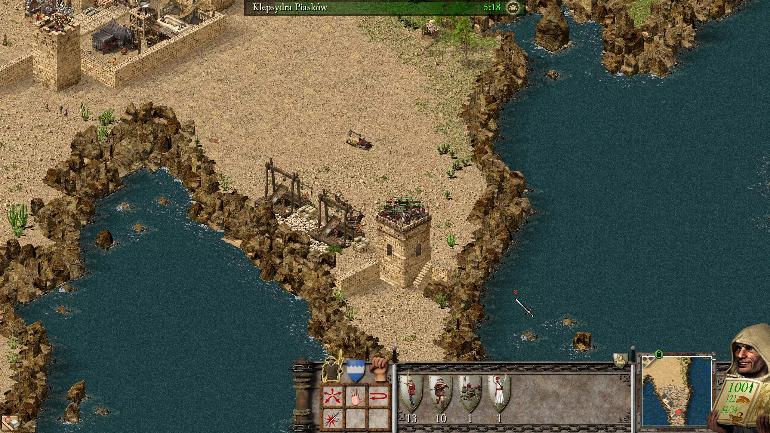 这个任务有点棘手,但并不难完成。我们要面对哈里发、苏丹和珍珠。 该怎么做,又该如何开始呢? 像往常一样,将你的储备库移到资源附近是个好主意,这能节省我们很多时间。另外,最好在绿色区域开始苹果生产,并把粮仓搬到那里。别忘了像下图所示那样用城墙围住你的要塞。你也可以将部队(初始弓箭手、10名弩手和1名治疗师)堆叠在瞭望塔上,方法很简单,只需平整地形,然后将部队叠放在一起。如果地形固定好了,你就可以建造一个更大的塔楼,并在上面安装弩炮。