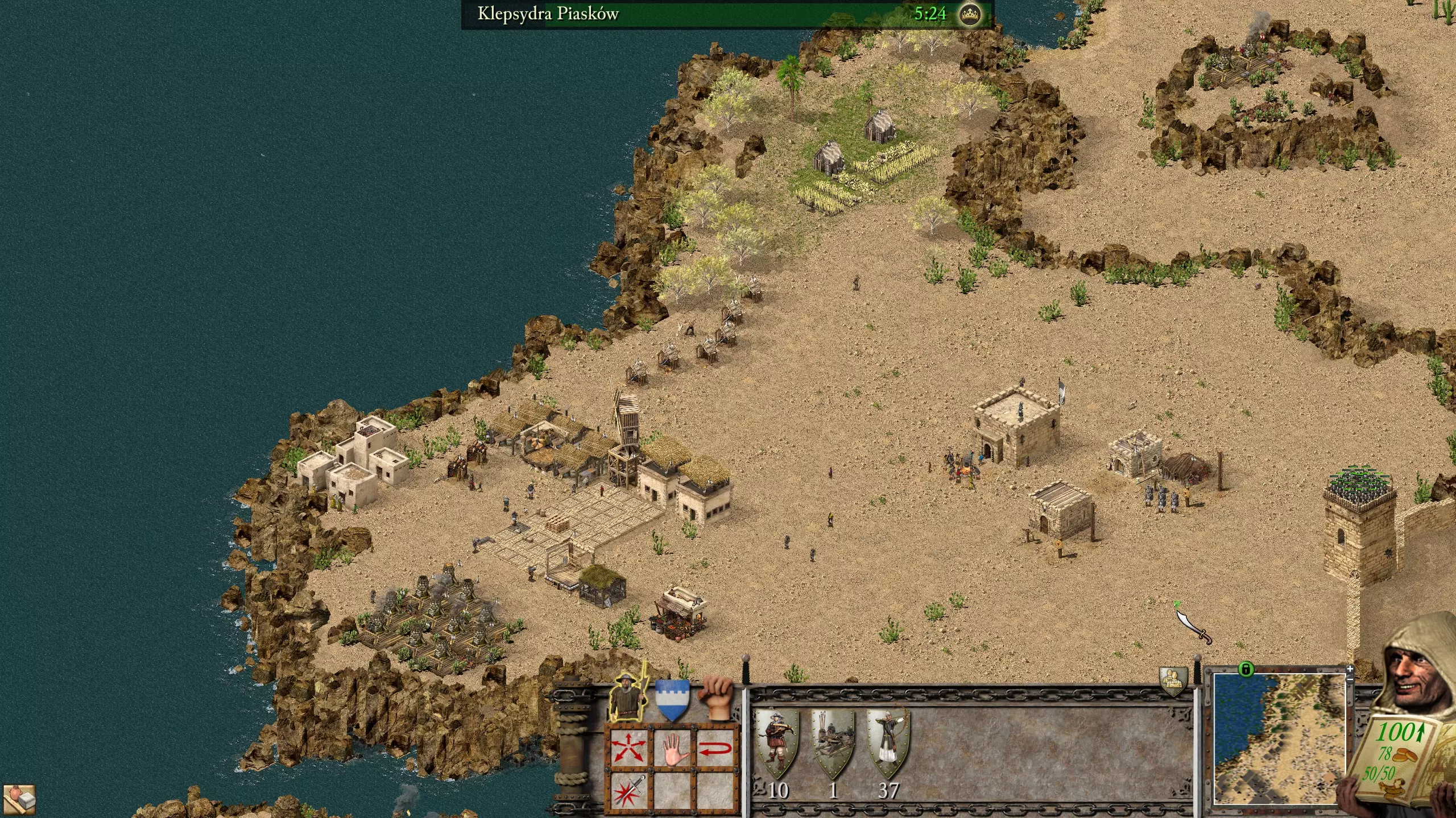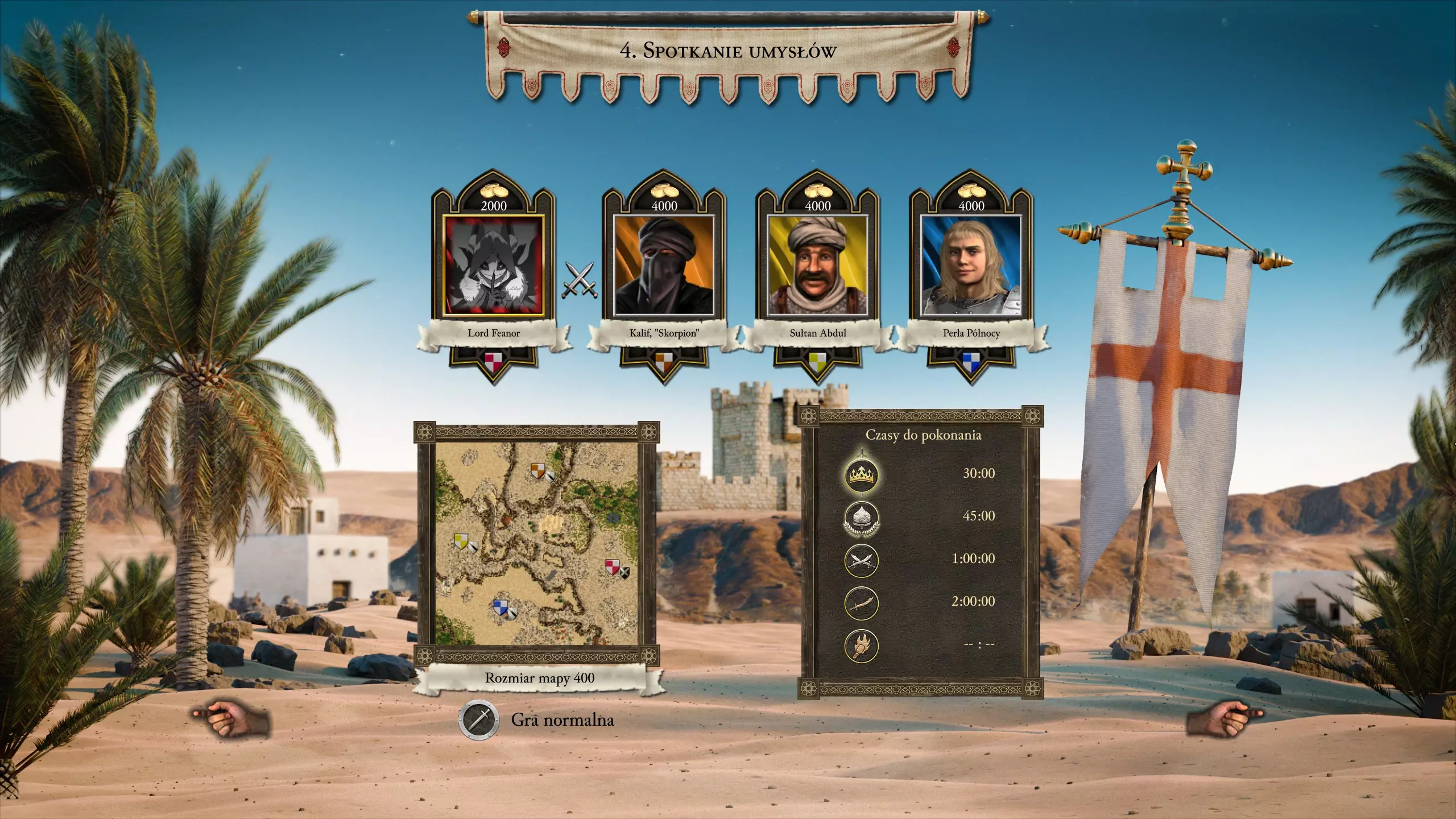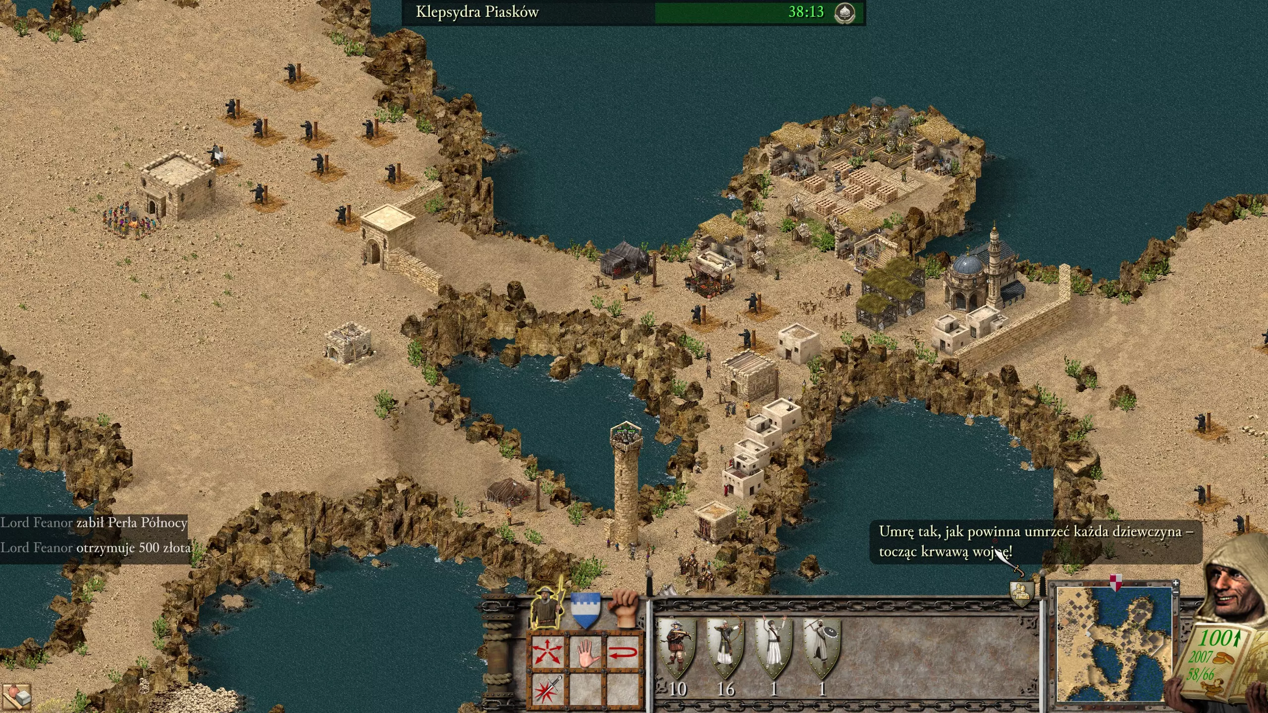 进攻方面,我建议快速解决中间的猪阵营。几名配备便携盾牌的骑射手就能完成任务;要警惕从猪阵营城堡冲向你军队的链枷兵。对于近战单位,要小心刺客。萨拉丁用火焰喷射器烧毁了我整支刺客军队,因为我忘了这回事(笑)。不过如果你没猜到的话,解决猪阵营后,就开始骚扰萨拉丁,因为他正在缓慢建造城堡,但他仍然很危险,所以要小心。50名配备便携盾牌的骑射手,加上30到50名刺客,应该能完成任务。解决萨拉丁后,剩下的就很容易对付了,但要让你的军队越来越壮大。 任务4 - 思想的交汇 沙漠王子用时:30:00 我的用时:24:14