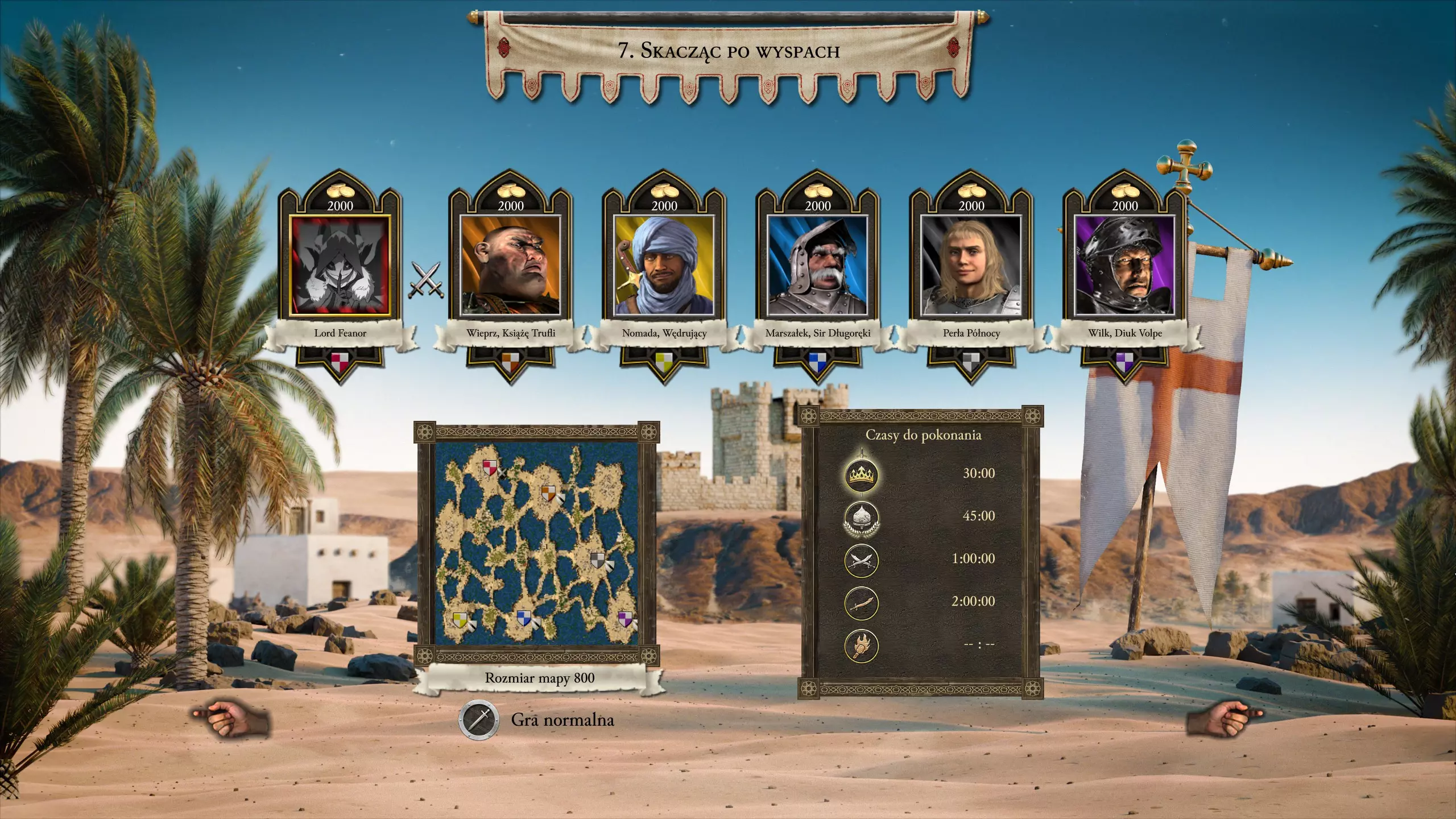 此外,你必须建造带有围墙的封闭要塞。否则,游牧民族会摧毁你城堡里的所有建筑。我还建议建造几个伐木场,以此引诱部分游牧民族单位攻击它们,而不是攻击你的城墙。 在进攻方面,只需用你的骑射手或任何能快速射箭且射程超过他们散兵的单位开始骚扰游牧民族。如果你能挺过他们的早期攻击,这应该不成问题。 第七关 - 岛屿跳跃 沙之王子用时:30:00 我的用时:38:18(我浪费了太多时间)