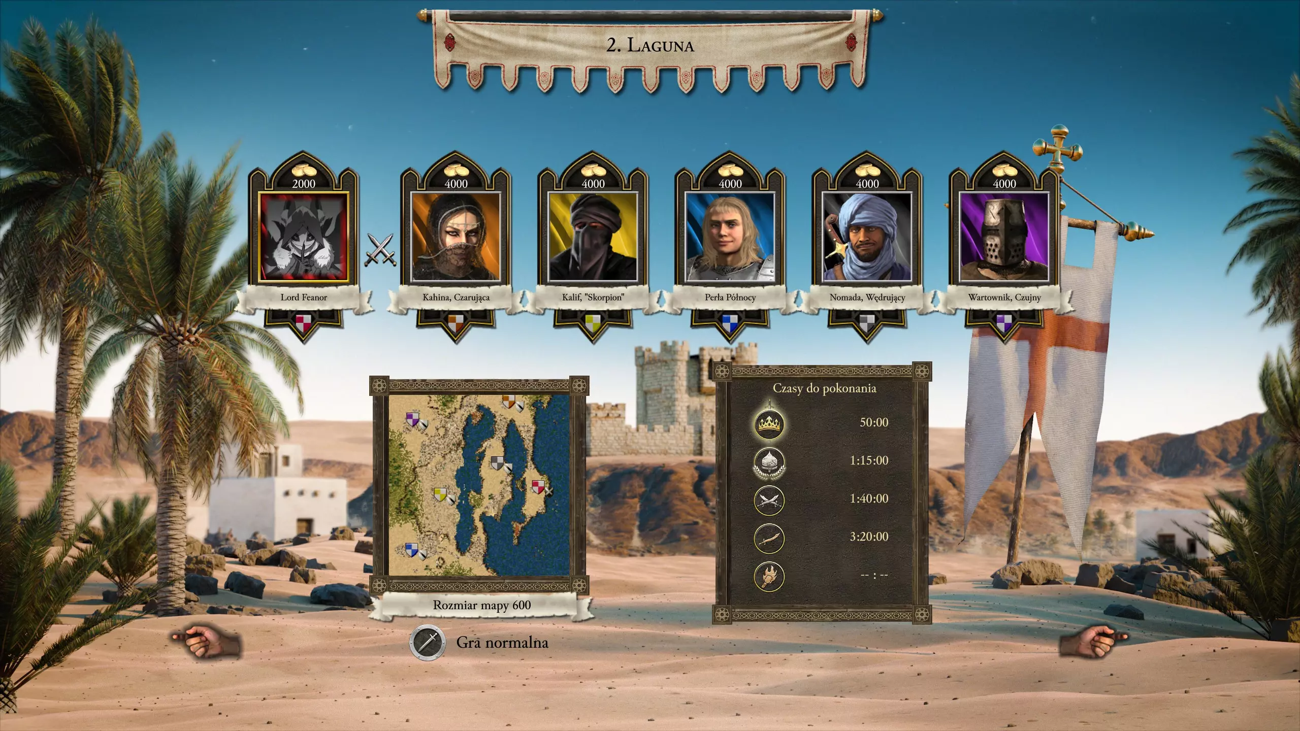 进攻方面,100名骑射手和50个便携盾牌应该足以应对所有敌人。鼠辈不足为惧,无需担心。近战单位可以尝试刺客或链枷兵,两者都很出色,别忘了部署一些跳舞熊来提升恐惧值,这能为你带来战斗加成。 任务2 - 潟湖 沙之王子用时:50:00 我的用时:41:07