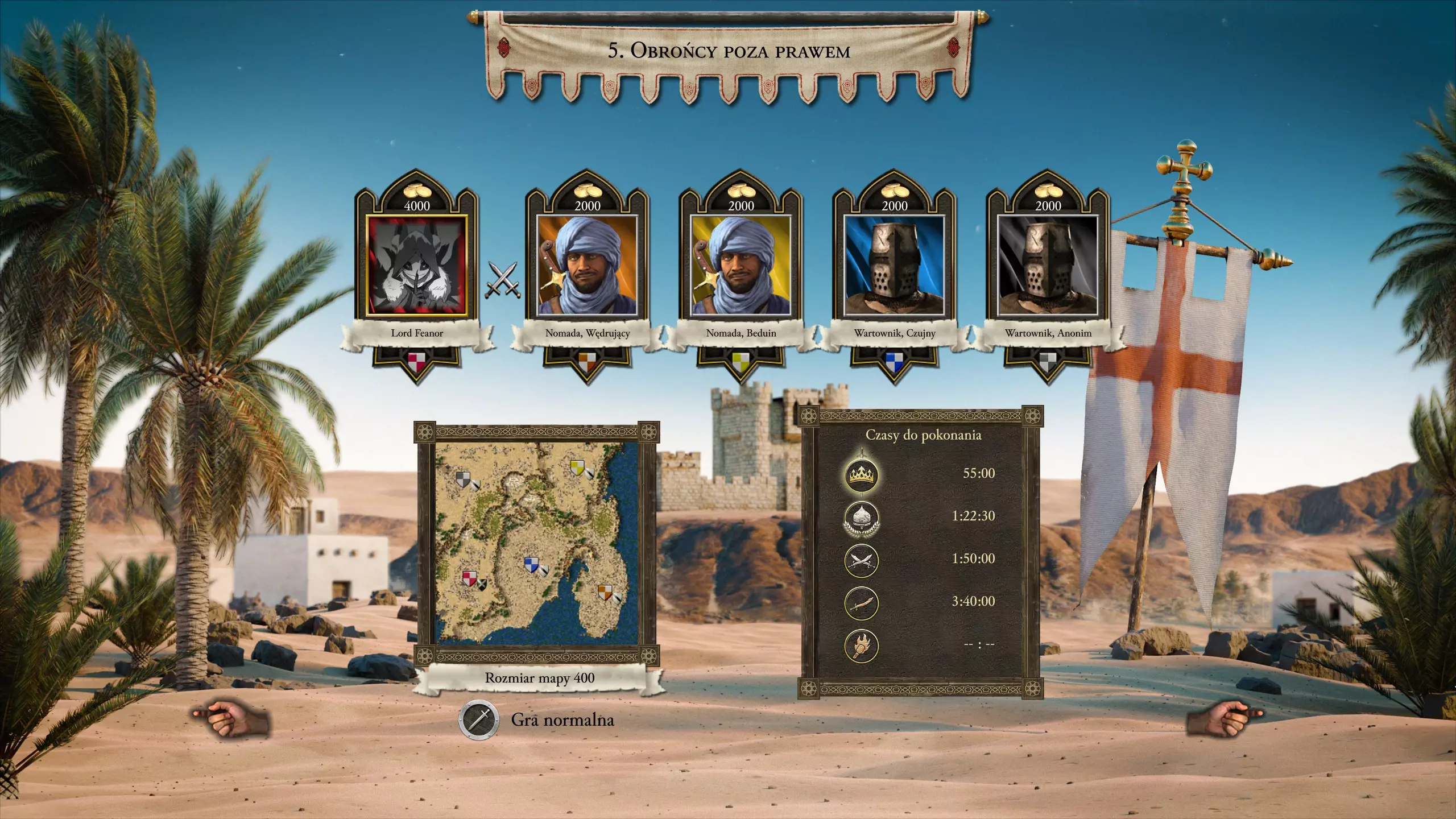 关于进攻,我建议先对付佩儿,派遣一些骑射手和少量盾牌兵去骚扰她。你的经济应该足够支撑购买一些链锤兵,30-40个应该足以对付被削弱的佩儿。别忘了额外招募盾牌兵和骑射手。解决佩儿后,就可以开始进攻苏丹和哈里发了(60-100个骑射手、50个盾牌兵、30-50个链锤兵应该足够)。 任务5 - 叛逆守护者 沙漠王子用时:55:00 我的用时:21:19