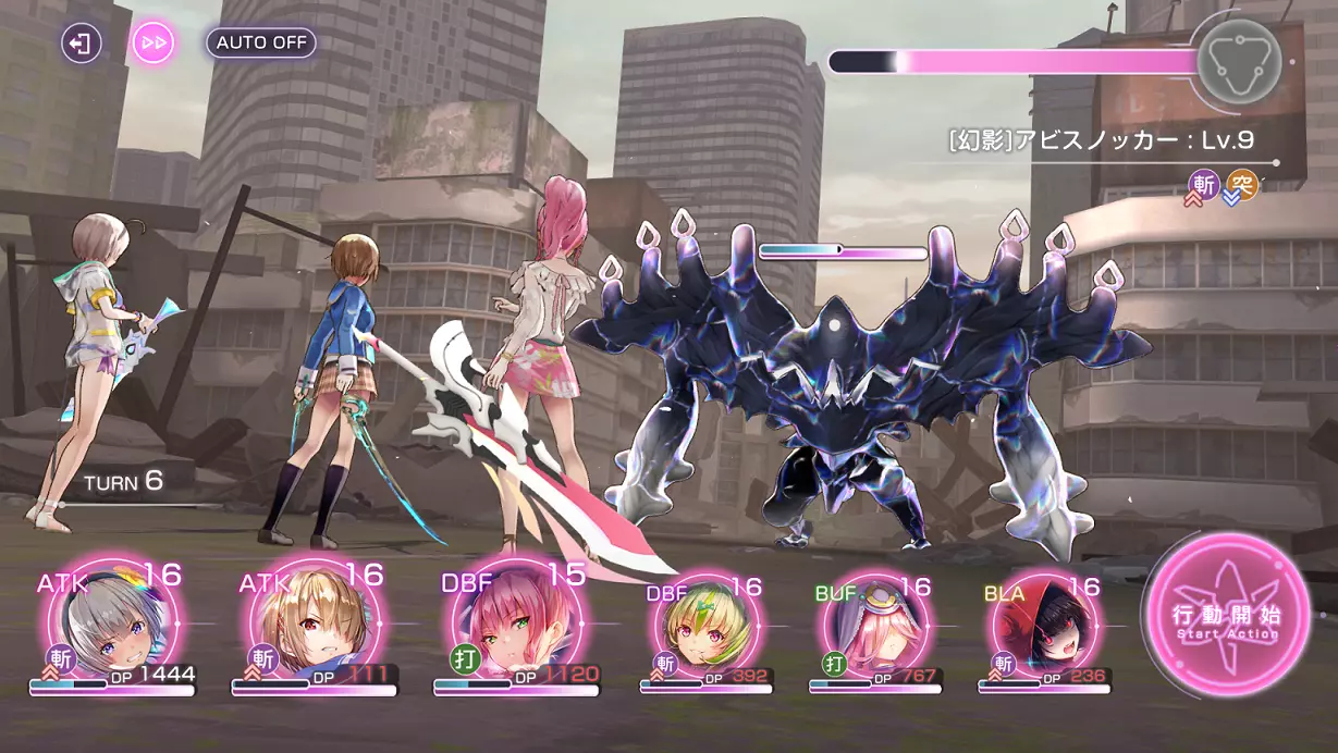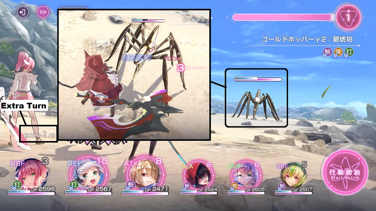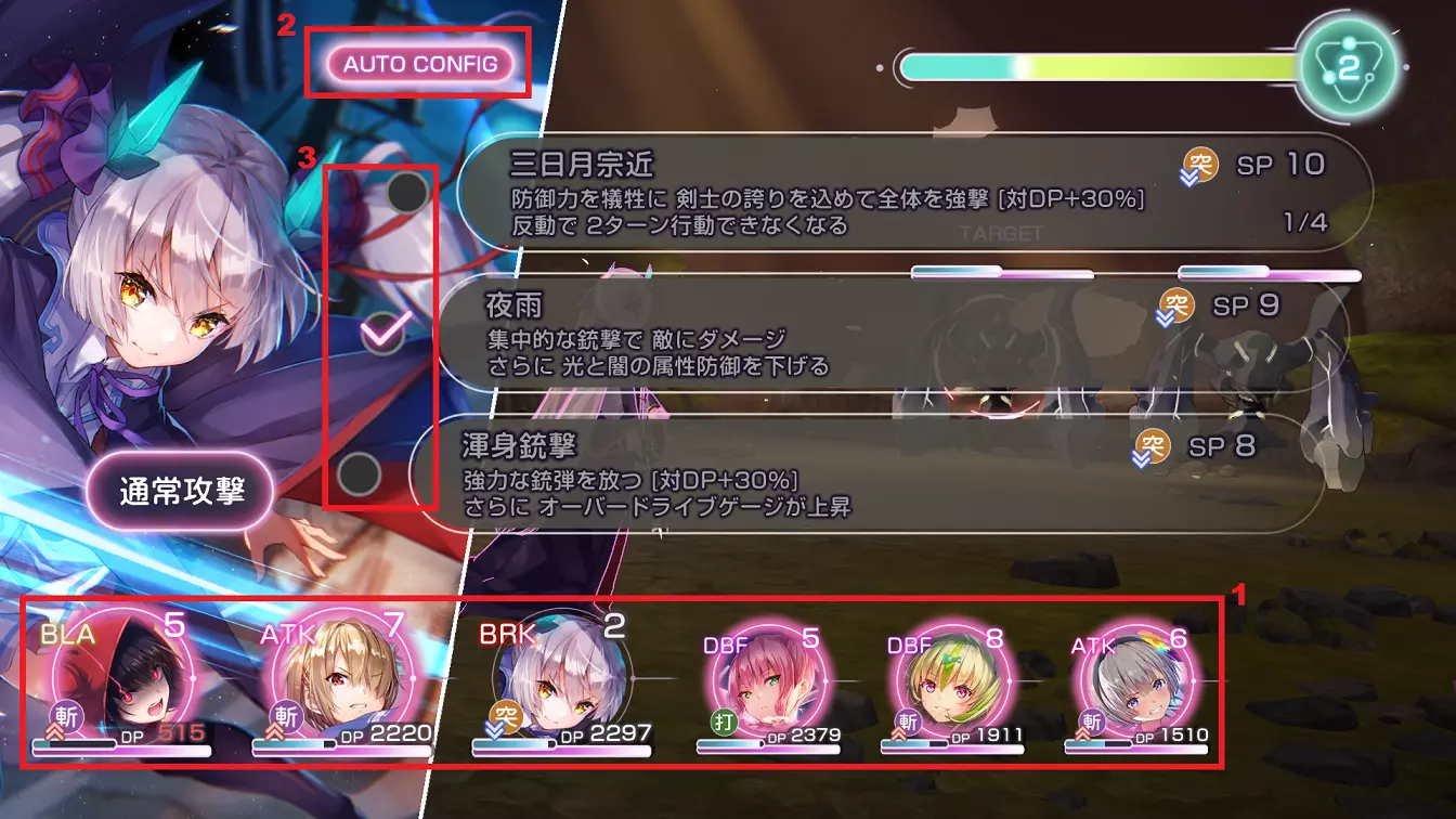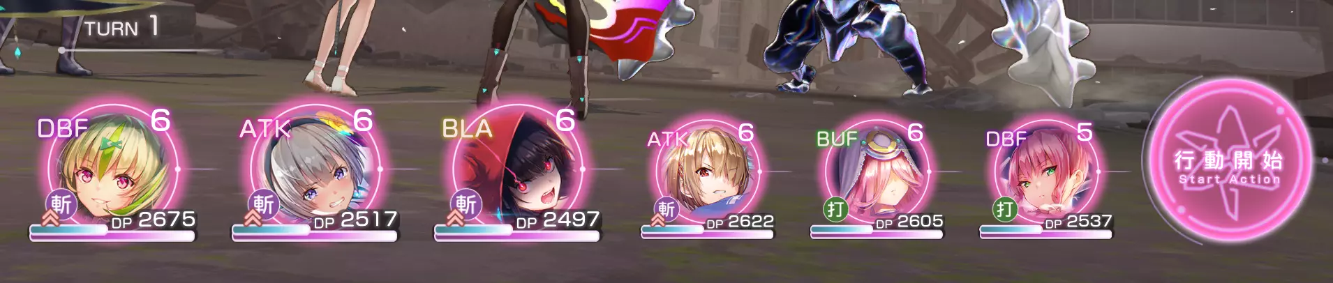 在第6回合前(或直到所有队员都能释放终极技能且过载计量条接近满值时)一直使用普通攻击。 每回合切换为更高DP的角色,因为此处不使用恢复技能。 注意:使用对首领战没有抗性的角色。