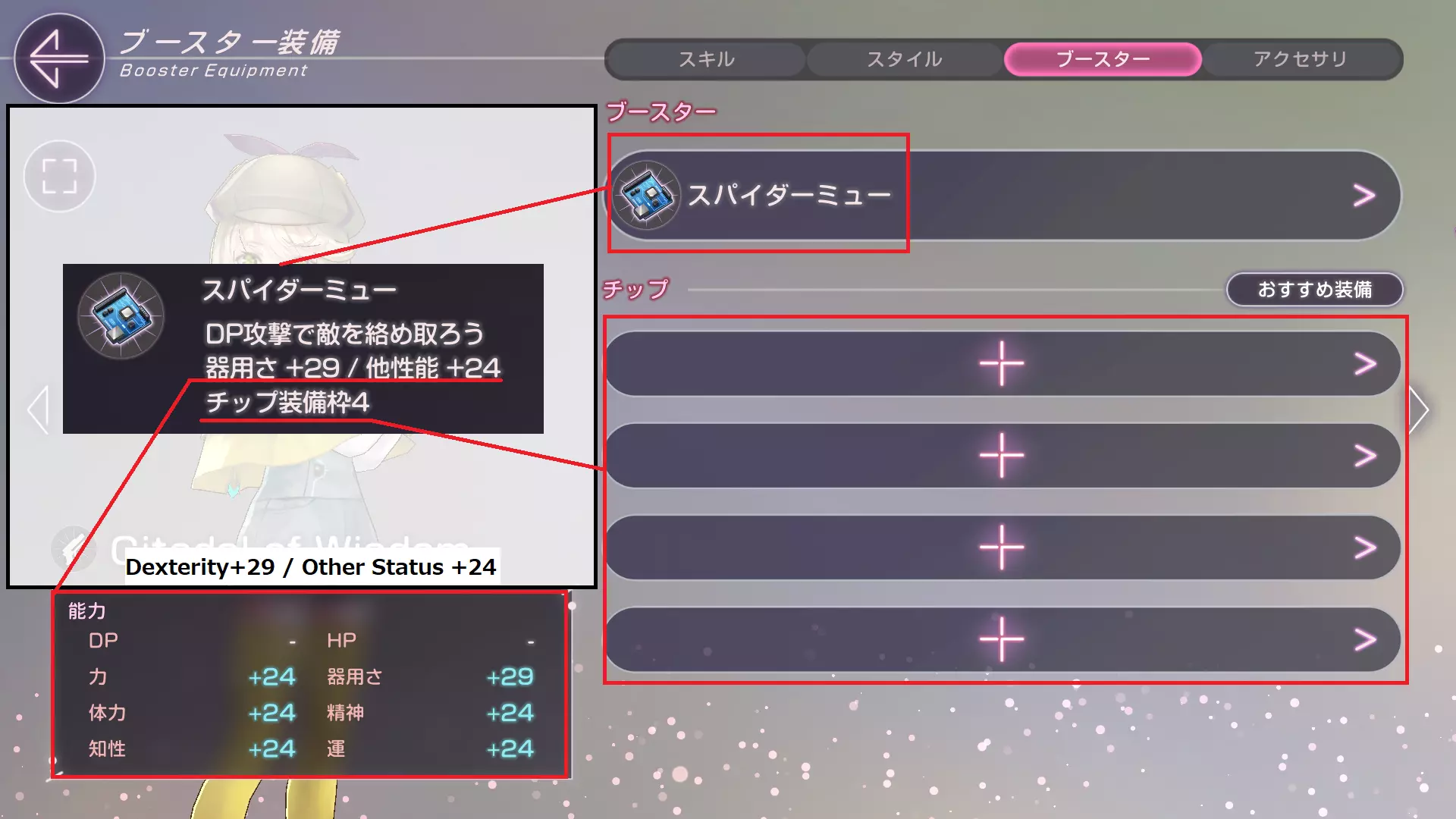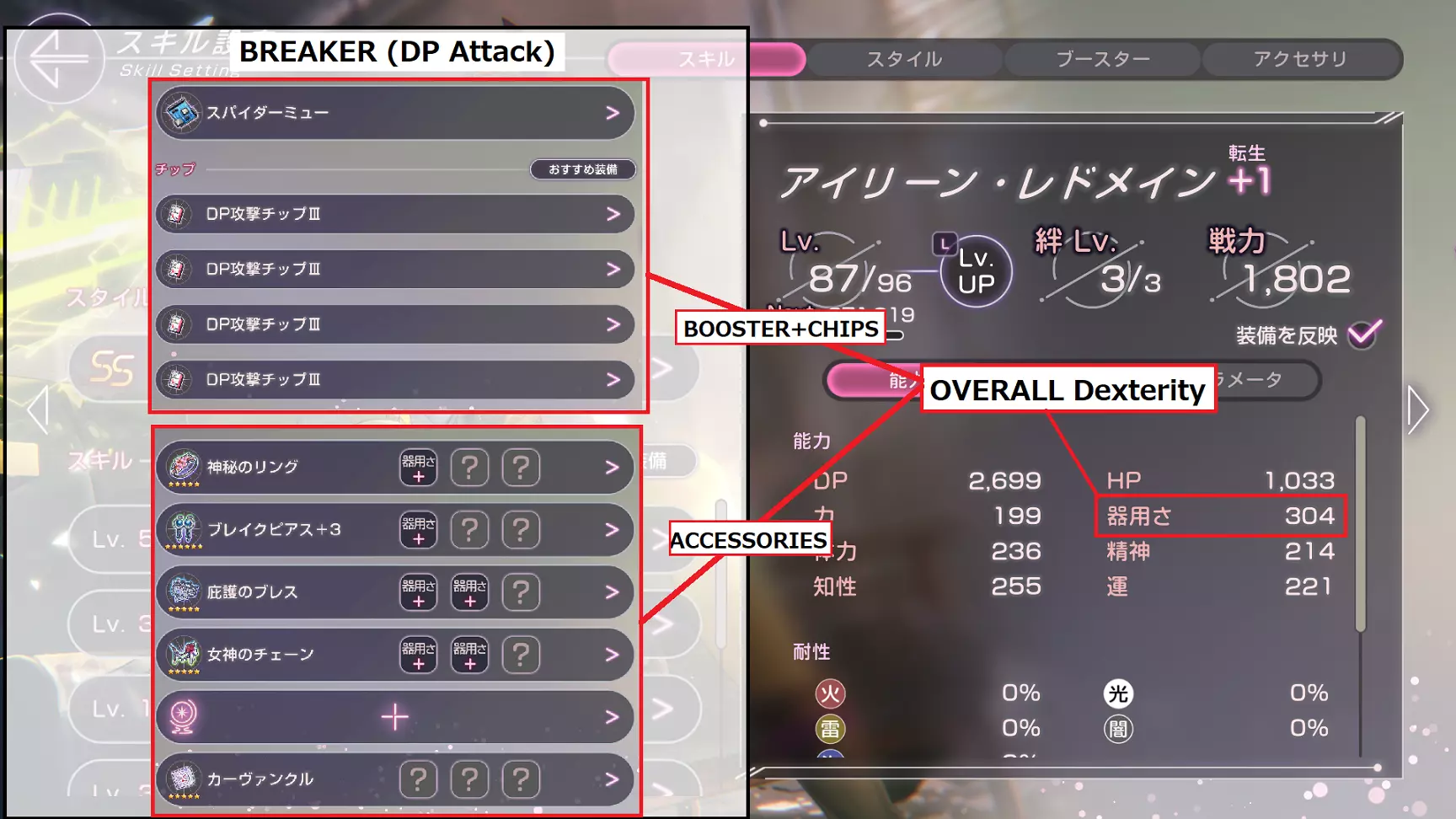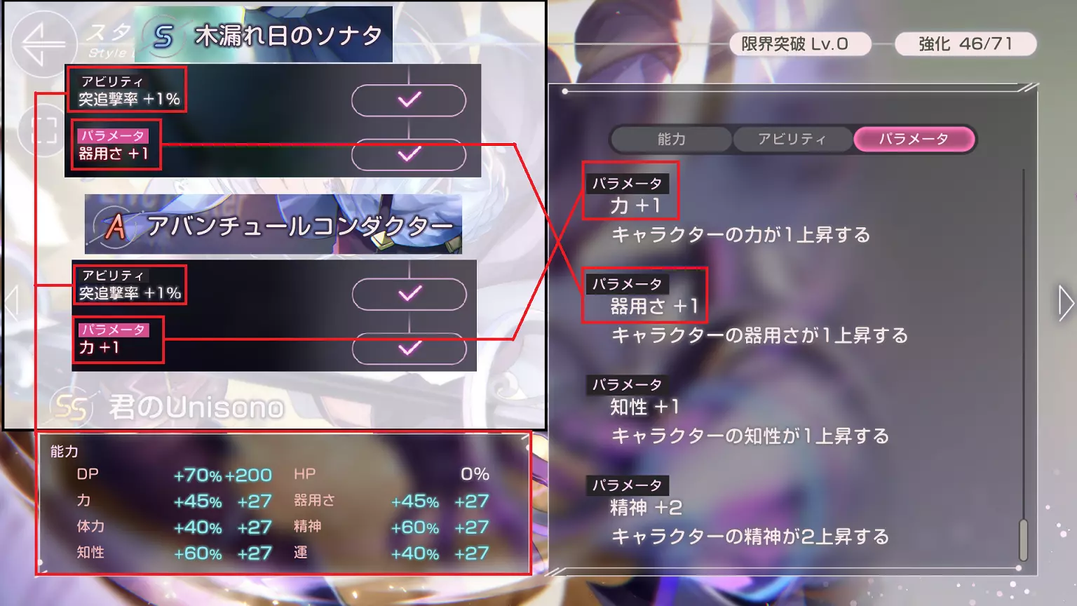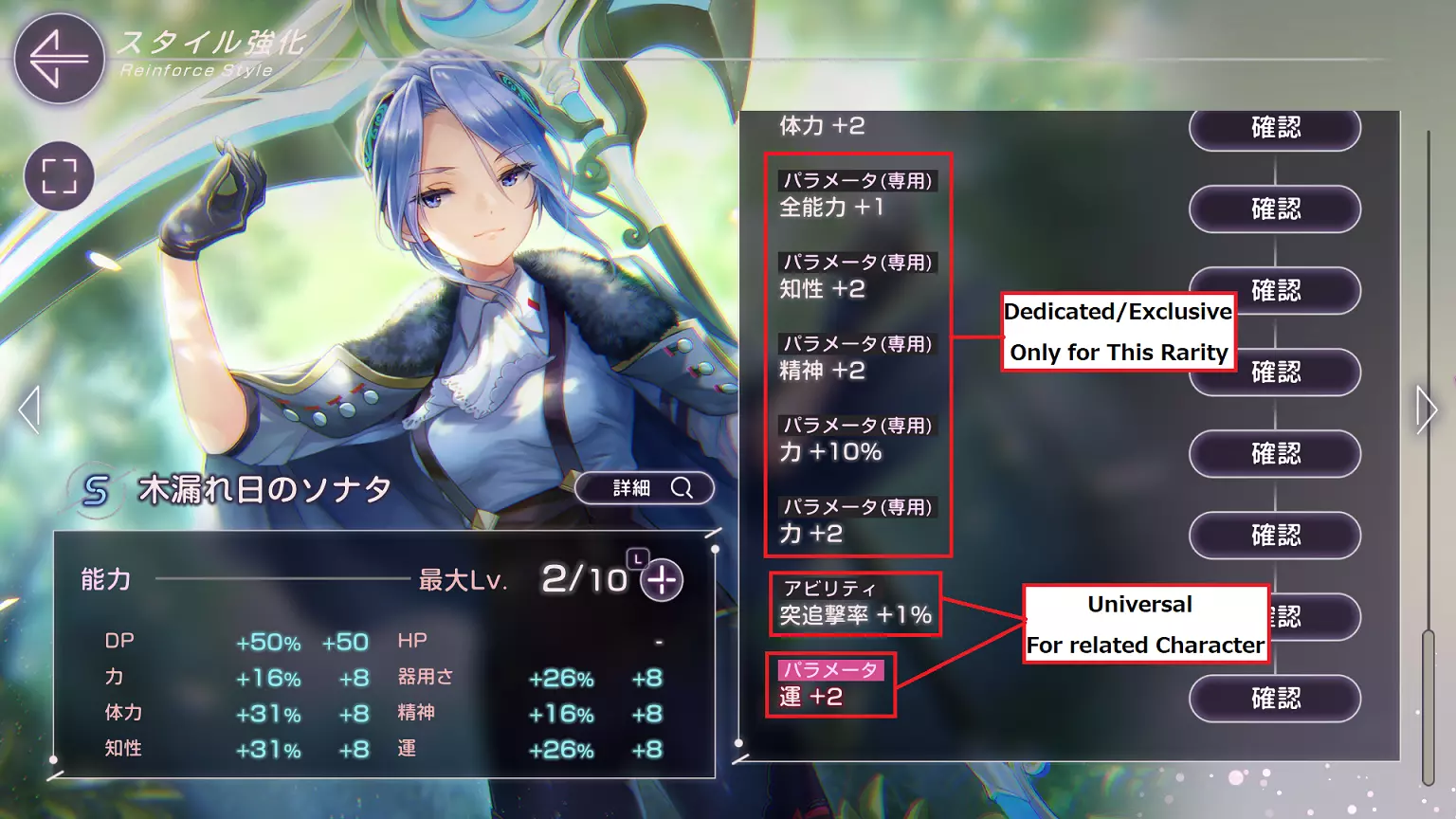 如标题所示。本指南将介绍笔者所了解的基本游戏玩法。包含轻微剧透。请自行决定是否阅读! 更新说明 2022年9月6日 - 更改指南图标 - 新增【能力相关】章节 - 修正【角色相关】章节中的错误信息:[A加2改为A加1] - 修复部分错别字 2022年9月7日 - 新增【 Boss 战】章节 - 新增【更新说明】章节 - 更新DP+1和Break恢复的相关信息,适用关卡从[B11、B18、B26]扩展至[B11、B18、B26、B36、B44、B47] - 新增战斗中能量归零时的生命值扣除信息 - 新增B3关卡每回合10% DP恢复(Reguard)的信息 - 修复部分错别字 2022年9月9日 - 在【角色相关】章节中新增专属饰品内容 - 在【角色相关】章节中新增卢卡的专属饰品内容将爆破者信息从【破坏后造成伤害条件】修改为【破坏状态下增加敌人受到的伤害百分比(xx.xx%)】 修复部分错别字 2022年9月15日 修复部分被系统移除的图片 在技能升级处添加【推荐战斗力】和【物品掉落】 在【闲置战斗】部分添加如何提升【竞技场闲置时间】的信息 在【能力相关】部分添加破坏者的能力示例 2022年9月18日 在【角色相关】部分添加【能力参数】 修复部分图片的宽度 2022年9月26日 修复部分被系统移除的图片 添加【竞技场:高级等级】的信息【3概率掉落】位于【自动战斗】部分 能力相关 游戏内使用“Style”(风格)一词,但本指南中统一使用“角色”代替“能力” 游戏内术语翻译说明: DP:偏转值/防御点,用于抵抗敌人伤害,可通过恢复技能恢复 HP:生命值/生命点数,角色的生命状态值,降至0时角色在战斗中死亡,战斗失败(即使仅一名角色死亡,战斗仍失败) 力:力量,影响HP攻击/对HP条造成伤害的属性 器用さ:灵巧,影响DP攻击/对DP条造成伤害的属性 体力:体力,伤害抗性 精神:精神,状态抗性 知性:知性/智力,影响恢复技能效果及负面状态技能成功率的数值 运:运气,未知数值,可能影响暴击相关技能和/或其他效果掉落率。 以下是选择破坏者【DP攻击】能力的示例: 强化器