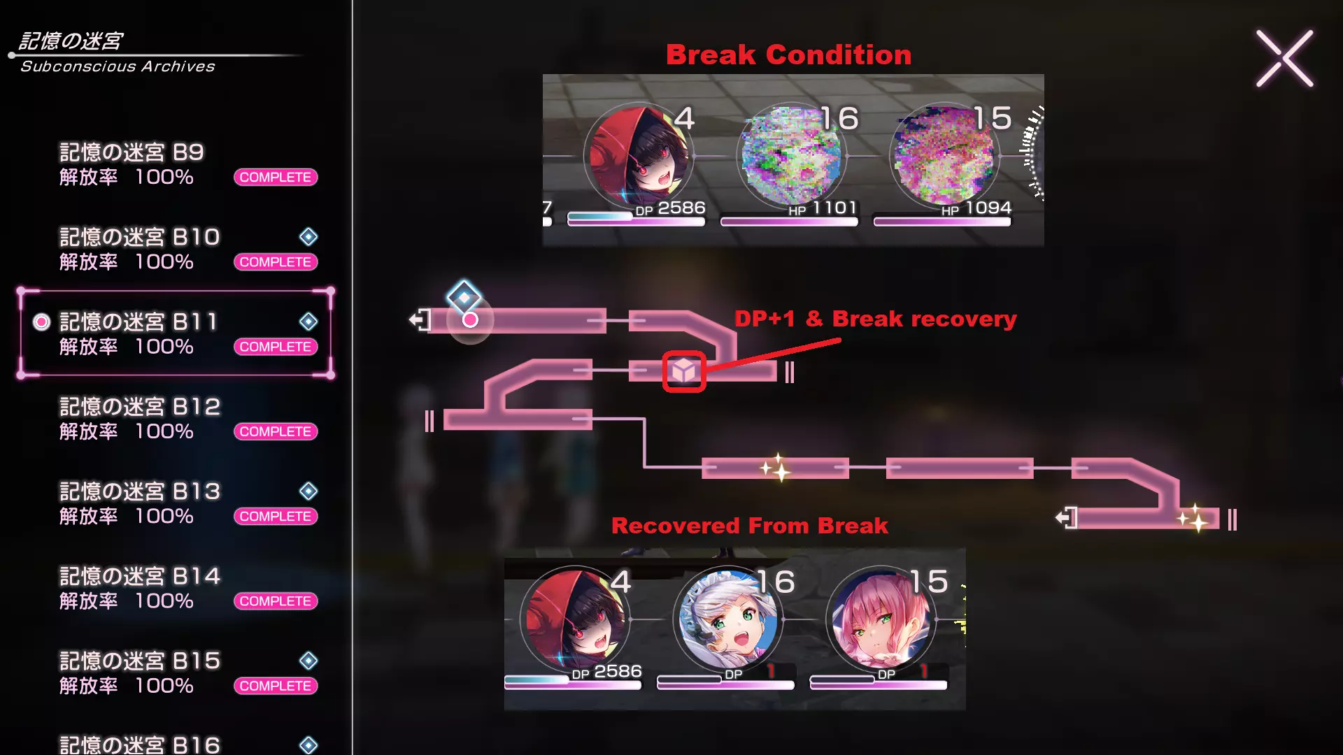 破防状态:当DP耗尽且角色图标闪烁时触发。 若在破防状态下强制使用治疗者为角色治疗,治疗将会【未命中】。 DP+1及破防恢复:B11、B18、B26、B36、B44、B47