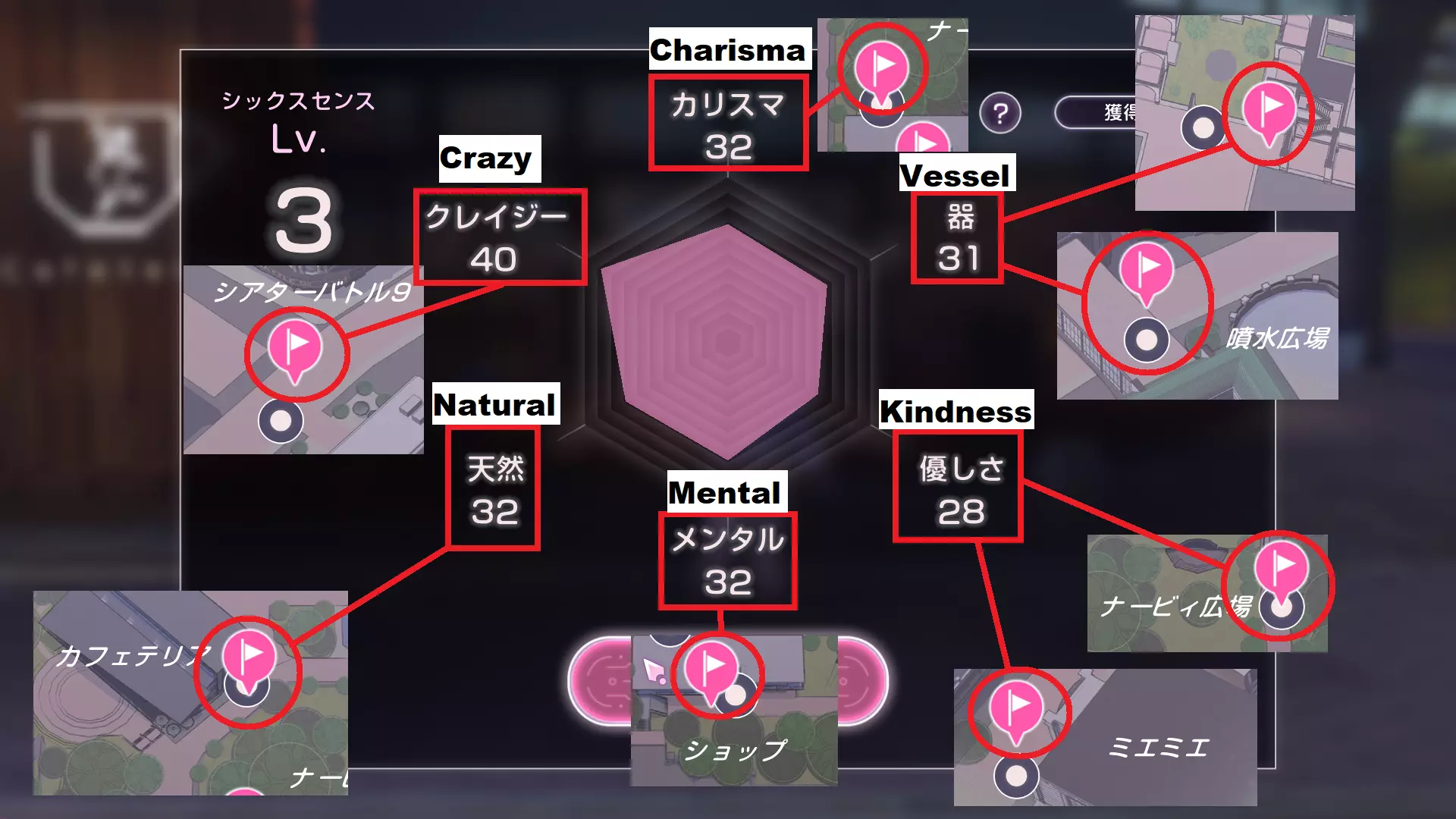 六感 日常地点 周末地点 魅力 工作室乐队 - 容器 图书馆 喷泉广场 善良 纳比广场 米米 精神 健身房 - 自然 自助餐厅 - 疯狂 - 电影院