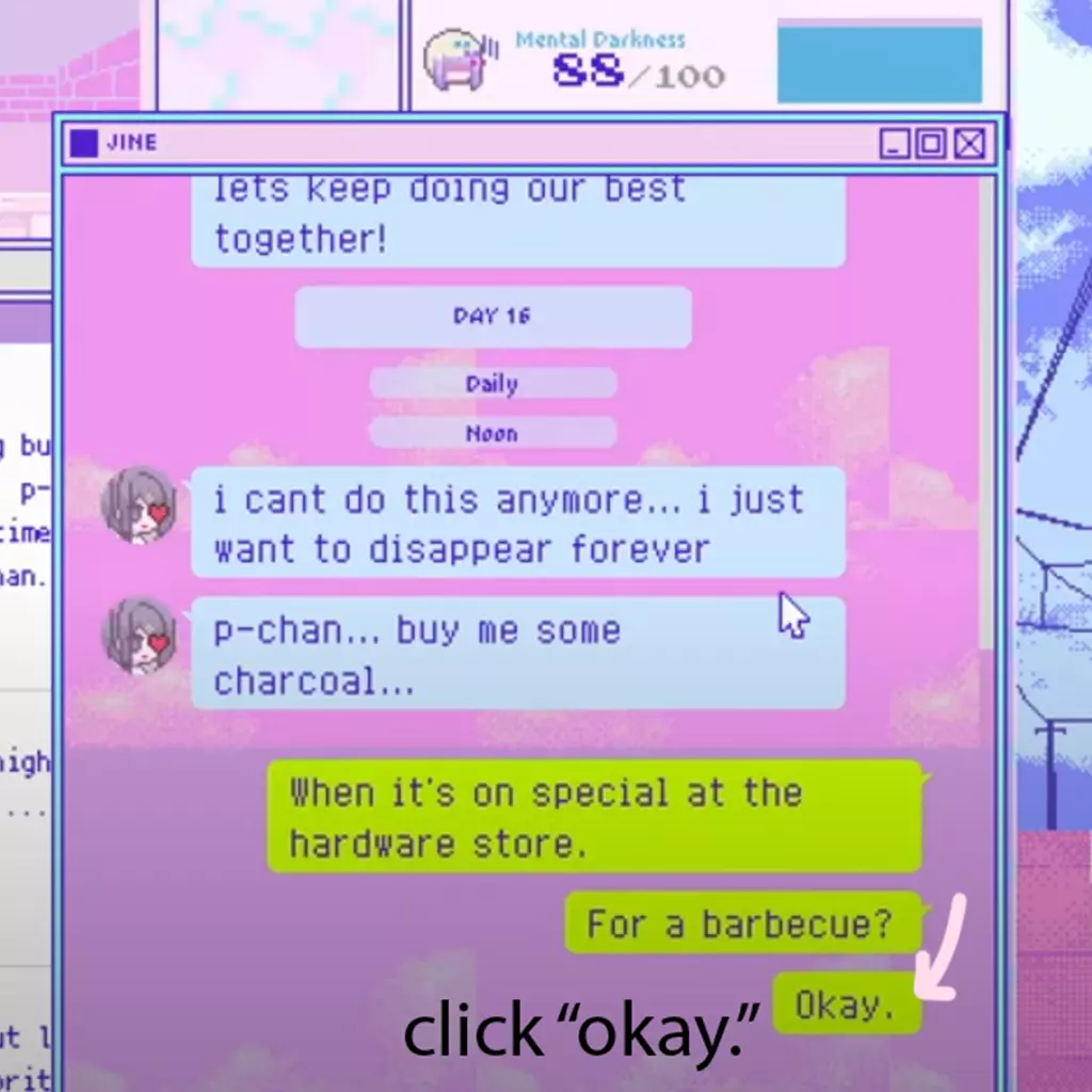 “请只服用推荐的网络剂量。” 当第25天时,雨的压力值达到120且精神黑暗度超过80时,会触发此结局。 由于该结局可能会在第25天前与“轰炸机女孩”结局重叠,因此完成起来可能更困难。 结局 - 炽热地狱