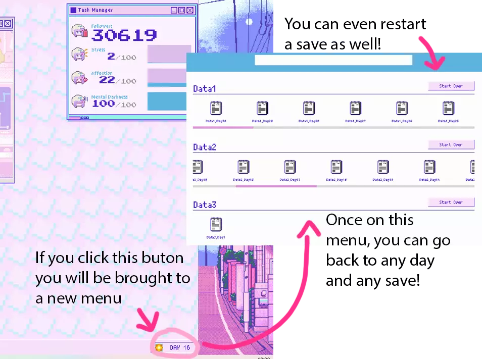 “我们的世界快乐而平凡,再也没有愤怒。” 你必须坚持到第30天,拥有50万至100万粉丝。触发此结局需要阿梅的好感度高于80。 结局 - 【(不)幸福结局世界】 “我是超级巨星,有大大的房子和大大的车!我是超级巨星而且……其实我并不在乎。” 达成此结局需要你拥有超过100万粉丝,阿梅的好感度高于80,且她的精神黑暗值低于80。 里程碑部分中说明了达成100万粉丝的简易指南。 结局 - 【幸福结局世界】