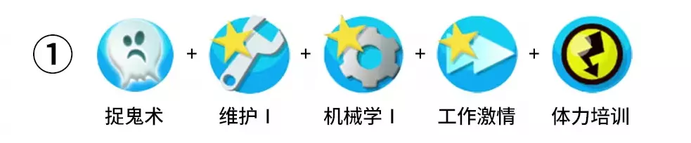 前期经费不足时,多以组合搭配技能为主;后期经费充足时,多以专精深造技能为主。 2. 专职维修勤杂工:达到5级维修技能,专门负责维修和救火工作。 3. 专职升级勤杂工: - 方案一:达到5级机械学技能,专门负责升级和救火工作。 - 方案二:达到3级机械学、1级工作激情、1级体力培训技能,专门负责升级和救火工作,同时兼顾日常工作。 4. 抓鬼勤杂工:具备抓鬼、工作激情、体力培训技能,专职负责日常工作(不承担维修和升级任务)。