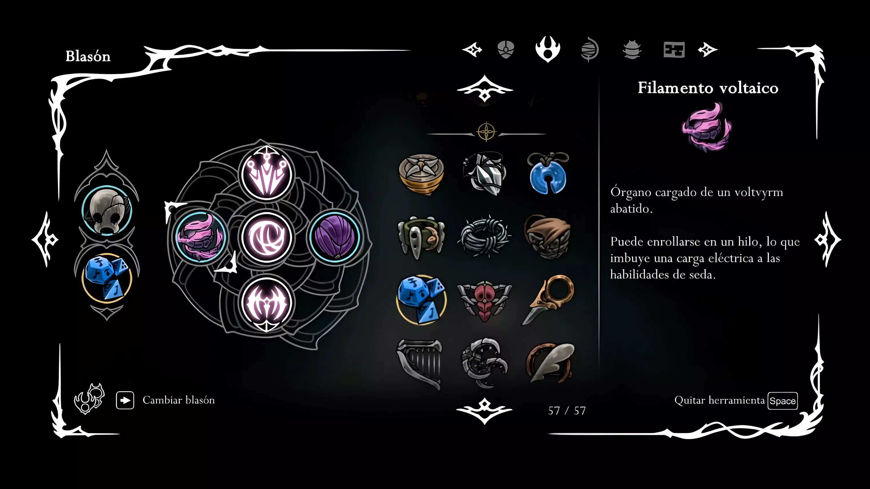 《空洞骑士:丝绸之歌》全工具获取方法(包含成就Arsenal) 本指南包含每种工具的确切位置、获取方法和详细步骤。 注意:如果您要查找特定内容,请使用浏览器的Ctrl+F快速搜索。 致谢 希望本指南对您有所帮助,感谢Arazore提供指南的封面图。 工具介绍 本指南中的工具顺序基于它们在游戏 inventory 中的显示顺序(与获取顺序无关),并按工具类型分类。