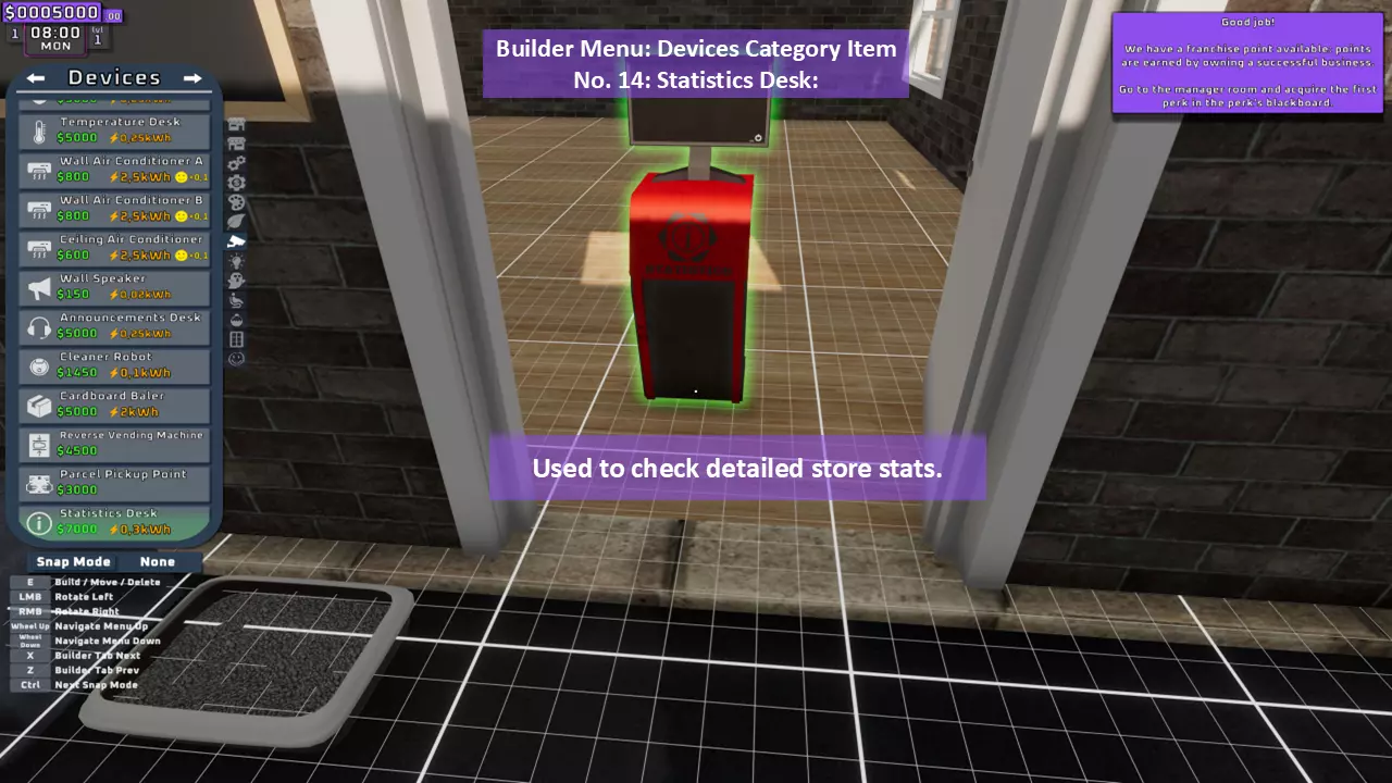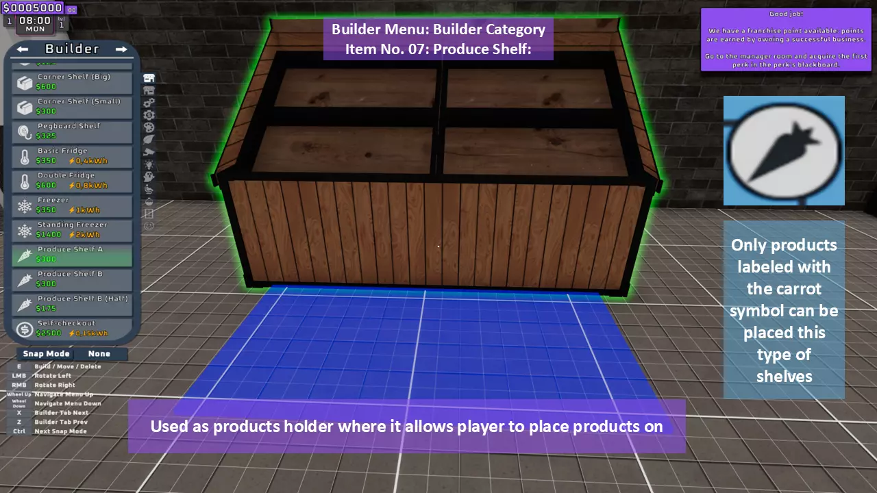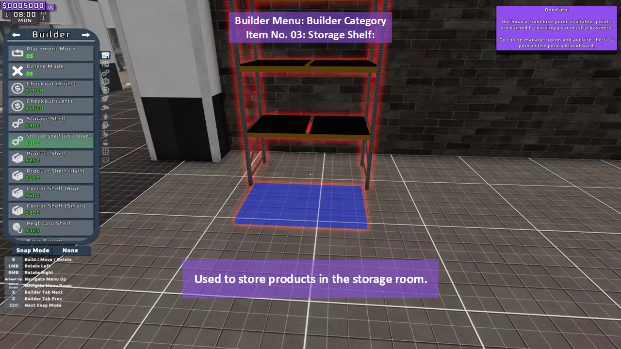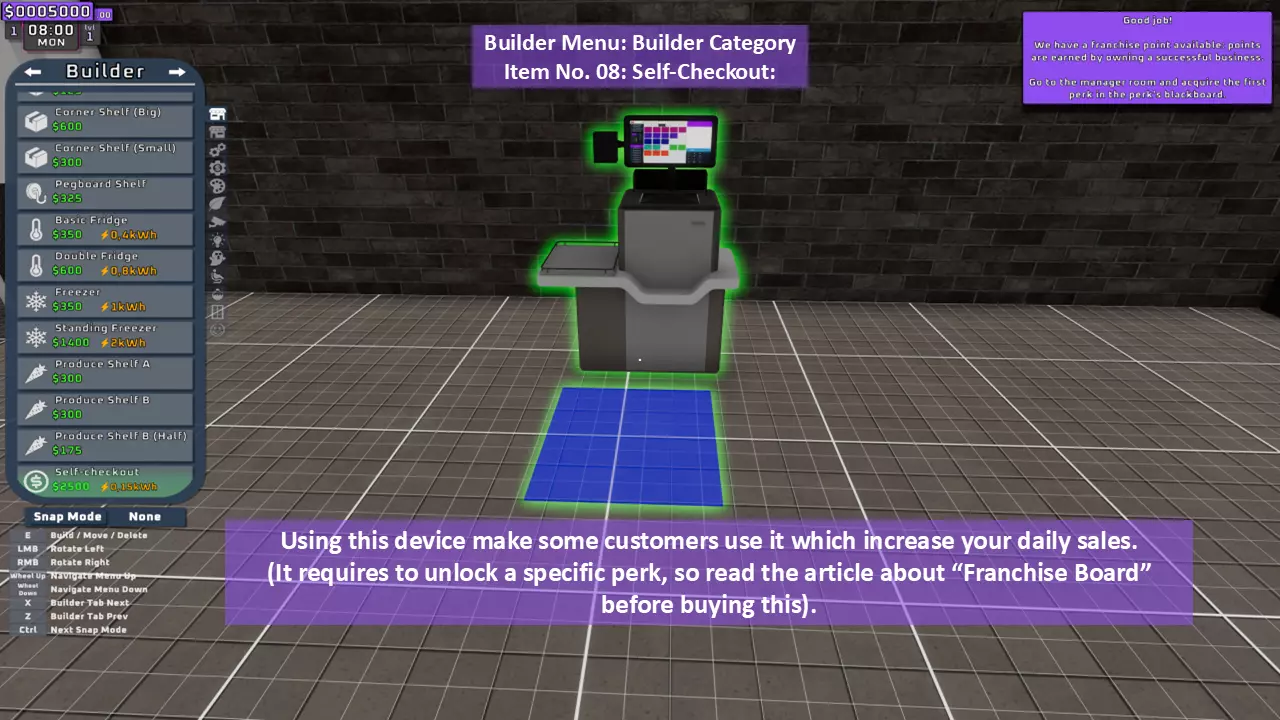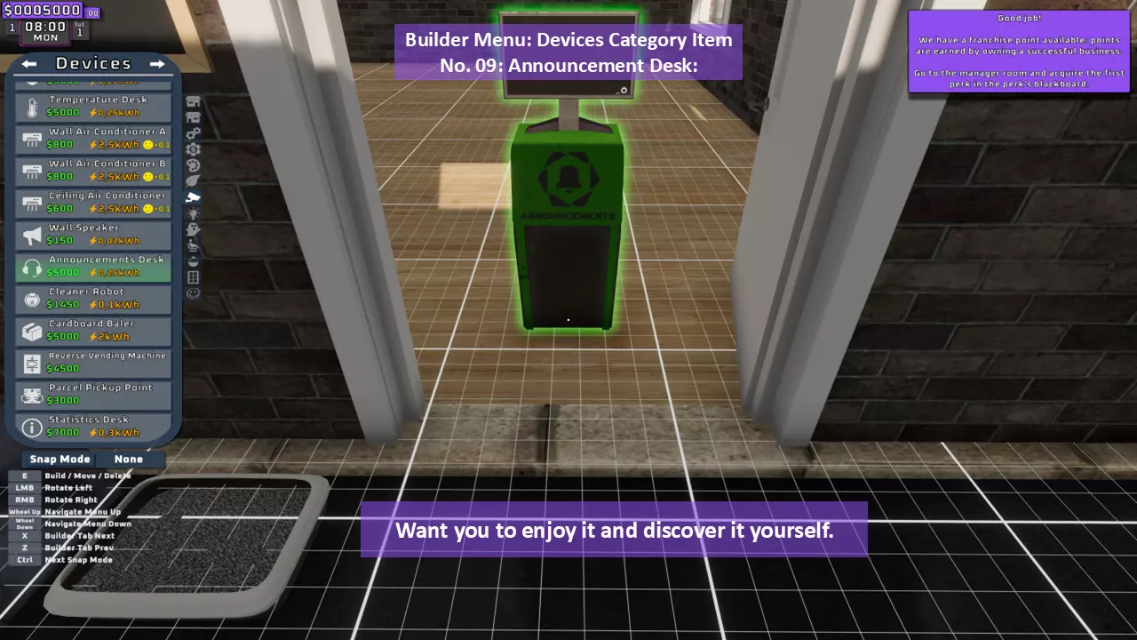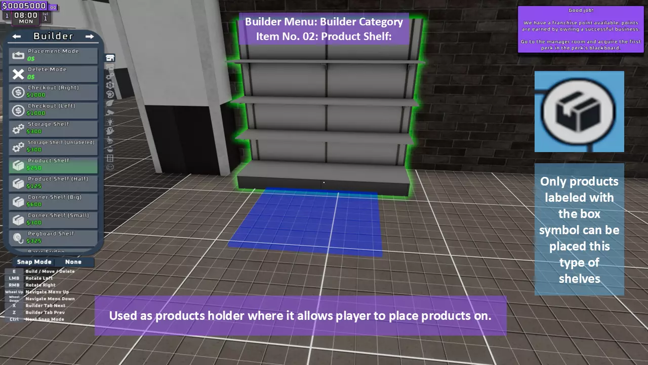 当最后一位顾客走出店门后,你可以关闭店铺,但记得在关门前需要完成以下事项: 1. 检查货架上的商品,必要时进行补货。 2. 若商品缺货,需在周四前的任意一天订购产品。 D. 新产品福利及补货提示 请仔细阅读以下注意事项: 1. 市场价格在每周四变动,因此最好在周三22:30关店前订购产品。 2. 努力完成 franchise board( franchise 点数)任务,以获得需要10点 franchise 点数的特殊福利【加速工人移动(若分配至仓储-补货岗位)的时钟】。获取新产品将推动升级和赚取积分的进程。 4. 务必致力于获取需要7个 franchise points的自动定价功能特权。 5. 在余额超过100万并备份前一天存档之前,不要破坏支柱和横梁。 建造者菜单