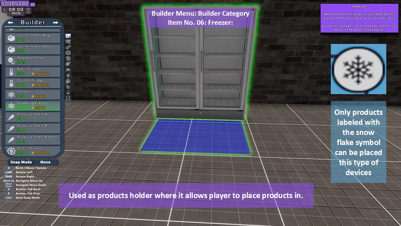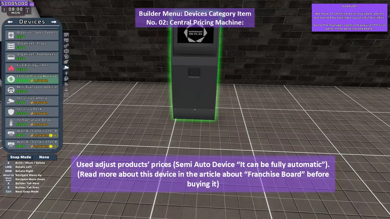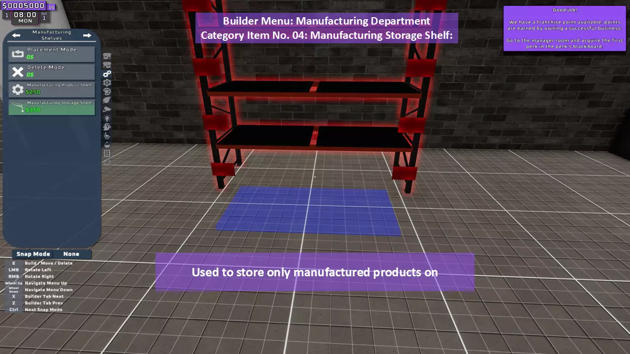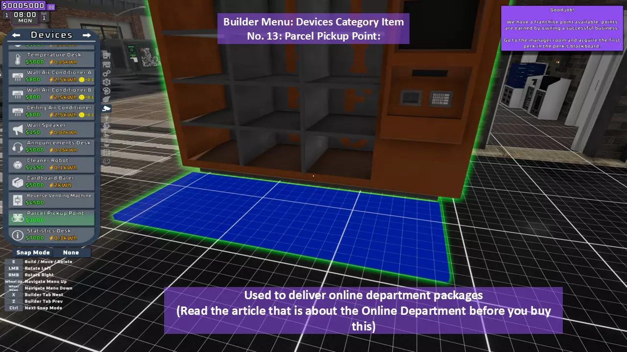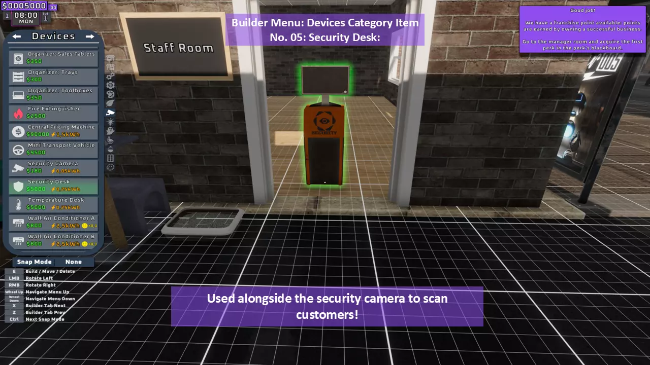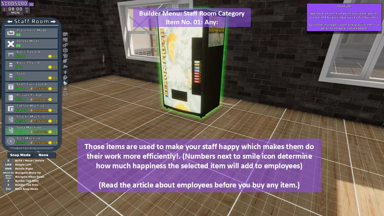 当最后一位顾客走出店门后,你可以关闭店铺,但记得在关门前需要完成以下事项: 1. 检查货架上的商品,必要时进行补货。 2. 若商品缺货,需在周四前的任意一天订购产品。 D. 新产品福利及补货提示 请仔细阅读以下注意事项: 1. 市场价格在每周四变动,因此最好在周三22:30关店前订购产品。 2. 努力完成 franchise board( franchise 点数)任务,以获得需要10点 franchise 点数的特殊福利【加速工人移动(若分配至仓储-补货岗位)的时钟】。获取新产品将推动升级和赚取积分的进程。 4. 务必致力于获取需要7个 franchise points的自动定价功能特权。 5. 在余额超过100万并备份前一天存档之前,不要破坏支柱和横梁。 建造者菜单
