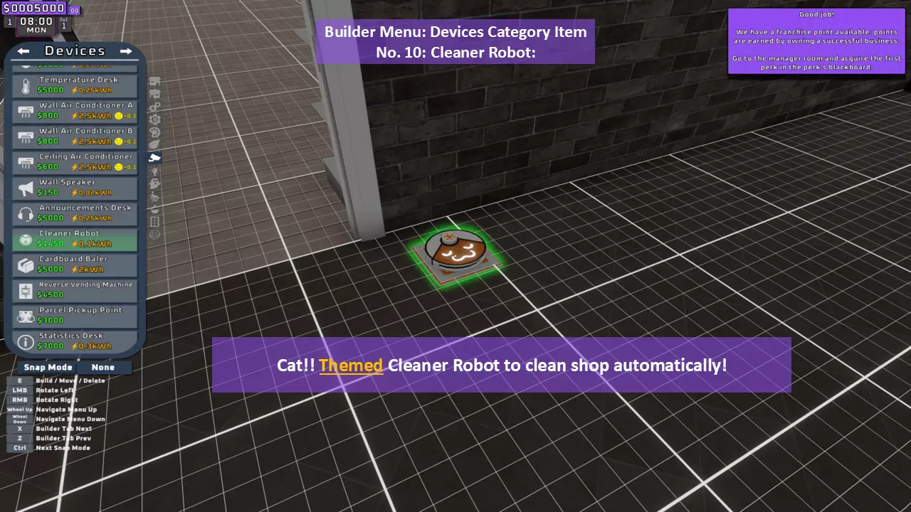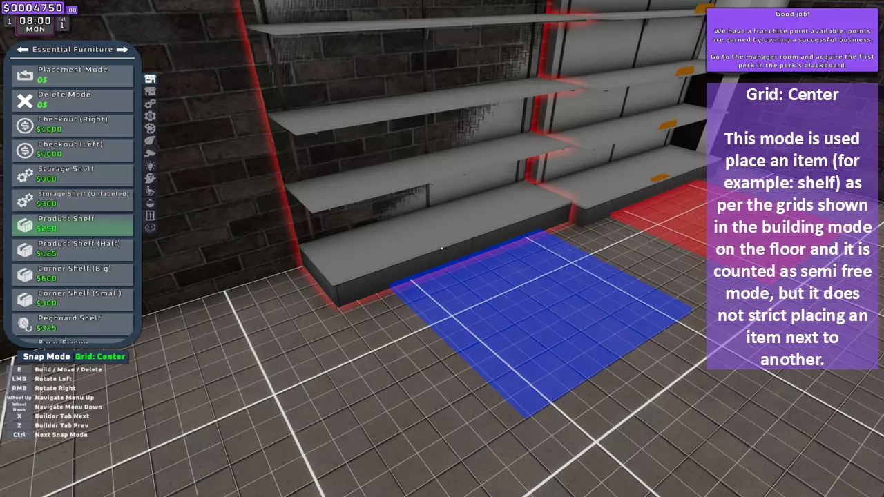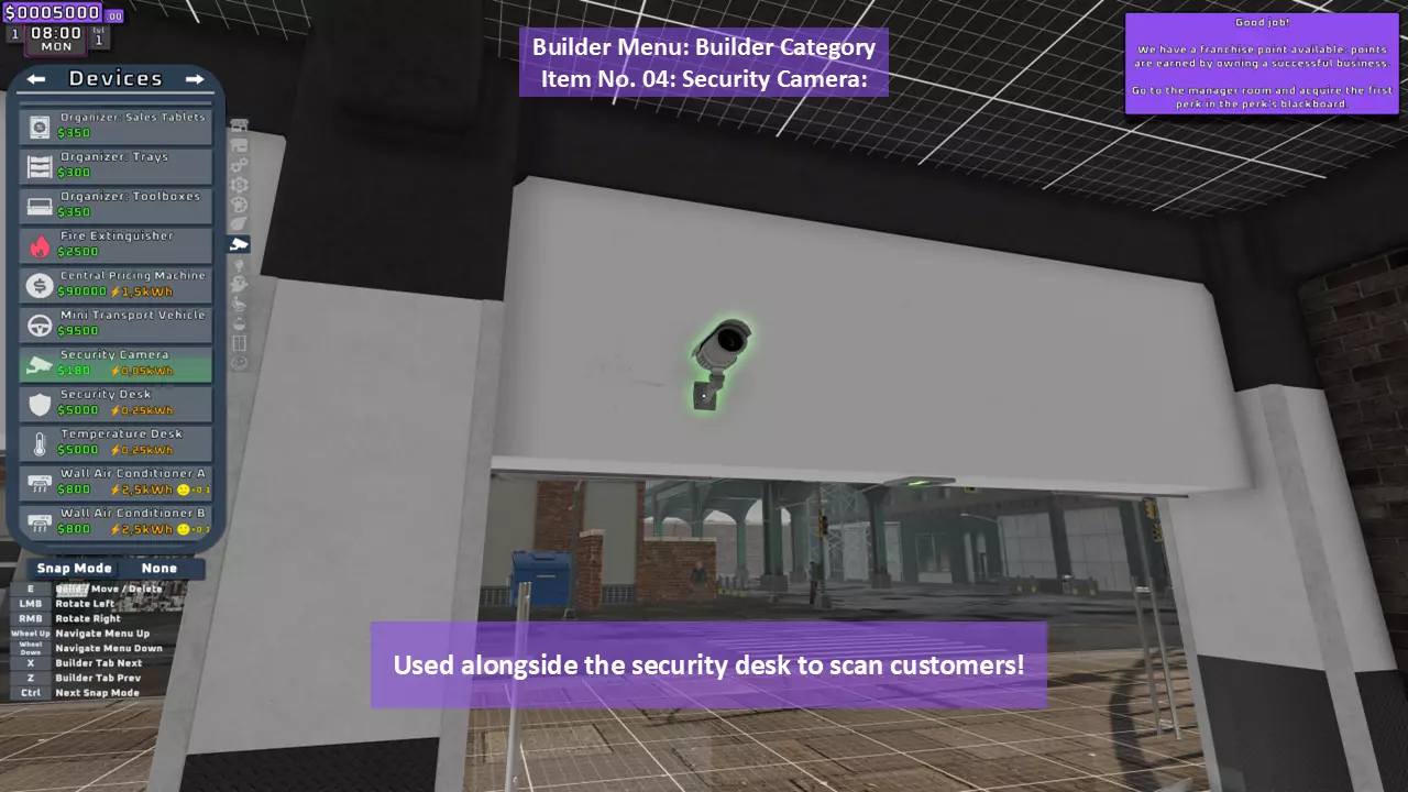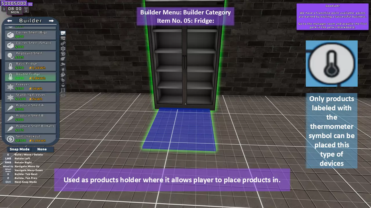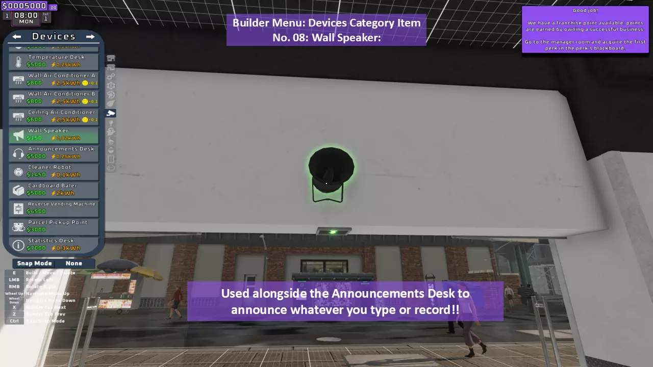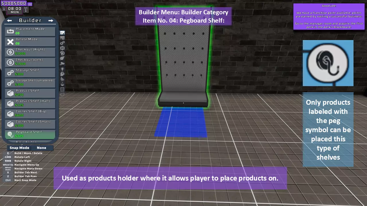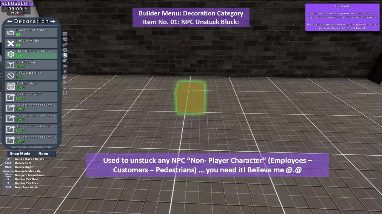 当最后一位顾客走出店门后,你可以关闭店铺,但记得在关门前需要完成以下事项: 1. 检查货架上的商品,必要时进行补货。 2. 若商品缺货,需在周四前的任意一天订购产品。 D. 新产品福利及补货提示 请仔细阅读以下注意事项: 1. 市场价格在每周四变动,因此最好在周三22:30关店前订购产品。 2. 努力完成 franchise board( franchise 点数)任务,以获得需要10点 franchise 点数的特殊福利【加速工人移动(若分配至仓储-补货岗位)的时钟】。获取新产品将推动升级和赚取积分的进程。 4. 务必致力于获取需要7个 franchise points的自动定价功能特权。 5. 在余额超过100万并备份前一天存档之前,不要破坏支柱和横梁。 建造者菜单