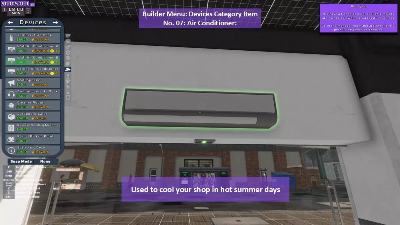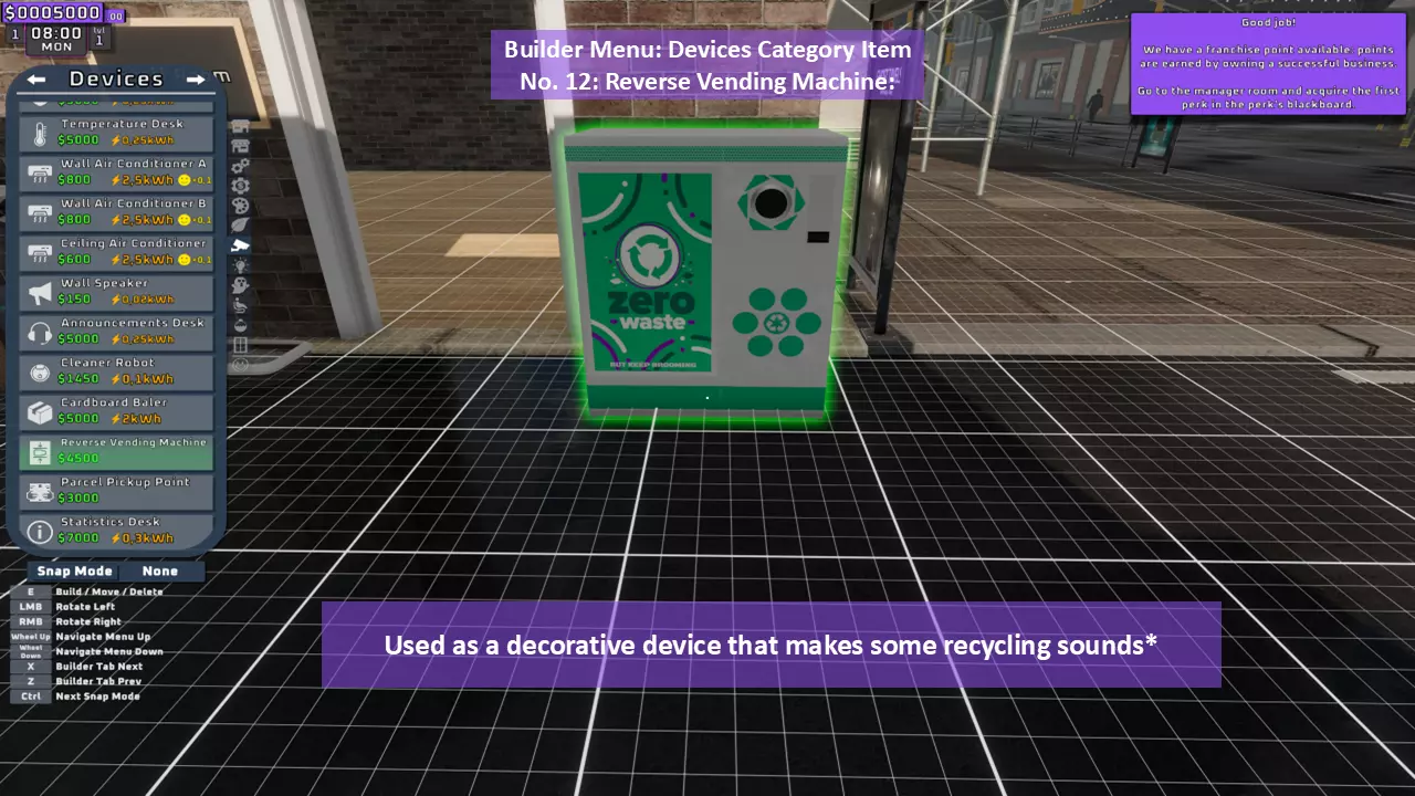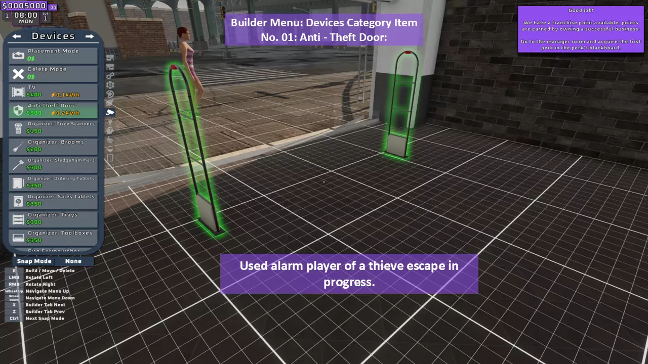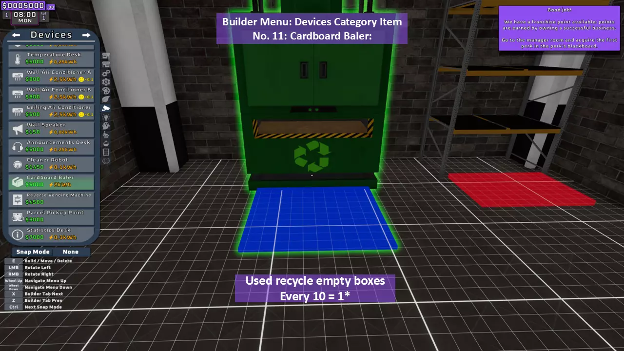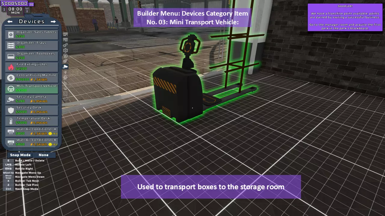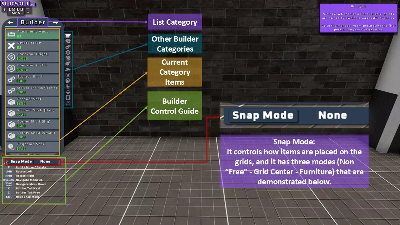 当最后一位顾客走出店门后,你可以关闭店铺,但记得在关门前需要完成以下事项: 1. 检查货架上的商品,必要时进行补货。 2. 若商品缺货,需在周四前的任意一天订购产品。 D. 新产品福利及补货提示 请仔细阅读以下注意事项: 1. 市场价格在每周四变动,因此最好在周三22:30关店前订购产品。 2. 努力完成 franchise board( franchise 点数)任务,以获得需要10点 franchise 点数的特殊福利【加速工人移动(若分配至仓储-补货岗位)的时钟】。获取新产品将推动升级和赚取积分的进程。 4. 务必致力于获取需要7个 franchise points的自动定价功能特权。 5. 在余额超过100万并备份前一天存档之前,不要破坏支柱和横梁。 建造者菜单