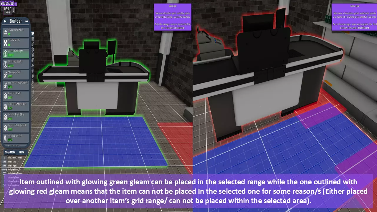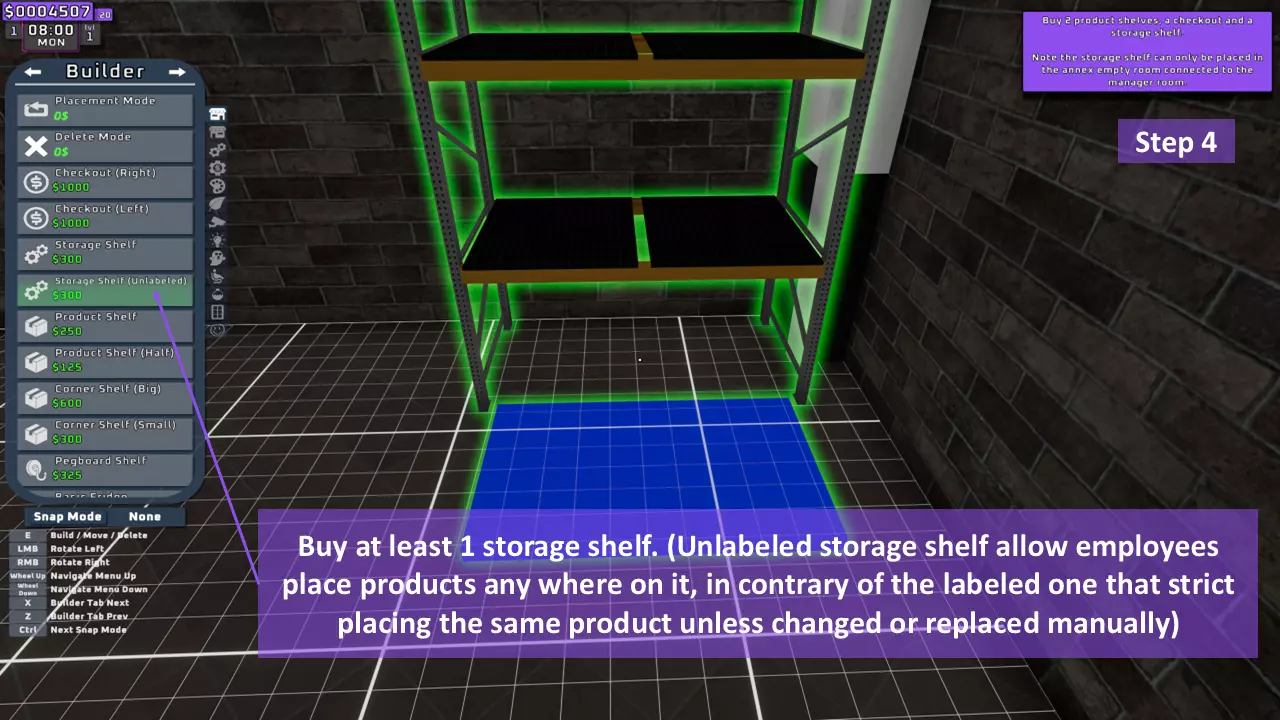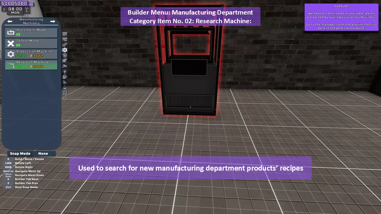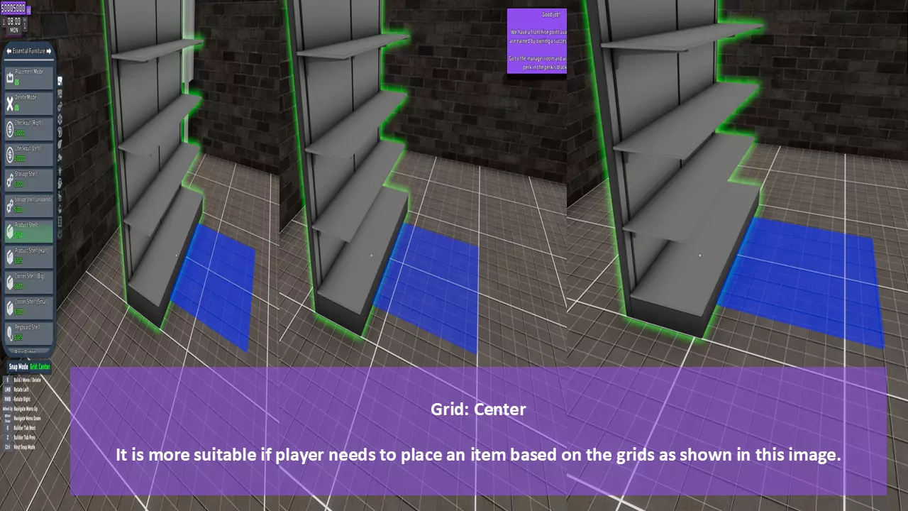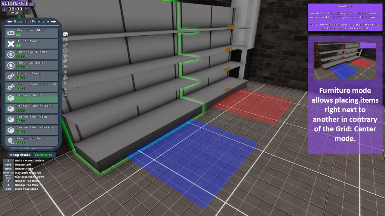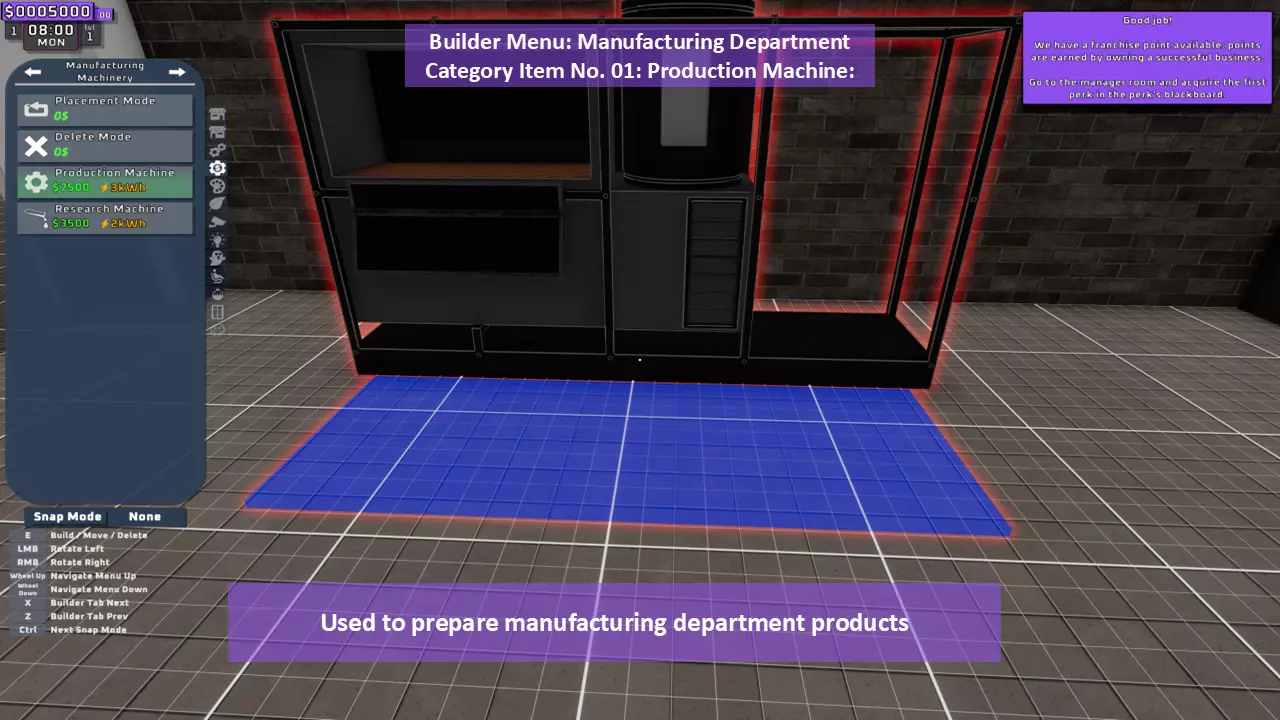 当最后一位顾客走出店门后,你可以关闭店铺,但记得在关门前需要完成以下事项: 1. 检查货架上的商品,必要时进行补货。 2. 若商品缺货,需在周四前的任意一天订购产品。 D. 新产品福利及补货提示 请仔细阅读以下注意事项: 1. 市场价格在每周四变动,因此最好在周三22:30关店前订购产品。 2. 努力完成 franchise board( franchise 点数)任务,以获得需要10点 franchise 点数的特殊福利【加速工人移动(若分配至仓储-补货岗位)的时钟】。获取新产品将推动升级和赚取积分的进程。 4. 务必致力于获取需要7个 franchise points的自动定价功能特权。 5. 在余额超过100万并备份前一天存档之前,不要破坏支柱和横梁。 建造者菜单