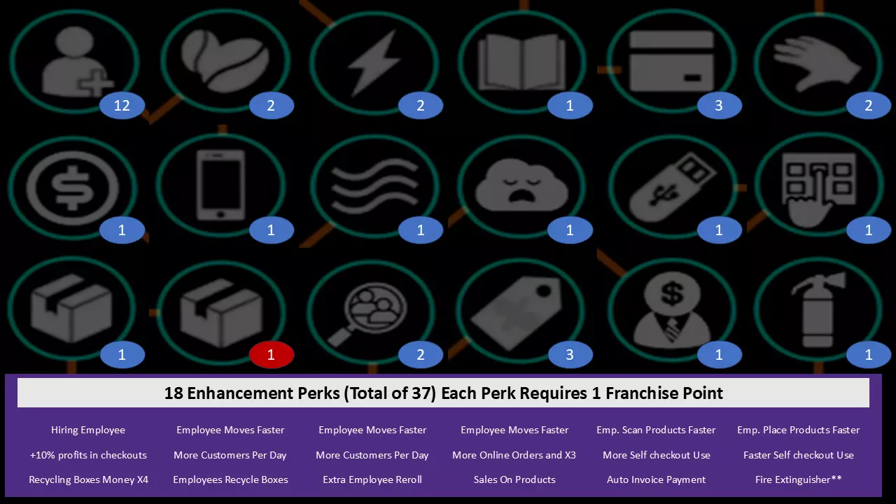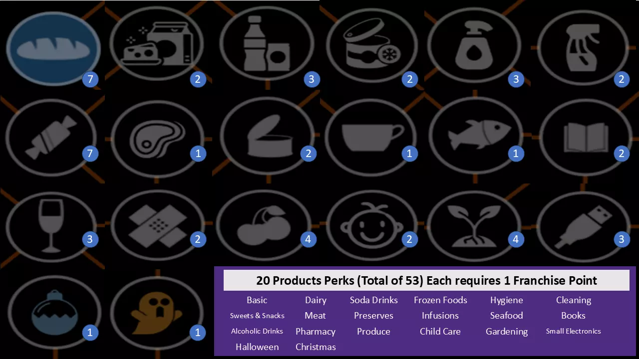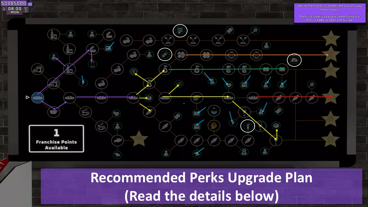 1. 紫色箭头: 从基础产品I perk开始,逐步解锁到WIFI perk。若有剩余点数,再解锁员工I perk。接着依次解锁基础产品II、III和IV。 2. 黄色箭头: 解锁回收资金x4(箱子图标),然后解锁卫生I。之后解锁糖果零食I,接着解锁基础产品VI以获取所有酒精饮料perk,再返回解锁允许员工回收箱子的perk,最后解锁空调perk。 3. 绿色箭头: 从卫生II开始,逐步解锁到书籍II。 4. 红色箭头: 此时已可解锁加速时间的时钟perk,朝着时钟perk前进,并保留点数直至其解锁。橙色箭头: 在此处,你可以从【药店I】开始解锁自动定价软件的路径,一直到需要7个 franchise points( franchise points)的技能。 6. 蓝色箭头: 在朝着时钟和自动定价软件前进的同时,你需要解锁这些技能。 7. 白色圆圈: 解锁自助结账技能可以节省你的时间,因为它允许顾客自行使用,这确实有助于增加金钱收入。 云技能在解锁在线部门后才会有帮助,所以在你的在线部门准备好之前不要解锁该技能(解锁前请阅读在线部门相关部分)。 灭火器仅用于解锁特定成就,不过用它对付顾客确实很有趣。员工:即将推出…… 店铺布局与扩张计划:即将推出…… 线上部门:即将推出…… 制造部门:即将推出…… 产品: 通用提示:即将推出…… 成就:即将推出……
