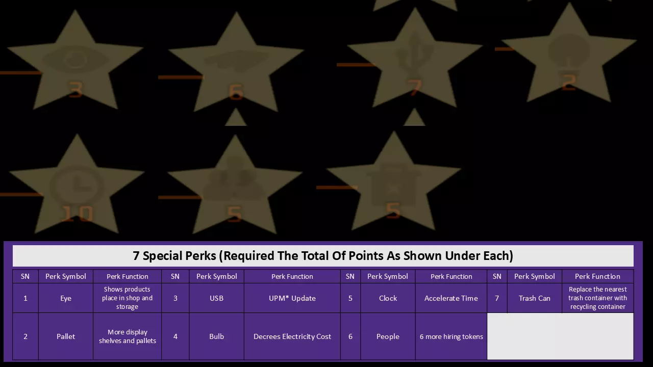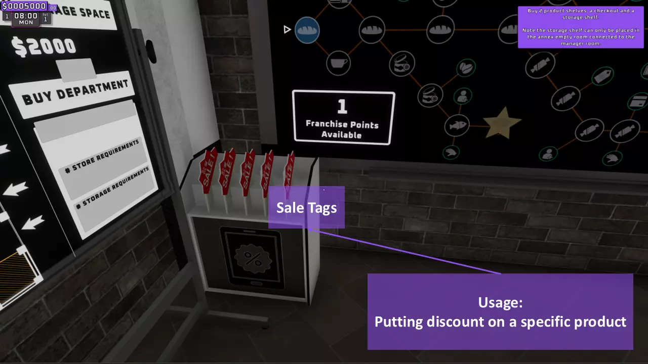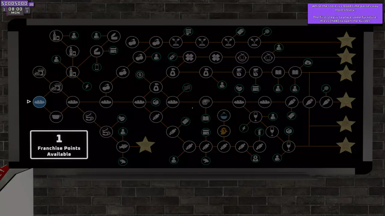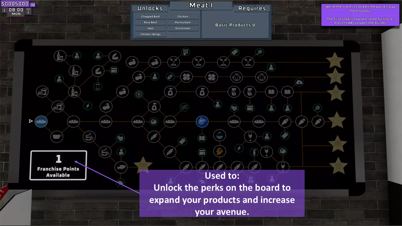 1. 紫色箭头: 从基础产品I perk开始,逐步解锁到WIFI perk。若有剩余点数,再解锁员工I perk。接着依次解锁基础产品II、III和IV。 2. 黄色箭头: 解锁回收资金x4(箱子图标),然后解锁卫生I。之后解锁糖果零食I,接着解锁基础产品VI以获取所有酒精饮料perk,再返回解锁允许员工回收箱子的perk,最后解锁空调perk。 3. 绿色箭头: 从卫生II开始,逐步解锁到书籍II。 4. 红色箭头: 此时已可解锁加速时间的时钟perk,朝着时钟perk前进,并保留点数直至其解锁。橙色箭头: 在此处,你可以从【药店I】开始解锁自动定价软件的路径,一直到需要7个 franchise points( franchise points)的技能。 6. 蓝色箭头: 在朝着时钟和自动定价软件前进的同时,你需要解锁这些技能。 7. 白色圆圈: 解锁自助结账技能可以节省你的时间,因为它允许顾客自行使用,这确实有助于增加金钱收入。 云技能在解锁在线部门后才会有帮助,所以在你的在线部门准备好之前不要解锁该技能(解锁前请阅读在线部门相关部分)。 灭火器仅用于解锁特定成就,不过用它对付顾客确实很有趣。员工:即将推出…… 店铺布局与扩张计划:即将推出…… 线上部门:即将推出…… 制造部门:即将推出…… 产品: 通用提示:即将推出…… 成就:即将推出……