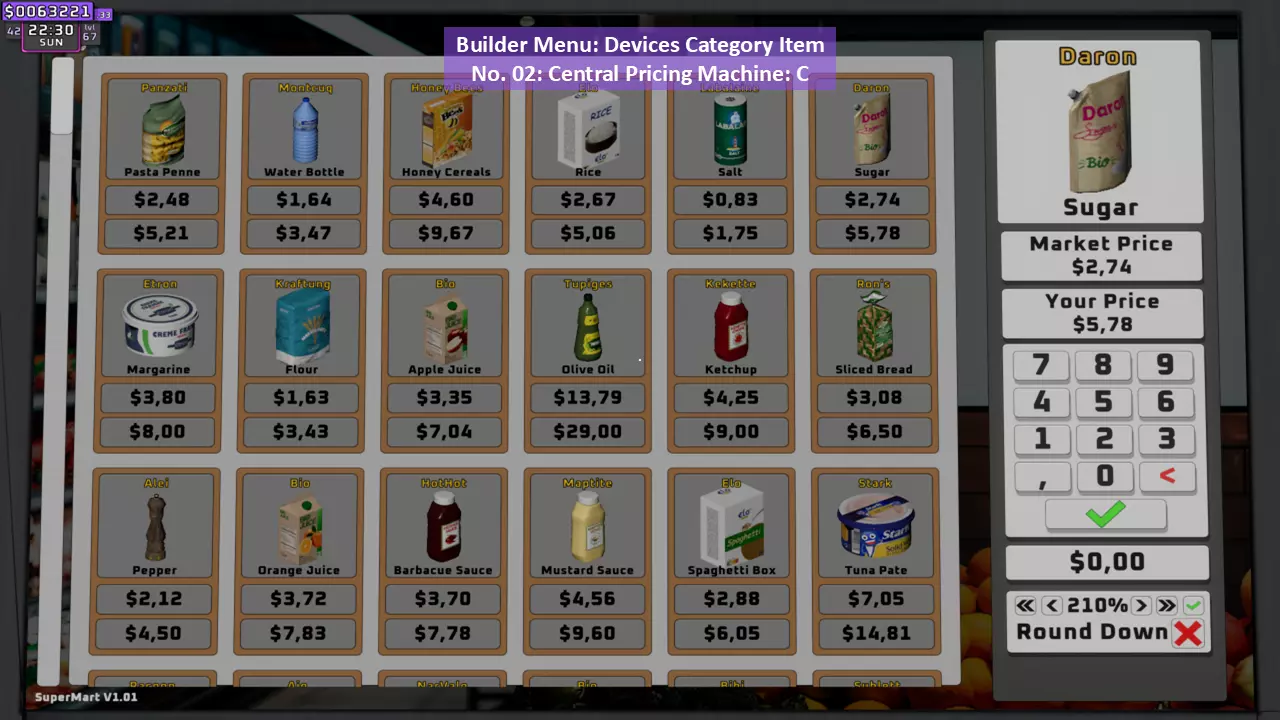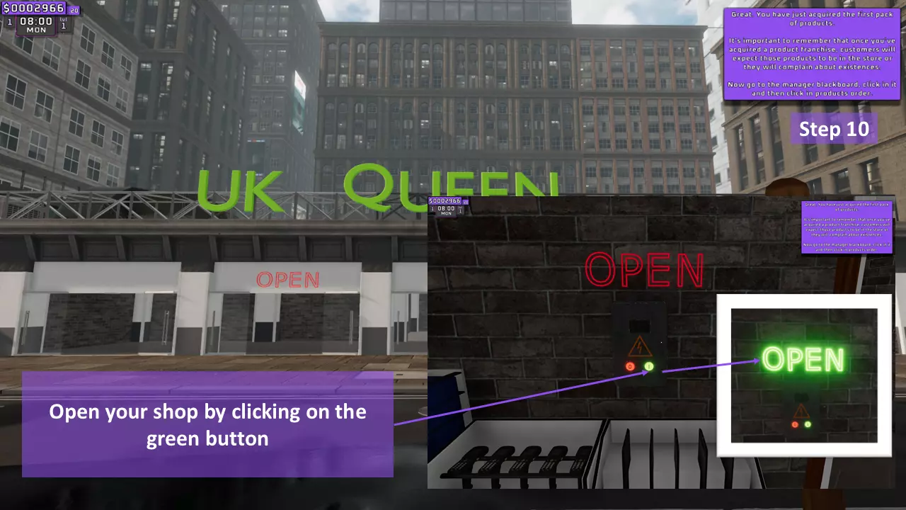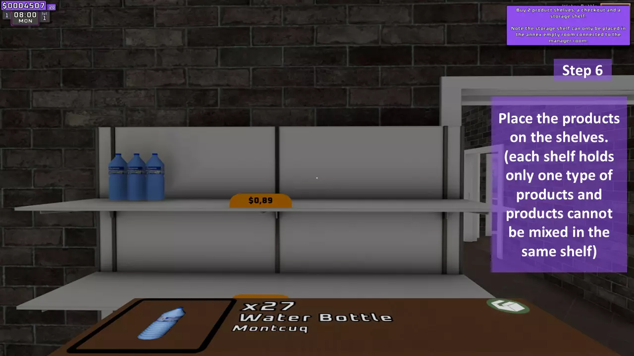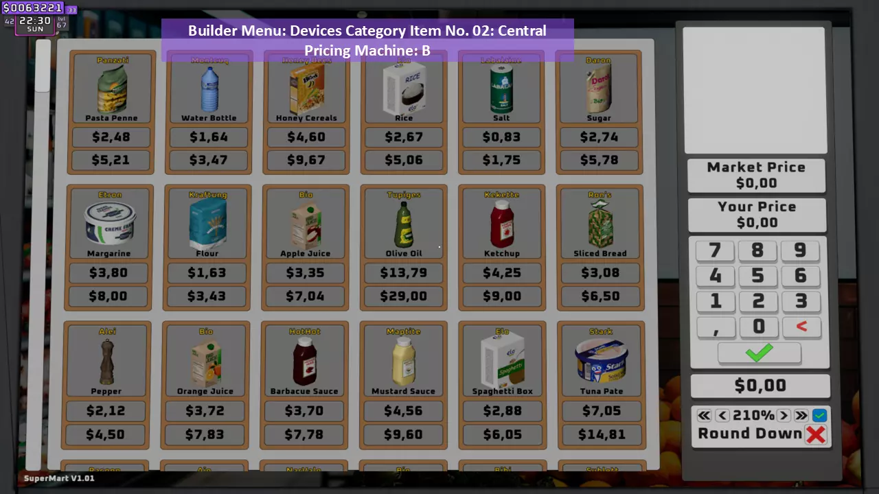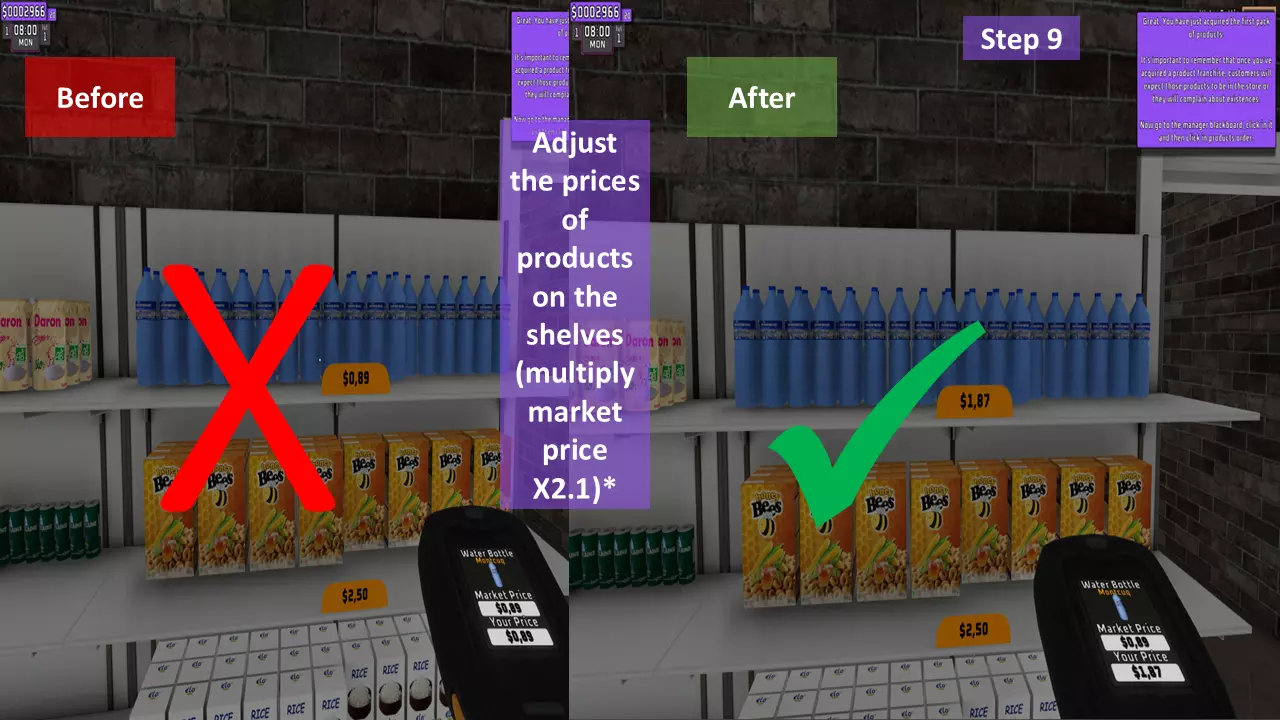 调整每个货架上所有商品的价格(只需使用键盘上的数字,记住输入小数时需用点作为小数点分隔符)。如果已调整价格的商品被放置到另一个货架,其价格会自动更改,无需重新调整。个人建议将市场价乘以2.1倍后向上取整,以获得最大收益。 示例: 水瓶价格=0.45美元 计算如下: 0.45×2.1=0.945 向上取整=0.95 因此,将价格调整为0.95美元。 第10步(共11步):启动!