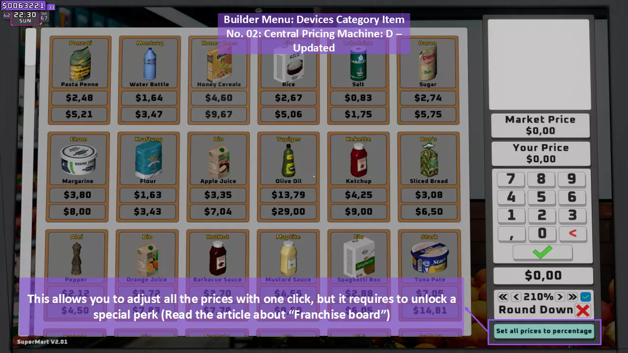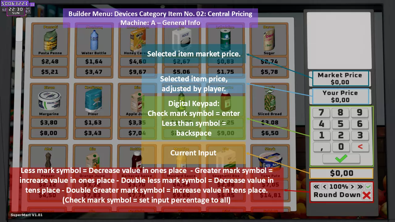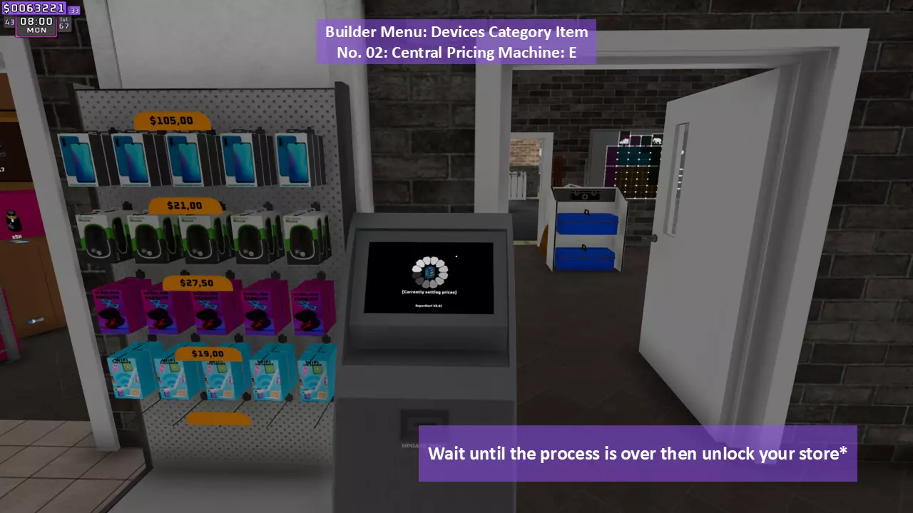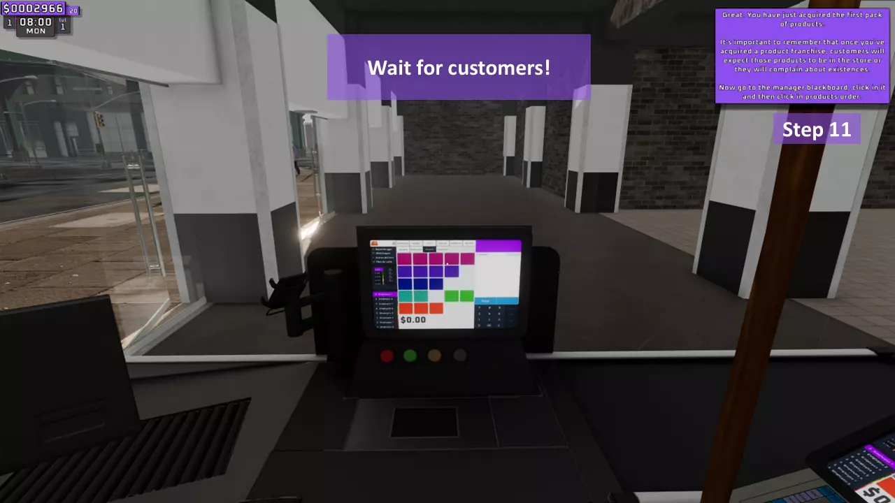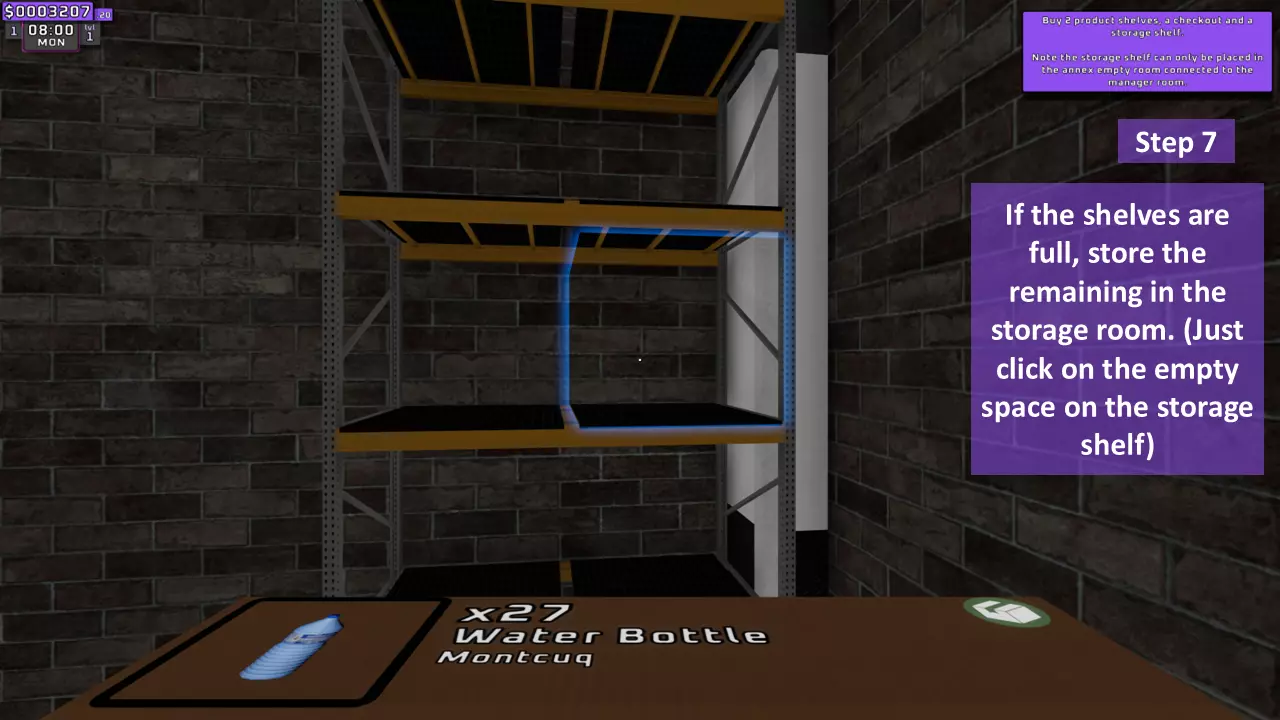 调整每个货架上所有商品的价格(只需使用键盘上的数字,记住输入小数时需用点作为小数点分隔符)。如果已调整价格的商品被放置到另一个货架,其价格会自动更改,无需重新调整。个人建议将市场价乘以2.1倍后向上取整,以获得最大收益。 示例: 水瓶价格=0.45美元 计算如下: 0.45×2.1=0.945 向上取整=0.95 因此,将价格调整为0.95美元。 第10步(共11步):启动!
